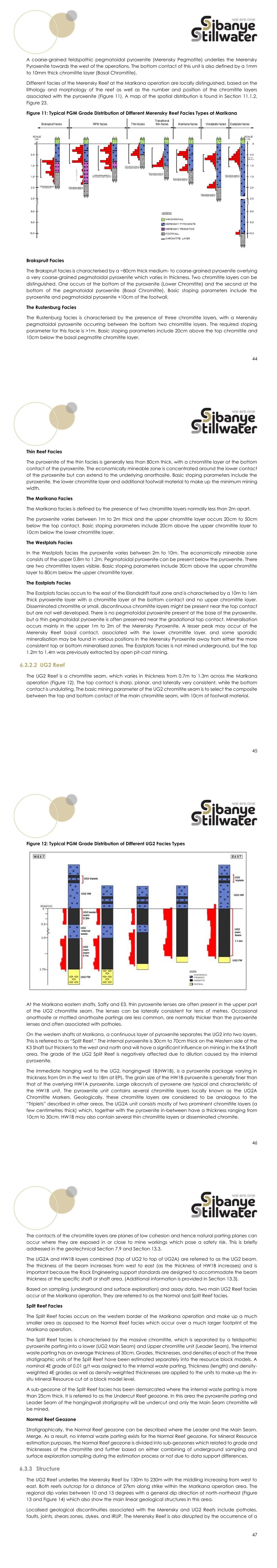 40 Figure 8: Geology of the Western Limb of the Bushveld Complex, South Africa From the bottom of the sequence to the top (Figure 9), these zones are the 1) Marginal Zone, 2) ultramafic-rich Lower Zone, 3) mafic-rich Critical Zone which hosts multiple chromitite and PGM layers, 4) a mafic-rich Main Zone consisting mostly of gabbro-norites and norites, 5) and the final Upper Zone derived from the crystallisation of iron-rich residual fluids. The RLS varies in vertical thickness, reaching up to 8km in places with some individual layers traceable for over 150km. However, the PGM-bearing reefs varies between 0.3m to 15m thick, although much greater thicknesses are recorded in the Platreef of the Northern Limb. In the Eastern and Western Limbs, the Critical Zone contains the two principal PGM-bearing reefs: the Merensky Reef and the UG2 Reef. Mineral Resources and Mineral Reserves are reported for both the Merensky and UG2 Reefs which are the primary PGM and base metal sources mined at the operations. 41 Figure 9: General Stratigraphic Column of the Rustenburg Layered Suite 6.2 Deposit Types PGM reef-type deposits are predominantly magmatic Ni-Cu-PGM systems hosted by large layered mafic-ultramafic intrusions. In these deposits, platinum group metals are the principal economic products, while nickel, copper, cobalt and chromium are commonly by-products. They generally contain low sulphide contents and occur as laterally persistent stratiform horizons or “reefs” that can be traced once intersected. Their formation is linked to mantle-derived magma that intrudes the crust, undergoes contamination and cooling, and reaches sulphur saturation, allowing immiscible sulphide liquids to concentrate Ni, Cu and PGMs within mafic to ultramafic host rocks. The Bushveld Complex, the Stillwater Complex, the Great Dyke are classic examples of layered intrusion- hosted PGM mineralisation. The Bushveld Complex remains the most significant global example, with the Merensky and UG2 Reefs in the Critical Zone hosting the world’s largest platinum and chromite resources. At Stillwater, the economically important J-M Reef occurs in the Lower Banded Series as a relatively continuous olivine-rich horizon that extends for about 36km and averages roughly 2m in thickness. In Zimbabwe’s Great Dyke, economic mineralisation is concentrated mainly in the Main Sulphide Zone, with the Lower Sulphide Zone representing a thicker but lower-grade unit. 42 Norilsk and Sudbury illustrate important variations on the broader Ni-Cu-PGM theme. In the Norilsk Province, mineralisation is associated with layered ultramafic intrusions emplaced within a large volcanic sequence, but the ores are more variable than the reef-style deposits, ranging from massive to disseminated sulphides. The massive sulphide bodies are the most economic and are notable for high nickel content and strong palladium enrichment. Sudbury is distinct because it is impact-related rather than a conventional layered intrusion; mineralisation occurs in contact zones, footwall breccias and radial dykes around the impact structure, and mining is directed primarily at nickel and copper with PGMs recovered as by-products. Taken together, these deposits demonstrate that Ni-Cu-PGM mineralisation is overwhelmingly associated with mafic-ultramafic magmatism, although the geometry, continuity, grade distribution and economic drivers differ between districts. The Bushveld, Stillwater, and the Great Dyke are dominated by stratiform reef-style mineralisation with relatively predictable continuity, whereas Norilsk and Sudbury contain more variable ore morphologies and stronger base-metal characteristics. This comparison provides a concise framework for understanding the principal geological controls on the world’s major Ni-Cu-PGM deposit types. 6.3 Local and Property Geology 6.3.1 Stratigraphy The recognised stratigraphy underlying the Marikana operation comprises the Main and Critical Zones of the RLS. The stratigraphy of the RLS as formalised by the South African Committee for Stratigraphy (SACS, 1980) is used in this report. The Main Zone predominantly comprises gabbro–norite and norite rock types, whereas, in the Upper Critical Zone, pyroxenite, norite, anorthosite, and chromitite lithologies are found. The Upper Critical Zone stratigraphy of the RLS, which contains the units of economic interest, the Merensky and UG2 Reefs, comprises well-developed cyclic units divided into six sub-units as follows (Figure 10): • Bastard Pyroxenite • Merensky Reef • Merensky Footwall • UG2 Hangingwall • UG2 Chromitite Layer/Reef • UG1 Chromitite Layer Section 6.3.3, Figure 14 shows the dip cross-section through the reefs. In the Marikana operation, there are local variations in the thicknesses of individual stratigraphic units. The Giant Poikilitic Anorthosite (GPA) generally defines the start of the Critical Zone, which normally occurs 5m to 10m above Bastard Pyroxenite and approximately 20m to 25m above Merensky Reef. The GPA is normally about 7m to 10m in thickness. 43 Figure 10: General Stratigraphic Column of the Local Geological Succession After Smith et al. 2004 6.3.2 The Mineralised Horizons 6.3.2.1 Merensky Reef The Merensky Reef varies in thickness and PGM mineralisation along dip and along strike across the Marikana operation. The pyroxenite thickens from ±0.3m in the west to greater than 15m in the east of the operation. The bottom contact of the Merensky Pyroxenite is defined by a laterally consistent and well-developed 5mm to 10mm thick chromitite layer (Lower Chromitite), which is almost always underlain by a 1cm to 3cm thick anorthosite layer. The lower contact of the Merensky Pyroxenite with the underlying anorthosite is sharp and dimpled (Farquhar, 1981) and cross-cutting the layering in the footwall where present. The top contact of the Merensky Pyroxenite may be sharp but is most often gradational over 10cm to 20cm into the overlying spotted anorthosi