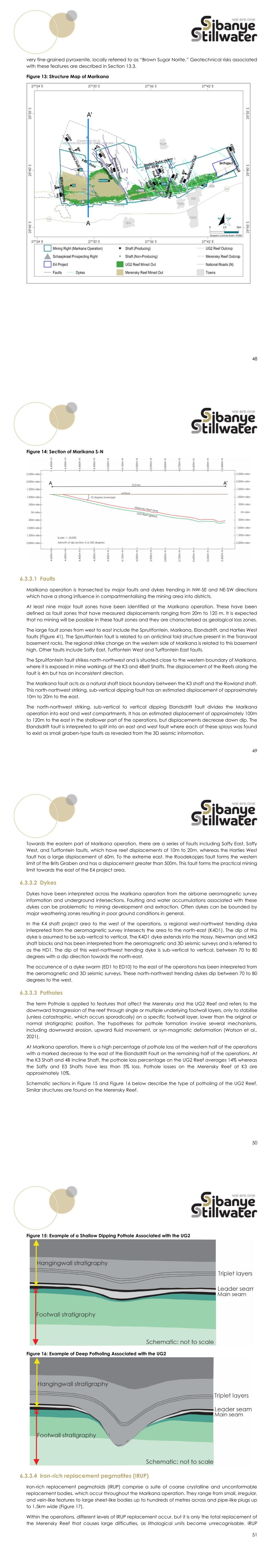 48 very fine-grained pyroxenite, locally referred to as “Brown Sugar Norite.” Geotechnical risks associated with these features are described in Section 13.3. Figure 13: Structure Map of Marikana 49 Figure 14: Section of Marikana S-N 6.3.3.1 Faults Marikana operation is transected by major faults and dykes trending in NW-SE and NE-SW directions which have a strong influence in compartmentalising the mining area into districts. At least nine major fault zones have been identified at the Marikana operation. These have been defined as fault zones that have measured displacements ranging from 20m to 120 m. It is expected that no mining will be possible in these fault zones and they are characterised as geological loss zones. The large fault zones from west to east include the Spruitfontein, Marikana, Elandsdrift, and Harties West faults (Figure 41). The Spruitfontein fault is related to an anticlinal fold structure present in the Transvaal basement rocks. The regional strike change on the western side of Marikana is related to this basement high. Other faults include Saffy East, Turffontein West and Turffontein East faults. The Spruitfontein fault strikes north-northwest and is situated close to the western boundary of Marikana, where it is exposed in mine workings at the K3 and 4Belt Shafts. The displacement of the Reefs along the fault is 4m but has an inconsistent direction. The Marikana fault acts as a natural shaft block boundary between the K3 shaft and the Rowland shaft. This north-northwest striking, sub-vertical dipping fault has an estimated displacement of approximately 10m to 20m to the east. The north-northwest striking, sub-vertical to vertical dipping Elandsdrift fault divides the Marikana operation into east and west compartments. It has an estimated displacement of approximately 100m to 120m to the east in the shallower part of the operations, but displacements decrease down dip. The Elandsdrift fault is interpreted to split into an east and west fault where each of these splays was found to exist as small graben-type faults as revealed from the 3D seismic information. 50 Towards the eastern part of Marikana operation, there are a series of faults including Saffy East, Saffy West, and Turffontein faults, which have reef displacements of 10m to 20m, whereas the Harties West fault has a large displacement of 60m. To the extreme east, the Roodekopjes fault forms the western limit of the Brits Graben and has a displacement greater than 500m. This fault forms the practical mining limit towards the east of the E4 project area. 6.3.3.2 Dykes Dykes have been interpreted across the Marikana operation from the airborne aeromagnetic survey information and underground intersections. Faulting and water accumulations associated with these dykes can be problematic to mining development and extraction. Often dykes can be bounded by major weathering zones resulting in poor ground conditions in general. In the K4 shaft project area to the west of the operations, a regional west-northwest trending dyke interpreted from the aeromagnetic survey intersects the area to the north-east (K4D1). The dip of this dyke is assumed to be sub-vertical to vertical. The K4D1 dyke extends into the Hossy, Newman and MK2 shaft blocks and has been interpreted from the aeromagnetic and 3D seismic surveys and is referred to as the HD1. The dip of this west-northwest trending dyke is sub-vertical to vertical, between 70 to 80 degrees with a dip direction towards the north-east. The occurrence of a dyke swarm (ED1 to ED10) to the east of the operations has been interpreted from the aeromagnetic and 3D seismic surveys. These north-northwest trending dykes dip between 70 to 80 degrees to the west. 6.3.3.3 Potholes The term Pothole is applied to features that affect the Merensky and the UG2 Reef and refers to the downward transgression of the reef through single or multiple underlying footwall layers, only to stabilise (unless catastrophic, which occurs sporadically) on a specific footwall layer, lower than the original or normal stratigraphic position. The hypotheses for pothole formation involve several mechanisms, including downward erosion, upward fluid movement, or syn-magmatic deformation (Watson et al., 2021). At Marikana operation, there is a high percentage of pothole loss at the western half of the operations with a marked decrease to the east of the Elandsdrift Fault on the remaining half of the operations. At the K3 Shaft and 4B Incline Shaft, the pothole loss percentage on the UG2 Reef averages 14% whereas the Saffy and E3 Shafts have less than 5% loss. Pothole losses on the Merensky Reef at K3 are approximately 10%. Schematic sections in Figure 15 and Figure 16 below describe the type of potholing of the UG2 Reef. Similar structures are found on the Merensky Reef. 51 Figure 15: Example of a Shallow Dipping Pothole Associated with the UG2 Figure 16: Example of Deep Potholing Associated with the UG2 6.3.3.4 Iron-rich replacement pegmatites (IRUP) Iron-rich replacement pegmatoids (IRUP) comprise a suite of coarse crystalline and unconformable replacement bodies, which occur throughout the Marikana operation. They range from small, irregular, and vein-like features to large sheet-like bodies up to hundreds of metres across and pipe-like plugs up to 1.5km wide (Figure 17). Within the operations, different levels of IRUP replacement occur, but it is only the total replacement of the Merensky Reef that causes large difficulties, as lithological units become unrecognisable. IRUP