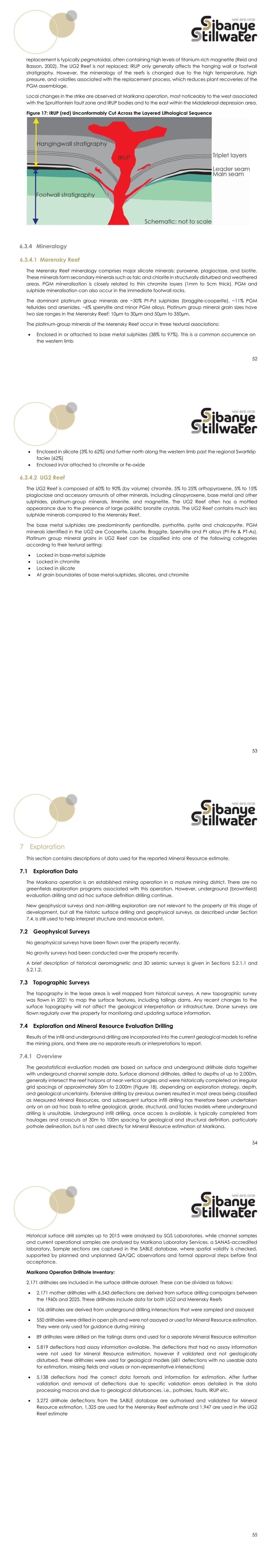 52 replacement is typically pegmatoidal, often containing high levels of titanium-rich magnetite (Reid and Basson, 2002). The UG2 Reef is not replaced; IRUP only generally affects the hanging wall or footwall stratigraphy. However, the mineralogy of the reefs is changed due to the high temperature, high pressure, and volatiles associated with the replacement process, which reduces plant recoveries of the PGM assemblage. Local changes in the strike are observed at Marikana operation, most noticeably to the west associated with the Spruitfontein fault zone and IRUP bodies and to the east within the Middelkraal depression area. Figure 17: IRUP (red) Unconformably Cut Across the Layered Lithological Sequence 6.3.4 Mineralogy 6.3.4.1 Merensky Reef The Merensky Reef mineralogy comprises major silicate minerals: pyroxene, plagioclase, and biotite. These minerals form secondary minerals such as talc and chlorite in structurally disturbed and weathered areas. PGM mineralisation is closely related to thin chromite layers (1mm to 5cm thick). PGM and sulphide mineralisation can also occur in the immediate footwall rocks. The dominant platinum group minerals are ~30% Pt-Pd sulphides (braggite-cooperite), ~11% PGM tellurides and arsenides, ~6% sperrylite and minor PGM alloys. Platinum group mineral grain sizes have two size ranges in the Merensky Reef: 10µm to 30µm and 50µm to 350µm. The platinum-group minerals of the Merensky Reef occur in three textural associations: • Enclosed in or attached to base metal sulphides (38% to 97%). This is a common occurrence on the western limb 53 • Enclosed in silicate (3% to 62%) and further north along the western limb past the regional Swartklip facies (62%) • Enclosed in/or attached to chromite or Fe-oxide 6.3.4.2 UG2 Reef The UG2 Reef is composed of 60% to 90% (by volume) chromite, 5% to 25% orthopyroxene, 5% to 15% plagioclase and accessory amounts of other minerals, including clinopyroxene, base metal and other sulphides, platinum-group minerals, ilmenite, and magnetite. The UG2 Reef often has a mottled appearance due to the presence of large poikilitic bronzite crystals. The UG2 Reef contains much less sulphide minerals compared to the Merensky Reef. The base metal sulphides are predominantly pentlandite, pyrrhotite, pyrite and chalcopyrite. PGM minerals identified in the UG2 are Cooperite, Laurite, Braggite, Sperrylite and Pt alloys (Pt-Fe & PT-As). Platinum group mineral grains in UG2 Reef can be classified into one of the following categories according to their textural setting: • Locked in base-metal sulphide • Locked in chromite • Locked in silicate • At grain boundaries of base metal-sulphides, silicates, and chromite 54 7 Exploration This section contains descriptions of data used for the reported Mineral Resource estimate. 7.1 Exploration Data The Marikana operation is an established mining operation in a mature mining district. There are no greenfields exploration programs associated with this operation. However, underground (brownfield) evaluation drilling and ad hoc surface definition drilling continue. New geophysical surveys and non-drilling exploration are not relevant to the property at this stage of development, but all the historic surface drilling and geophysical surveys, as described under Section 7.4. is still used to help interpret structure and resource extent. 7.2 Geophysical Surveys No geophysical surveys have been flown over the property recently. No gravity surveys had been conducted over the property recently. A brief description of historical aeromagnetic and 3D seismic surveys is given in Sections 5.2.1.1 and 5.2.1.2. 7.3 Topographic Surveys The topography in the lease areas is well mapped from historical surveys. A new topographic survey was flown in 2021 to map the surface features, including tailings dams. Any recent changes to the surface topography will not affect the geological interpretation or infrastructure. Drone surveys are flown regularly over the property for monitoring and updating surface information. 7.4 Exploration and Mineral Resource Evaluation Drilling Results of the infill and underground drilling are incorporated into the current geological models to refine the mining plans, and there are no separate results or interpretations to report. 7.4.1 Overview The geostatistical evaluation models are based on surface and underground drillhole data together with underground channel sample data. Surface diamond drillholes, drilled to depths of up to 2,000m, generally intersect the reef horizons at near-vertical angles and were historically completed on irregular grid spacings of approximately 50m to 2,000m (Figure 18), depending on exploration strategy, depth, and geological uncertainty. Extensive drilling by previous owners resulted in most areas being classified as Measured Mineral Resources, and subsequent surface infill drilling has therefore been undertaken only on an ad hoc basis to refine geological, grade, structural, and facies models where underground drilling is unsuitable. Underground infill drilling, once access is available, is typically completed from haulages and crosscuts at 30m to 100m spacing for geological and structural definition, particularly pothole delineation, but is not used directly for Mineral Resource estimation at Marikana. 55 Historical surface drill samples up to 2015 were analysed by SGS Laboratories, while channel samples and current operational samples are analysed by Marikana Laboratory Services, a SANAS-accredited laboratory. Sample sections are captured in the SABLE database, where spatial validity is checked, supported by planned and unplanned QA/QC observations and formal approval steps before final acceptance. Marikana Operation Drillhole Inventory: 2,171 drillholes are included in the surface drillhole dataset. These can be divided as follows: • 2,171 mother drillholes with 6,543 deflections are derived from surface drilling campaigns between the 1960s and