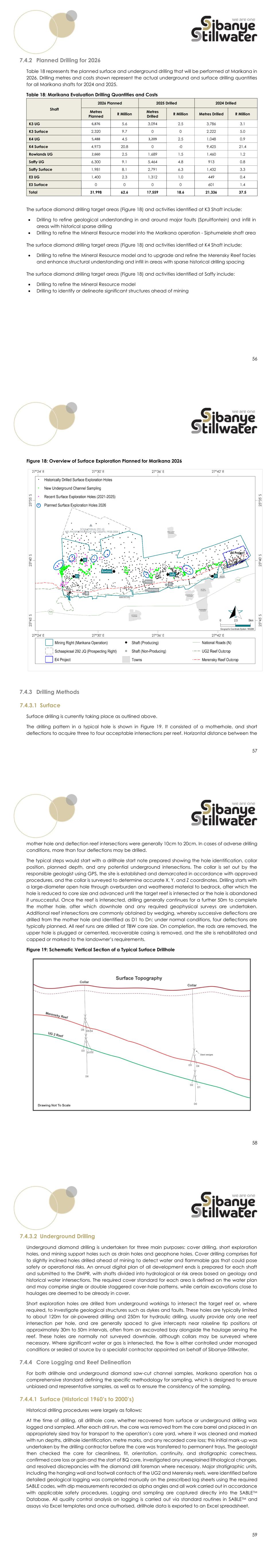 56 7.4.2 Planned Drilling for 2026 Table 18 represents the planned surface and underground drilling that will be performed at Marikana in 2026. Drilling metres and costs shown represent the actual underground and surface drilling quantities for all Marikana shafts for 2024 and 2025. Table 18: Marikana Evaluation Drilling Quantities and Costs Shaft 2026 Planned 2025 Drilled 2024 Drilled Metres Planned R Million Metres Drilled R Million Metres Drilled R Million K3 UG 6,876 5.6 3,094 2.5 3,786 3.1 K3 Surface 2,320 9.7 0 0 2,222 5.0 K4 UG 5,488 4.5 3,209 2.5 1,048 0.9 K4 Surface 4,973 20.8 0 -0 9,425 21.4 Rowlands UG 2,660 2.5 1,689 1.5 1,460 1.2 Saffy UG 6,300 9.1 5,464 4.8 913 0.8 Saffy Surface 1,981 8.1 2,791 6.3 1,432 3.3 E3 UG 1,400 2.3 1,312 1.0 449 0.4 E3 Surface 0 0 0 0 601 1.4 Total 31,998 62.6 17,559 18.6 21,336 37.5 The surface diamond drilling target areas (Figure 18) and activities identified at K3 Shaft include: • Drilling to refine geological understanding in and around major faults (Spruitfontein) and infill in areas with historical sparse drilling • Drilling to refine the Mineral Resource model into the Marikana operation - Siphumelele shaft area The surface diamond drilling target areas (Figure 18) and activities identified at K4 Shaft include: • Drilling to refine the Mineral Resource model and to upgrade and refine the Merensky Reef facies and enhance structural understanding and infill in areas with sparse historical drilling spacing The surface diamond drilling target areas (Figure 18) and activities identified at Saffy include: • Drilling to refine the Mineral Resource model • Drilling to identify or delineate significant structures ahead of mining 57 Figure 18: Overview of Surface Exploration Planned for Marikana 2026 7.4.3 Drilling Methods 7.4.3.1 Surface Surface drilling is currently taking place as outlined above. The drilling pattern in a typical hole is shown in Figure 19. It consisted of a motherhole, and short deflections to acquire three to four acceptable intersections per reef. Horizontal distance between the 58 mother hole and deflection reef intersections were generally 10cm to 20cm. In cases of adverse drilling conditions, more than four deflections may be drilled. The typical steps would start with a drillhole start note prepared showing the hole identification, collar position, planned depth, and any potential underground intersections. The collar is set out by the responsible geologist using GPS, the site is established and demarcated in accordance with approved procedures, and the collar is surveyed to determine accurate X, Y, and Z coordinates. Drilling starts with a large-diameter open hole through overburden and weathered material to bedrock, after which the hole is reduced to core size and advanced until the target reef is intersected or the hole is abandoned if unsuccessful. Once the reef is intersected, drilling generally continues for a further 50m to complete the mother hole, after which downhole and any required geophysical surveys are undertaken. Additional reef intersections are commonly obtained by wedging, whereby successive deflections are drilled from the mother hole and identified as D1 to Dn; under normal conditions, four deflections are typically planned. All reef runs are drilled at TBW core size. On completion, the rods are removed, the upper hole is plugged or cemented, recoverable casing is removed, and the site is rehabilitated and capped or marked to the landowner’s requirements. Figure 19: Schematic Vertical Section of a Typical Surface Drillhole 59 7.4.3.2 Underground Drilling Underground diamond drilling is undertaken for three main purposes: cover drilling, short exploration holes, and mining support holes such as drain holes and geophone holes. Cover drilling comprises flat to slightly inclined holes drilled ahead of mining to detect water and flammable gas that could pose safety or operational risks. An annual digital plan of all development ends is prepared for each shaft and submitted to the DMPR, with shafts divided into hydrological or risk areas based on geology and historical water intersections. The required cover standard for each area is defined on the water plan and may comprise single or double staggered cover-hole patterns, while certain excavations close to haulages are deemed to be already in cover. Short exploration holes are drilled from underground workings to intersect the target reef or, where required, to investigate geological structures such as dykes and faults. These holes are typically limited to about 120m for air-powered drilling and 250m for hydraulic drilling, usually provide only one reef intersection per hole, and are generally spaced to give intercepts near raiseline tip positions at approximately 30m to 50m intervals, often from an excavated bay alongside the haulage serving the reef. These holes are normally not surveyed downhole, although collars may be surveyed where necessary. Where significant water or gas is intersected, the flow is either controlled under managed conditions or sealed at source by a specialist contractor appointed on behalf of Sibanye-Stillwater. 7.4.4 Core Logging and Reef Delineation For both drillhole and underground diamond saw-cut channel samples, Marikana operation has a comprehensive standard defining the specific methodology for sampling, which is designed to ensure unbiased and representative samples, as well as to ensure the consistency of the sampling. 7.4.4.1 Surface (Historical 1960’s to 2000’s) Historical drilling procedures were largely as follows: At the time of drilling, all drillhole core, whether recovered from surface or underground drilling was logged and sampled. After each drill run, the core was removed from the core barrel and placed in an appropriately sized tray for transport to the operation’s core yard, where it was cleaned and marked with run depths, drillhole identification, metre marks, and any recorded core loss; this