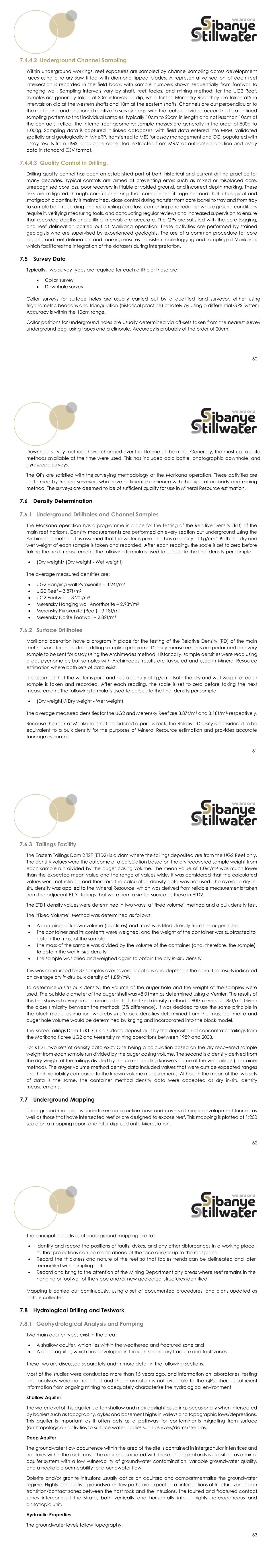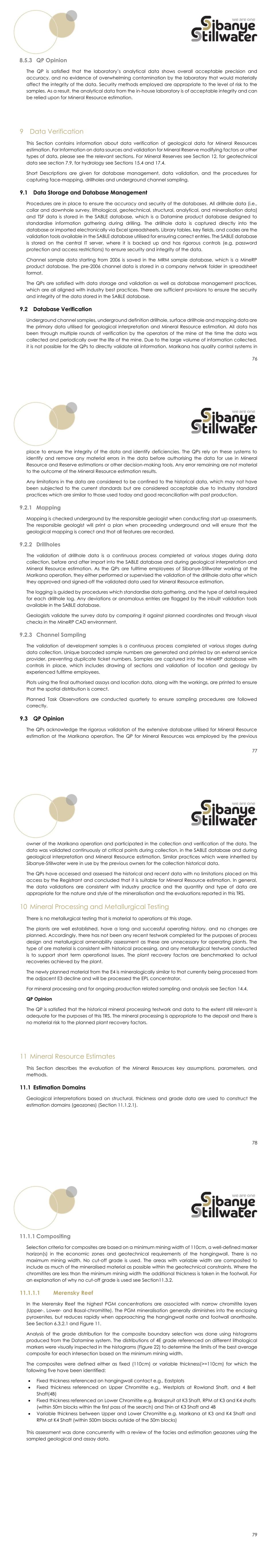 76 8.5.3 QP Opinion The QP is satisfied that the laboratory’s analytical data shows overall acceptable precision and accuracy, and no evidence of overwhelming contamination by the laboratory that would materially affect the integrity of the data. Security methods employed are appropriate to the level of risk to the samples. As a result, the analytical data from the in-house laboratory is of acceptable integrity and can be relied upon for Mineral Resource estimation. 9 Data Verification This Section contains information about data verification of geological data for Mineral Resources estimation. For Information on data sources and validation for Mineral Reserve modifying factors or other types of data, please see the relevant sections. For Mineral Reserves see Section 12, for geotechnical data see section 7.9, for hydrology see Sections 15.4 and 17.4. Short Descriptions are given for database management, data validation, and the procedures for capturing face-mapping, drillholes and underground channel sampling. 9.1 Data Storage and Database Management Procedures are in place to ensure the accuracy and security of the databases. All drillhole data (i.e., collar and downhole survey, lithological, geotechnical, structural, analytical, and mineralisation data) and TSF data is stored in the SABLE database, which is a Datamine product database designed to standardise information gathering during drilling. The drillhole data is captured directly into the database or imported electronically via Excel spreadsheets. Library tables, key fields, and codes are the validation tools available in the SABLE database utilised for ensuring correct entries. The SABLE database is stored on the central IT server, where it is backed up and has rigorous controls (e.g. password protection and access restrictions) to ensure security and integrity of the data. Channel sample data starting from 2006 is saved in the MRM sample database, which is a MineRP product database. The pre-2006 channel data is stored in a company network folder in spreadsheet format. The QPs are satisfied with data storage and validation as well as database management practices, which are all aligned with industry best practices. There are sufficient provisions to ensure the security and integrity of the data stored in the SABLE database. 9.2 Database Verification Underground channel samples, underground definition drillhole, surface drillhole and mapping data are the primary data utilised for geological interpretation and Mineral Resource estimation. All data has been through multiple rounds of verification by the operators of the mine at the time the data was collected and periodically over the life of the mine. Due to the large volume of information collected, it is not possible for the QPs to directly validate all information. Marikana has quality control systems in 77 place to ensure the integrity of the data and identify deficiencies. The QPs rely on these systems to identify and remove any material errors in the data before authorising the data for use in Mineral Resource and Reserve estimations or other decision-making tools. Any error remaining are not material to the outcome of the Mineral Resource estimation results. Any limitations in the data are considered to be confined to the historical data, which may not have been subjected to the current standards but are considered acceptable due to Industry standard practices which are similar to those used today and good reconciliation with past production. 9.2.1 Mapping Mapping is checked underground by the responsible geologist when conducting start up assessments. The responsible geologist will print a plan when proceeding underground and will ensure that the geological mapping is correct and that all features are recorded. 9.2.2 Drillholes The validation of drillhole data is a continuous process completed at various stages during data collection, before and after import into the SABLE database and during geological interpretation and Mineral Resource estimation. As the QPs are fulltime employees of Sibanye-Stillwater working at the Marikana operation, they either performed or supervised the validation of the drillhole data after which they approved and signed-off the validated data used for Mineral Resource estimation. The logging is guided by procedures which standardise data gathering, and the type of detail required for each drillhole log. Any deviations or anomalous entries are flagged by the inbuilt validation tools available in the SABLE database. Geologists validate the survey data by comparing it against planned coordinates and through visual checks in the MineRP CAD environment. 9.2.3 Channel Sampling The validation of development samples is a continuous process completed at various stages during data collection. Unique barcoded sample numbers are generated and printed by an external service provider, preventing duplicate ticket numbers. Samples are captured into the MineRP database with controls in place, which includes drawing of sections and validation of location and geology by experienced fulltime employees. Plots using the final authorised assays and location data, along with the workings, are printed to ensure that the spatial distribution is correct. Planned Task Observations are conducted quarterly to ensure sampling procedures are followed correctly. 9.3 QP Opinion The QPs acknowledge the rigorous validation of the extensive database utilised for Mineral Resource estimation at the Marikana operation. The QP for Mineral Resources was employed by the previous 78 owner of the Marikana operation and participated in the collection and verification of the data. The data was validated continuously at critical points during collection, in the SABLE database and during geological interpretation and Mineral Resource estimation. Similar practices which were inherited by Sibanye-Stillwater were in use by the previous owners for the collection historical data. The QPs have acc