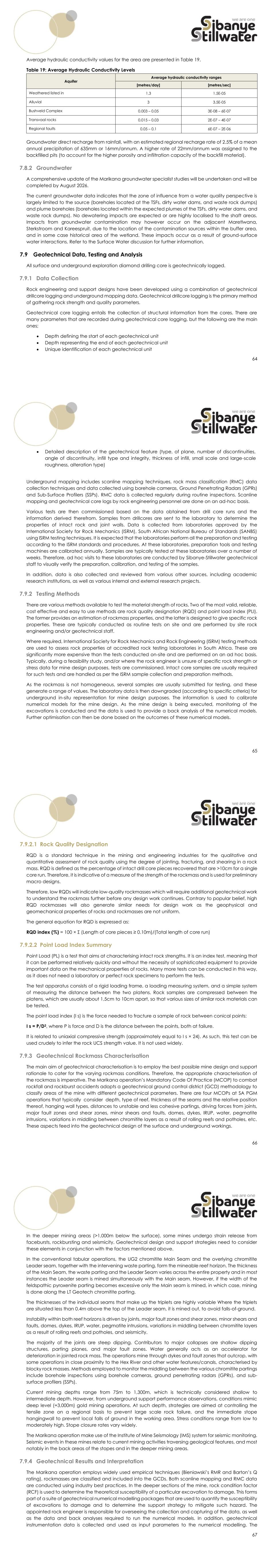 64 Average hydraulic conductivity values for the area are presented in Table 19. Table 19: Average Hydraulic Conductivity Levels Aquifer Average hydraulic conductivity ranges [metres/day] [metres/sec] Weathered listed in 1.3 1.5E-05 Alluvial 3 3.5E-05 Bushveld Complex 0.003 – 0.05 3E-08 – 6E-07 Transvaal rocks 0.015 – 0.03 2E-07 – 4E-07 Regional faults 0.05 – 0.1 6E-07 – 2E-06 Groundwater direct recharge from rainfall, with an estimated regional recharge rate of 2.5% of a mean annual precipitation of 635mm or 16mm/annum. A higher rate of 22mm/annum was assigned to the backfilled pits (to account for the higher porosity and infiltration capacity of the backfill material). 7.8.2 Groundwater A comprehensive update of the Marikana groundwater specialist studies will be undertaken and will be completed by August 2026. The current groundwater data indicates that the zone of influence from a water quality perspective is largely limited to the source (boreholes located at the TSFs, dirty water dams, and waste rock dumps) and plume boreholes (boreholes located within the expected plumes of the TSFs, dirty water dams, and waste rock dumps). No dewatering impacts are expected or are highly localised to the shaft areas. Impacts from groundwater contamination may however occur on the adjacent Maretlwana, Sterkstroom and Kareespruit, due to the location of the contamination sources within the buffer area, and in some case historical area of the wetland. These impacts occur as a result of ground-surface water interactions. Refer to the Surface Water discussion for further information. 7.9 Geotechnical Data, Testing and Analysis All surface and underground exploration diamond drilling core is geotechnically logged. 7.9.1 Data Collection Rock engineering and support designs have been developed using a combination of geotechnical drillcore logging and underground mapping data. Geotechnical drillcore logging is the primary method of gathering rock strength and quality parameters. Geotechnical core logging entails the collection of structural information from the cores. There are many parameters that are recorded during geotechnical core logging, but the following are the main ones; • Depth defining the start of each geotechnical unit • Depth representing the end of each geotechnical unit • Unique identification of each geotechnical unit 65 • Detailed description of the geotechnical feature (type, of plane, number of discontinuities, angle of discontinuity, infill type and integrity, thickness of infill, small scale and large-scale roughness, alteration type) Underground mapping includes scanline mapping techniques, rock mass classification (RMC) data collection techniques and data collected using borehole cameras, Ground Penetrating Radars (GPRs) and Sub-Surface Profilers (SSPs). RMC data is collected regularly during routine inspections. Scanline mapping and geotechnical core logs by rock engineering personnel are done on an ad-hoc basis. Various tests are then commissioned based on the data obtained from drill core runs and the information derived therefrom. Samples from drillcores are sent to the laboratory to determine the properties of intact rock and joint walls. Data is collected from laboratories approved by the International Society for Rock Mechanics (ISRM), South African National Bureau of Standards (SANBS) using ISRM testing techniques. It is expected that the laboratories perform all the preparation and testing according to the ISRM standards and procedures. At these laboratories, preparation tools and testing machines are calibrated annually. Samples are typically tested at these laboratories over a number of weeks. Therefore, ad hoc visits to these laboratories are conducted by Sibanye-Stillwater geotechnical staff to visually verify the preparation, calibration, and testing of the samples. In addition, data is also collected and reviewed from various other sources, including academic research institutions, as well as various internal and external research projects. 7.9.2 Testing Methods There are various methods available to test the material strength of rocks. Two of the most valid, reliable, cost effective and easy to use methods are rock quality designation (RQD) and point load index (PLI). The former provides an estimation of rockmass properties, and the latter is designed to give specific rock properties. These are typically conducted as routine tests on site and are performed by site rock engineering and/or geotechnical staff. Where required, International Society for Rock Mechanics and Rock Engineering (ISRM) testing methods are used to assess rock properties at accredited rock testing laboratories in South Africa. These are significantly more expensive than the tests conducted on-site and are performed on an ad hoc basis. Typically, during a feasibility study, and/or where the rock engineer is unsure of specific rock strength or stress data for mine design purposes, tests are commissioned. Intact core samples are usually required for such tests and are handled as per the ISRM sample collection and preparation methods. As the rockmass is not homogeneous, several samples are usually submitted for testing, and these generate a range of values. The laboratory data is then downgraded (according to specific criteria) for underground in-situ representation for mine design purposes. The information is used to calibrate numerical models for the mine design. As the mine design is being executed, monitoring of the excavations is conducted and the data is used to provide a back analysis of the numerical models. Further optimisation can then be done based on the outcomes of these numerical models. 66 7.9.2.1 Rock Quality Designation RQD is a standard technique in the mining and engineering industries for the qualitative and quantitative assessment of rock quality using the degree of jointing, fracturing, and shearing in a rock mass. RQD is defined as the percentage of intact 
