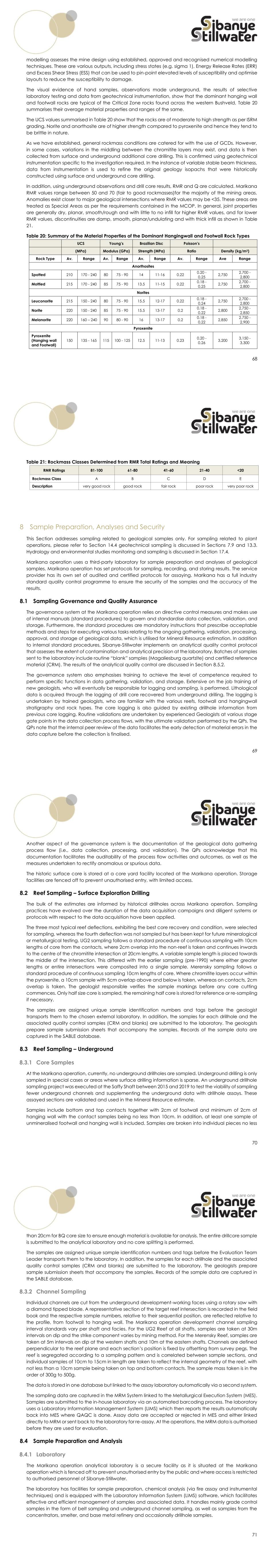 68 modelling assesses the mine design using established, approved and recognised numerical modelling techniques. These are various outputs, including stress states (e.g. sigma 1), Energy Release Rates (ERR) and Excess Shear Stress (ESS) that can be used to pin-point elevated levels of susceptibility and optimise layouts to reduce the susceptibility to damage. The visual evidence of hand samples, observations made underground, the results of selective laboratory testing and data from geotechnical instrumentation, show that the dominant hanging wall and footwall rocks are typical of the Critical Zone rocks found across the western Bushveld. Table 20 summarises their average material properties and ranges of the same. The UCS values summarised in Table 20 show that the rocks are of moderate to high strength as per ISRM grading. Norite and anorthosite are of higher strength compared to pyroxenite and hence they tend to be brittle in nature. As we have established, general rockmass conditions are catered for with the use of GCDs. However, in some cases, variations in the middling between the chromitite layers may exist, and data is then collected from surface and underground additional core drilling. This is confirmed using geotechnical instrumentation specific to the investigation required. In the instance of variable stable beam thickness, data from instrumentation is used to refine the original geology isopachs that were historically constructed using surface and underground core drilling. In addition, using underground observations and drill core results, RMR and Q are calculated. Marikana RMR values range between 50 and 70 (fair to good rockmasses)for the majority of the mining areas. Anomalies exist closer to major geological intersections where RMR values may be <35. These areas are treated as Special Areas as per the requirements contained in the MCOP. In general, joint properties are generally dry, planar, smooth/rough and with little to no infill for higher RMR values, and for lower RMR values, discontinuities are damp, smooth, planar/undulating and with thick infill as shown in Table 21. Table 20: Summary of the Material Properties of the Dominant Hangingwall and Footwall Rock Types UCS Young’s Brazilian Disc Poisson’s (MPa) Modulus (GPa) Strength (MPa) Ratio Density (kg/m3) Rock Type Av. Range Av. Range Av. Range Av. Range Ave Range Anorthosites Spotted 210 170 - 240 80 75 - 90 14 11-16 0.22 0.20 - 0.25 2,750 2,700 - 2,800 Mottled 215 170 - 240 85 75 - 90 13.5 11-15 0.22 0.18 - 0.25 2,750 2,700 - 2,800 Norites Leuconorite 215 150 - 240 80 75 - 90 15.5 12-17 0.22 0.18 - 0.24 2,750 2,700 - 2,800 Norite 220 150 - 240 85 75 - 90 15.5 13-17 0.2 0.18 - 0.22 2,800 2,750 - 2,850 Melanorite 220 160 – 240 90 80 - 90 16 13-17 0.2 0.18 - 0.22 2,850 2,750 - 2,900 Pyroxenite Pyroxenite (Hanging wall and Footwall) 150 135 - 165 115 100 - 125 12.5 11-13 0.23 0.20 - 0.26 3,200 3,150 - 3,300 69 Table 21: Rockmass Classes Determined from RMR Total Ratings and Meaning RMR Ratings 81-100 61-80 41-60 21-40 <20 Rockmass Class A B C D E Description very good rock good rock fair rock poor rock very poor rock 8 Sample Preparation, Analyses and Security This Section addresses sampling related to geological samples only. For sampling related to plant operations, please refer to Section 14.4 geotechnical sampling is discussed in Sections 7.9 and 13.3. Hydrology and environmental studies monitoring and sampling is discussed in Section 17.4. Marikana operation uses a third-party laboratory for sample preparation and analyses of geological samples. Marikana operation has set protocols for sampling, recording, and storing results. The service provider has its own set of audited and certified protocols for assaying. Marikana has a full industry standard quality control programme to ensure the security of the samples and the accuracy of the results. 8.1 Sampling Governance and Quality Assurance The governance system at the Marikana operation relies on directive control measures and makes use of internal manuals (standard procedures) to govern and standardise data collection, validation, and storage. Furthermore, the standard procedures are mandatory instructions that prescribe acceptable methods and steps for executing various tasks relating to the ongoing gathering, validation, processing, approval, and storage of geological data, which is utilised for Mineral Resource estimation. In addition to internal standard procedures, Sibanye-Stillwater implements an analytical quality control protocol that assesses the extent of contamination and analytical precision at the laboratory. Batches of samples sent to the laboratory include routine “blank” samples (Magaliesburg quartzite) and certified reference material (CRM). The results of the analytical quality control are discussed in Section 8.5.2. The governance system also emphasises training to achieve the level of competence required to perform specific functions in data gathering, validation, and storage. Extensive on the job training of new geologists, who will eventually be responsible for logging and sampling, is performed. Lithological data is acquired through the logging of drill core recovered from underground drilling. The logging is undertaken by trained geologists, who are familiar with the various reefs, footwall and hangingwall stratigraphy and rock types. The core logging is also guided by existing drillhole information from previous core logging. Routine validations are undertaken by experienced Geologists at various stage gate points in the data collection process flows, with the ultimate validation performed by the QPs. The QPs note that the internal peer review of the data facilitates the early detection of material errors in the data capture before the collection is finalised. 70 Another aspect of the governance system is the documentation of the geological data gathering process flow (i.e., data collection, processing, and validation). The 