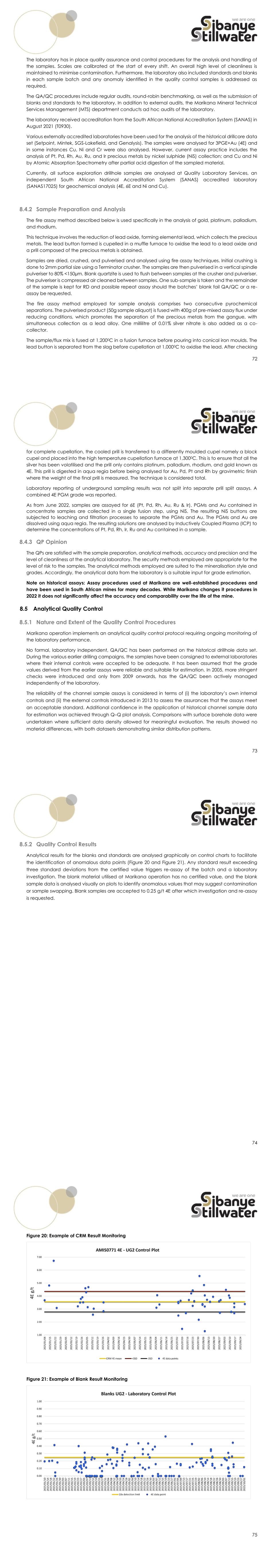 72 The laboratory has in place quality assurance and control procedures for the analysis and handling of the samples. Scales are calibrated at the start of every shift. An overall high level of cleanliness is maintained to minimise contamination. Furthermore, the laboratory also included standards and blanks in each sample batch and any anomaly identified in the quality control samples is addressed as required. The QA/QC procedures include regular audits, round-robin benchmarking, as well as the submission of blanks and standards to the laboratory. In addition to external audits, the Marikana Mineral Technical Services Management (MTS) department conducts ad hoc audits of the laboratory. The laboratory received accreditation from the South African National Accreditation System (SANAS) in August 2021 (T0930). Various externally accredited laboratories have been used for the analysis of the historical drillcore data set (Setpoint, Mintek, SGS-Lakefield, and Genalysis). The samples were analysed for 3PGE+Au (4E) and in some instances Cu, Ni and Cr were also analysed. However, current assay practice includes the analysis of Pt, Pd, Rh, Au, Ru, and Ir precious metals by nickel sulphide (NiS) collection; and Cu and Ni by Atomic Absorption Spectrometry after partial acid digestion of the sampled material. Currently, all surface exploration drillhole samples are analysed at Quality Laboratory Services, an independent South African National Accreditation System (SANAS) accredited laboratory (SANAS17025) for geochemical analysis (4E, 6E and Ni and Cu). 8.4.2 Sample Preparation and Analysis The fire assay method described below is used specifically in the analysis of gold, platinum, palladium, and rhodium. This technique involves the reduction of lead oxide, forming elemental lead, which collects the precious metals. The lead button formed is cupelled in a muffle furnace to oxidise the lead to a lead oxide and a prill composed of the precious metals is obtained. Samples are dried, crushed, and pulverised and analysed using fire assay techniques. Initial crushing is done to 2mm partial size using a Terminator crusher. The samples are then pulverised in a vertical spindle pulveriser to 80% <150µm. Blank quartzite is used to flush between samples at the crusher and pulveriser. The pulveriser is compressed air cleaned between samples. One sub-sample is taken and the remainder of the sample is kept for RD and possible repeat assay should the batches’ blank fail QA/QC or a re- assay be requested. The fire assay method employed for sample analysis comprises two consecutive pyrochemical separations. The pulverised product (50g sample aliquot) is fused with 400g of pre-mixed assay flux under reducing conditions, which promotes the separation of the precious metals from the gangue, with simultaneous collection as a lead alloy. One millilitre of 0.01% silver nitrate is also added as a co- collector. The sample/flux mix is fused at 1,2000C in a fusion furnace before pouring into conical iron moulds. The lead button is separated from the slag before cupellation at 1,0000C to oxidise the lead. After checking 73 for complete cupellation, the cooled prill is transferred to a differently moulded cupel namely a block cupel and placed into the high temperature cupellation furnace at 1,3000C. This is to ensure that all the silver has been volatilised and the prill only contains platinum, palladium, rhodium, and gold known as 4E. This prill is digested in aqua regia before being analysed for Au, Pd, Pt and Rh by gravimetric finish where the weight of the final prill is measured. The technique is considered total. Laboratory reporting of underground sampling results was not split into separate prill split assays. A combined 4E PGM grade was reported. As from June 2022, samples are assayed for 6E (Pt, Pd, Rh, Au, Ru & Ir). PGMs and Au contained in concentrate samples are collected in a single fusion step, using NiS. The resulting NiS buttons are subjected to leaching and filtration processes to separate the PGMs and Au. The PGMs and Au are dissolved using aqua regia. The resulting solutions are analysed by Inductively Coupled Plasma (ICP) to determine the concentrations of Pt, Pd, Rh, Ir, Ru and Au contained in a sample. 8.4.3 QP Opinion The QPs are satisfied with the sample preparation, analytical methods, accuracy and precision and the level of cleanliness at the analytical laboratory. The security methods employed are appropriate for the level of risk to the samples. The analytical methods employed are suited to the mineralisation style and grades. Accordingly, the analytical data from the laboratory is a suitable input for grade estimation. Note on historical assays: Assay procedures used at Marikana are well-established procedures and have been used in South African mines for many decades. While Marikana changes it procedures in 2022 it does not significantly affect the accuracy and comparability over the life of the mine. 8.5 Analytical Quality Control 8.5.1 Nature and Extent of the Quality Control Procedures Marikana operation implements an analytical quality control protocol requiring ongoing monitoring of the laboratory performance. No formal, laboratory independent, QA/QC has been performed on the historical drillhole data set. During the various earlier drilling campaigns, the samples have been consigned to external laboratories where their internal controls were accepted to be adequate. It has been assumed that the grade values derived from the earlier assays were reliable and suitable for estimation. In 2005, more stringent checks were introduced and only from 2009 onwards, has the QA/QC been actively managed independently of the laboratory. The reliability of the channel sample assays is considered in terms of (i) the laboratory’s own internal controls and (ii) the external controls introduced in 2013 to assess the assurances that the assays meet an acceptable standard. Additional confidence in the app