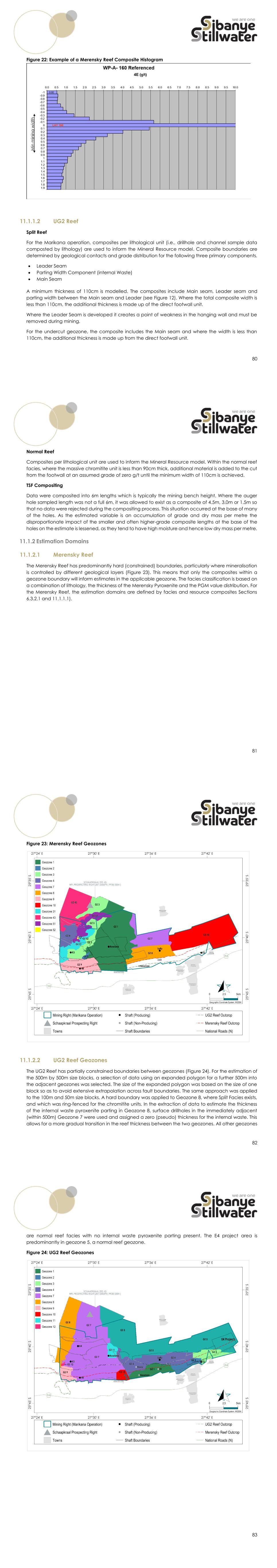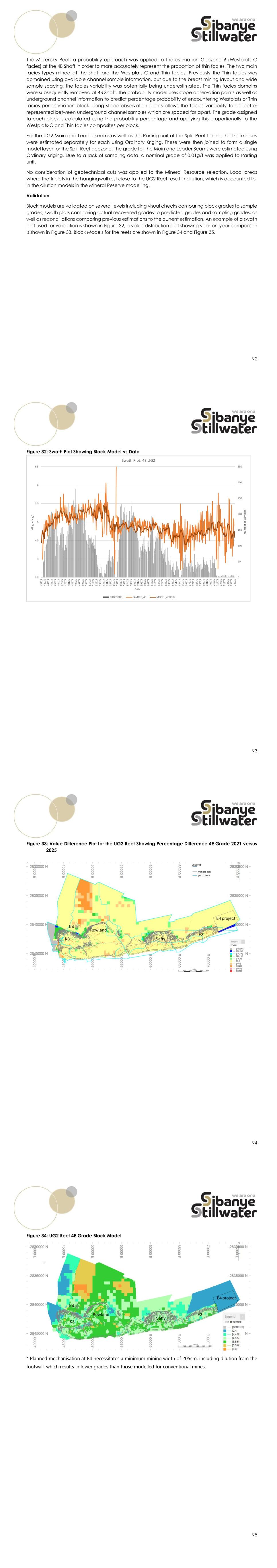92 The Merensky Reef, a probability approach was applied to the estimation Geozone 9 (Westplats C facies) at the 4B Shaft in order to more accurately represent the proportion of thin facies. The two main facies types mined at the shaft are the Westplats-C and Thin facies. Previously the Thin facies was domained using available channel sample information, but due to the breast mining layout and wide sample spacing, the facies variability was potentially being underestimated. The Thin facies domains were subsequently removed at 4B Shaft. The probability model uses stope observation points as well as underground channel information to predict percentage probability of encountering Westplats or Thin facies per estimation block. Using stope observation points allows the facies variability to be better represented between underground channel samples which are spaced far apart. The grade assigned to each block is calculated using the probability percentage and applying this proportionally to the Westplats-C and Thin facies composites per block. For the UG2 Main and Leader seams as well as the Parting unit of the Split Reef facies, the thicknesses were estimated separately for each using Ordinary Kriging. These were then joined to form a single model layer for the Split Reef geozone. The grade for the Main and Leader Seams were estimated using Ordinary Kriging. Due to a lack of sampling data, a nominal grade of 0.01g/t was applied to Parting unit. No consideration of geotechnical cuts was applied to the Mineral Resource selection. Local areas where the triplets in the hangingwall rest close to the UG2 Reef result in dilution, which is accounted for in the dilution models in the Mineral Reserve modelling. Validation Block models are validated on several levels including visual checks comparing block grades to sample grades, swath plots comparing actual recovered grades to predicted grades and sampling grades, as well as reconciliations comparing previous estimations to the current estimation. An example of a swath plot used for validation is shown in Figure 32, a value distribution plot showing year-on-year comparison is shown in Figure 33. Block Models for the reefs are shown in Figure 34 and Figure 35. 93 Figure 32: Swath Plot Showing Block Model vs Data 94 Figure 33: Value Difference Plot for the UG2 Reef Showing Percentage Difference 4E Grade 2021 versus 2025 95 Figure 34: UG2 Reef 4E Grade Block Model * Planned mechanisation at E4 necessitates a minimum mining width of 205cm, including dilution from the footwall, which results in lower grades than those modelled for conventional mines.