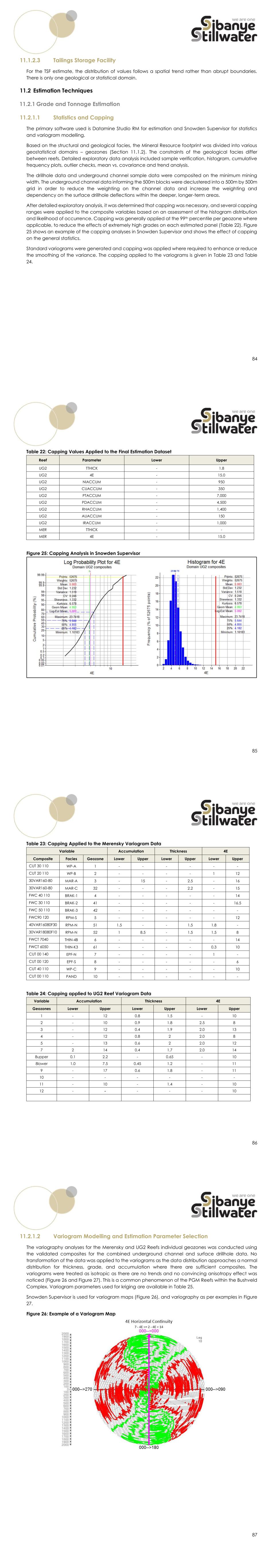 84 11.1.2.3 Tailings Storage Facility For the TSF estimate, the distribution of values follows a spatial trend rather than abrupt boundaries. There is only one geological or statistical domain. 11.2 Estimation Techniques 11.2.1 Grade and Tonnage Estimation 11.2.1.1 Statistics and Capping The primary software used is Datamine Studio RM for estimation and Snowden Supervisor for statistics and variogram modelling. Based on the structural and geological facies, the Mineral Resource footprint was divided into various geostatistical domains – geozones (Section 11.1.2). The constraints of the geological facies differ between reefs. Detailed exploratory data analysis included sample verification, histogram, cumulative frequency plots, outlier checks, mean vs. covariance and trend analysis. The drillhole data and underground channel sample data were composited on the minimum mining width. The underground channel data informing the 500m blocks were declustered into a 500m by 500m grid in order to reduce the weighting on the channel data and increase the weighting and dependency on the surface drillhole deflections within the deeper, longer-term areas. After detailed exploratory analysis, it was determined that capping was necessary, and several capping ranges were applied to the composite variables based on an assessment of the histogram distribution and likelihood of occurrence. Capping was generally applied at the 99th percentile per geozone where applicable, to reduce the effects of extremely high grades on each estimated panel (Table 22). Figure 25 shows an example of the capping analyses in Snowden Supervisor and shows the effect of capping on the general statistics. Standard variograms were generated and capping was applied where required to enhance or reduce the smoothing of the variance. The capping applied to the variograms is given in Table 23 and Table 24. 85 Table 22: Capping Values Applied to the Final Estimation Dataset Reef Parameter Lower Upper UG2 TTHICK - 1.8 UG2 4E - 15.0 UG2 NIACCUM - 950 UG2 CUACCUM - 350 UG2 PTACCUM - 7,000 UG2 PDACCUM - 4,500 UG2 RHACCUM - 1,400 UG2 AUACCUM - 150 UG2 IRACCUM - 1,000 MER TTHICK - - MER 4E - 15.0 Figure 25: Capping Analysis in Snowden Supervisor 86 Table 23: Capping Applied to the Merensky Variogram Data Variable Accumulation Thickness 4E Composite Facies Geozone Lower Upper Lower Upper Lower Upper CUT 30 110 WP-A 1 - - - - - - CUT 20 110 WP-B 2 - - - - 1 12 30VAR160-80 MAR-A 3 - 15 - 2.5 - 16 30VAR160-80 MAR-C 32 - - - 2.2 - 15 FWC 40 110 BRAK-1 4 - - - - - 14 FWC 30 110 BRAK-2 41 - - - - - 16.5 FWC 50 110 BRAK-3 42 - - - - - - FWC90 120 RPM-S 5 - - - - - 12 40VAR16080F30 RPM-N 51 1.5 - - 1.5 1.8 - 30VAR18080F10 RPM-N 52 1 8.5 - 1.5 1.5 8 FWCT 7040 THIN-4B 6 - - - - - 14 FWCT 6050 THIN-K3 61 - - - - 0.3 10 CUT 00 140 EPF-N 7 - - - - 1 - CUT 00 120 EPF-S 8 - - - - - 6 CUT 40 110 WP-C 9 - - - - - 10 CUT 00 110 PAND 10 - - - - - - Table 24: Capping applied to UG2 Reef Variogram Data Variable Accumulation Thickness 4E Geozones Lower Upper Lower Upper Lower Upper 1 - 12 0.8 1.5 - 10 2 - 10 0.9 1.8 2.5 8 3 - 12 0.4 1.9 2.0 13 4 - 12 0.8 2 2.0 8 5 - 13 0.6 2 2.0 12 7 2 14 0.4 1.7 2.0 14 8upper 0.1 2.2 - 0.65 - 10 8lower 1.0 7.5 0.45 1.2 - 11 9 - 17 0.6 1.8 - 11 10 - - - - - - 11 - 10 - 1.4 - 10 12 - - - - - 10 87 11.2.1.2 Variogram Modelling and Estimation Parameter Selection The variography analyses for the Merensky and UG2 Reefs individual geozones was conducted using the validated composites for the combined underground channel and surface drillhole data. No transformation of the data was applied to the variograms as the data distribution approaches a normal distribution for thickness, grade, and accumulation where there are sufficient composites. The variograms were treated as isotropic as there are no trends and no convincing anisotropy effect was noticed (Figure 26 and Figure 27). This is a common phenomenon of the PGM Reefs within the Bushveld Complex. Variogram parameters used for kriging are available in Table 25. Snowden Supervisor is used for variogram maps (Figure 26), and variography as per examples in Figure 27. Figure 26: Example of a Variogram Map