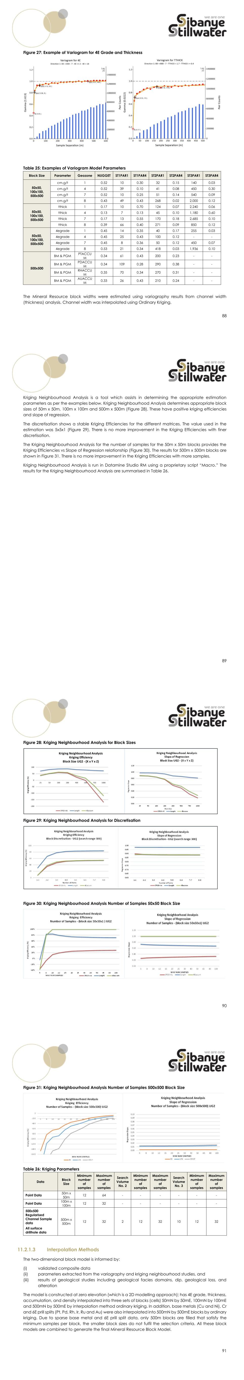 88 Figure 27: Example of Variogram for 4E Grade and Thickness Table 25: Examples of Variogram Model Parameters Block Size Parameter Geozone NUGGET ST1PAR1 ST1PAR4 ST2PAR1 ST2PAR4 ST3PAR1 ST3PAR4 50x50, 100x100, 500x500 cm.g/t 1 0.52 10 0.30 32 0.15 140 0.03 cm.g/t 4 0.52 39 0.10 41 0.08 450 0.30 cm.g/t 7 0.52 10 0.25 51 0.14 540 0.09 cm.g/t 8 0.43 49 0.43 268 0.02 2,000 0.12 50x50, 100x100, 500x500 tthick 1 0.17 10 0.70 124 0.07 2,240 0.06 tthick 4 0.13 7 0.13 45 0.10 1,180 0.60 tthick 7 0.17 13 0.55 170 0.18 2,685 0.10 tthick 8 0.39 66 0.40 271 0.09 850 0.12 50x50, 100x100, 500x500 4egrade 1 0.45 14 0.35 40 0.17 255 0.03 4egrade 4 0.45 25 0.43 100 0.12 - - 4egrade 7 0.45 8 0.36 50 0.12 450 0.07 4egrade 8 0.53 21 0.34 418 0.03 1,936 0.10 500x500 BM & PGM PTACCU M 0.34 61 0.43 200 0.23 - - BM & PGM PDACCU M 0.34 109 0.28 290 0.38 - - BM & PGM RHACCU M 0.35 70 0.34 270 0.31 - - BM & PGM AUACCU M 0.33 26 0.43 210 0.24 - - The Mineral Resource block widths were estimated using variography results from channel width (thickness) analysis. Channel width was interpolated using Ordinary Kriging. 89 Kriging Neighbourhood Analysis is a tool which assists in determining the appropriate estimation parameters as per the examples below. Kriging Neighbourhood Analysis determines appropriate block sizes of 50m x 50m, 100m x 100m and 500m x 500m (Figure 28). These have positive kriging efficiencies and slope of regression. The discretisation shows a stable Kriging Efficiencies for the different matrices. The value used in the estimation was 5x5x1 (Figure 29). There is no more improvement in the Kriging Efficiencies with finer discretisation. The Kriging Neighbourhood Analysis for the number of samples for the 50m x 50m blocks provides the Kriging Efficiencies vs Slope of Regression relationship (Figure 30). The results for 500m x 500m blocks are shown in Figure 31. There is no more improvement in the Kriging Efficiencies with more samples. Kriging Neighbourhood Analysis is run in Datamine Studio RM using a proprietary script “Macro.” The results for the Kriging Neighbourhood Analysis are summarised in Table 26. 90 Figure 28: Kriging Neighbourhood Analysis for Block Sizes Figure 29: Kriging Neighbourhood Analysis for Discretisation Figure 30: Kriging Neighbourhood Analysis Number of Samples 50x50 Block Size 91 Figure 31: Kriging Neighbourhood Analysis Number of Samples 500x500 Block Size Table 26: Kriging Parameters Data Block Size Minimum number of samples Maximum number of samples Search Volume No. 2 Minimum number of samples Maximum number of samples Search Volume No. 3 Minimum number of samples Maximum number of samples Point Data 50m x 50m 12 64 - - - - - - Point Data 100m x 100m 12 32 - - - - - - 500x500 Regularised Channel Sample data All surface drillhole data 500m x 500m 12 32 2 12 32 10 12 32 11.2.1.3 Interpolation Methods The two-dimensional block model is informed by: (i) validated composite data (ii) parameters extracted from the variography and kriging neighbourhood studies, and (iii) results of geological studies including geological facies domains, dip, geological loss, and alteration The model is constructed at zero elevation (which is a 2D modelling approach); has 4E grade, thickness, accumulation, and density interpolated into three sets of blocks (cells) 50mN by 50mE, 100mN by 100mE and 500mN by 500mE by interpolation method ordinary kriging. In addition, base metals (Cu and Ni), Cr and 6E prill splits (Pt, Pd, Rh, Ir, Ru and Au) were also interpolated into 500mN by 500mE blocks by ordinary kriging. Due to sparse base metal and 6E prill split data, only 500m blocks are filled that satisfy the minimum samples per block, the smaller block sizes do not fulfil the selection criteria. All these block models are combined to generate the final Mineral Resource Block Model.