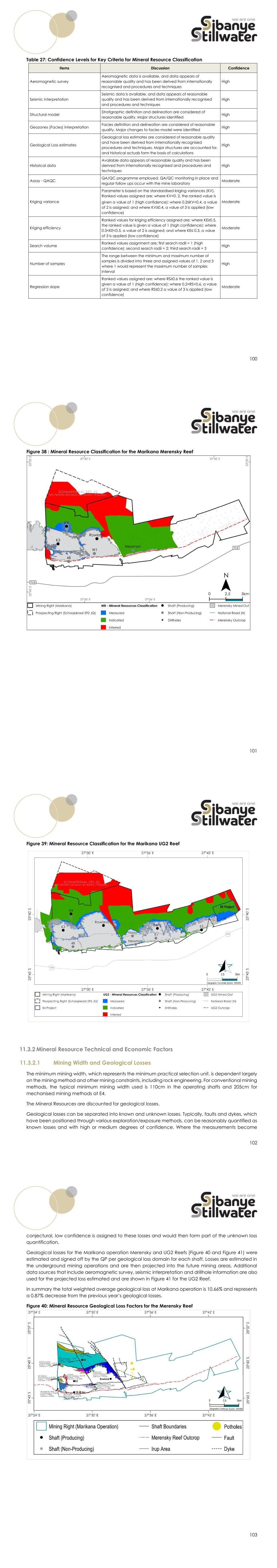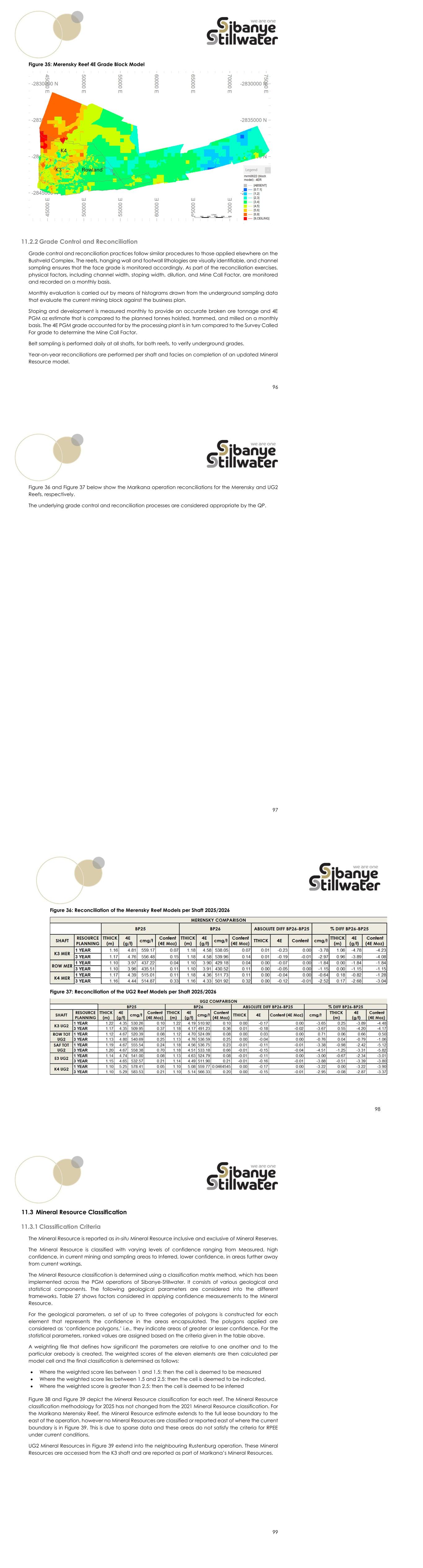 96 Figure 35: Merensky Reef 4E Grade Block Model 11.2.2 Grade Control and Reconciliation Grade control and reconciliation practices follow similar procedures to those applied elsewhere on the Bushveld Complex. The reefs, hanging wall and footwall lithologies are visually identifiable, and channel sampling ensures that the face grade is monitored accordingly. As part of the reconciliation exercises, physical factors, including channel width, stoping width, dilution, and Mine Call Factor, are monitored and recorded on a monthly basis. Monthly evaluation is carried out by means of histograms drawn from the underground sampling data that evaluate the current mining block against the business plan. Stoping and development is measured monthly to provide an accurate broken ore tonnage and 4E PGM oz estimate that is compared to the planned tonnes hoisted, trammed, and milled on a monthly basis. The 4E PGM grade accounted for by the processing plant is in turn compared to the Survey Called For grade to determine the Mine Call Factor. Belt sampling is performed daily at all shafts, for both reefs, to verify underground grades. Year-on-year reconciliations are performed per shaft and facies on completion of an updated Mineral Resource model. 97 Figure 36 and Figure 37 below show the Marikana operation reconciliations for the Merensky and UG2 Reefs, respectively. The underlying grade control and reconciliation processes are considered appropriate by the QP. 98 Figure 36: Reconciliation of the Merensky Reef Models per Shaft 2025/2026 Figure 37: Reconciliation of the UG2 Reef Models per Shaft 2025/2026 99 11.3 Mineral Resource Classification 11.3.1 Classification Criteria The Mineral Resource is reported as in-situ Mineral Resource inclusive and exclusive of Mineral Reserves. The Mineral Resource is classified with varying levels of confidence ranging from Measured, high confidence, in current mining and sampling areas to Inferred, lower confidence, in areas further away from current workings. The Mineral Resource classification is determined using a classification matrix method, which has been implemented across the PGM operations of Sibanye-Stillwater. It consists of various geological and statistical components. The following geological parameters are considered into the different frameworks. Table 27 shows factors considered in applying confidence measurements to the Mineral Resource. For the geological parameters, a set of up to three categories of polygons is constructed for each element that represents the confidence in the areas encapsulated. The polygons applied are considered as ‘confidence polygons,’ i.e., they indicate areas of greater or lesser confidence. For the statistical parameters, ranked values are assigned based on the criteria given in the table above. A weighting file that defines how significant the parameters are relative to one another and to the particular orebody is created. The weighted scores of the eleven elements are then calculated per model cell and the final classification is determined as follows: • Where the weighted score lies between 1 and 1.5: then the cell is deemed to be measured • Where the weighted score lies between 1.5 and 2.5: then the cell is deemed to be indicated, • Where the weighted score is greater than 2.5: then the cell is deemed to be inferred Figure 38 and Figure 39 depict the Mineral Resource classification for each reef. The Mineral Resource classification methodology for 2025 has not changed from the 2021 Mineral Resource classification. For the Marikana Merensky Reef, the Mineral Resource estimate extends to the full lease boundary to the east of the operation, however no Mineral Resources are classified or reported east of where the current boundary is in Figure 39. This is due to sparse data and these areas do not satisfy the criteria for RPEE under current conditions. UG2 Mineral Resources in Figure 39 extend into the neighbouring Rustenburg operation. These Mineral Resources are accessed from the K3 shaft and are reported as part of Marikana’s Mineral Resources.