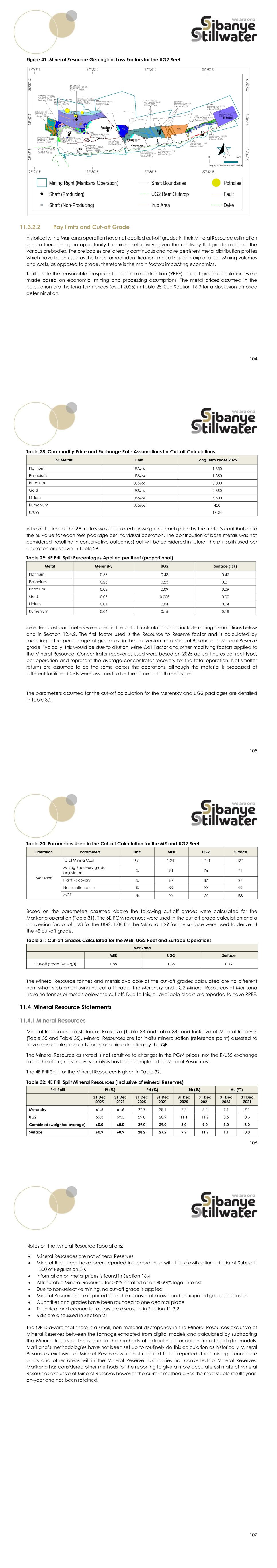 104 Figure 41: Mineral Resource Geological Loss Factors for the UG2 Reef 11.3.2.2 Pay limits and Cut-off Grade Historically, the Marikana operation have not applied cut-off grades in their Mineral Resource estimation due to there being no opportunity for mining selectivity, given the relatively flat grade profile of the various orebodies. The ore bodies are laterally continuous and have persistent metal distribution profiles which have been used as the basis for reef identification, modelling, and exploitation. Mining volumes and costs, as opposed to grade, therefore is the main factors impacting economics. To illustrate the reasonable prospects for economic extraction (RPEE), cut-off grade calculations were made based on economic, mining and processing assumptions. The metal prices assumed in the calculation are the long-term prices (as at 2025) in Table 28. See Section 16.3 for a discussion on price determination. 105 Table 28: Commodity Price and Exchange Rate Assumptions for Cut-off Calculations 6E Metals Units Long Term Prices 2025 Platinum US$/oz 1,350 Palladium US$/oz 1,350 Rhodium US$/oz 5,000 Gold US$/oz 2,650 Iridium US$/oz 5,500 Ruthenium US$/oz 450 R/US$ 18.24 A basket price for the 6E metals was calculated by weighting each price by the metal’s contribution to the 6E value for each reef package per individual operation. The contribution of base metals was not considered (resulting in conservative outcomes) but will be considered in future. The prill splits used per operation are shown in Table 29. Table 29: 6E Prill Split Percentages Applied per Reef (proportional) Metal Merensky UG2 Surface (TSF) Platinum 0.57 0.48 0.47 Palladium 0.26 0.23 0.21 Rhodium 0.03 0.09 0.09 Gold 0.07 0.005 0.00 Iridium 0.01 0.04 0.04 Ruthenium 0.06 0.16 0.18 Selected cost parameters were used in the cut-off calculations and include mining assumptions below and in Section 12.4.2. The first factor used is the Resource to Reserve factor and is calculated by factoring in the percentage of grade lost in the conversion from Mineral Resource to Mineral Reserve grade. Typically, this would be due to dilution, Mine Call Factor and other modifying factors applied to the Mineral Resource. Concentrator recoveries used were based on 2025 actual figures per reef type, per operation and represent the average concentrator recovery for the total operation. Net smelter returns are assumed to be the same across the operations, although the material is processed at different facilities. Costs were assumed to be the same for both reef types. The parameters assumed for the cut-off calculation for the Merensky and UG2 packages are detailed in Table 30. 106 Table 30: Parameters Used in the Cut-off Calculation for the MR and UG2 Reef Operation Parameters Unit MER UG2 Surface Marikana Total Mining Cost R/t 1.241 1,241 432 Mining Recovery grade adjustment % 81 76 71 Plant Recovery % 87 87 27 Net smelter return % 99 99 99 MCF % 99 97 100 Based on the parameters assumed above the following cut-off grades were calculated for the Marikana operation (Table 31). The 6E PGM revenues were used in the cut-off grade calculation and a conversion factor of 1.23 for the UG2, 1.08 for the MR and 1.29 for the surface were used to derive at the 4E cut-off grade. Table 31: Cut-off Grades Calculated for the MER, UG2 Reef and Surface Operations Marikana MER UG2 Surface Cut-off grade (4E – g/t) 1.88 1.85 0.49 The Mineral Resource tonnes and metals available at the cut-off grades calculated are no different from what is obtained using no cut-off grade. The Merensky and UG2 Mineral Resources at Marikana have no tonnes or metals below the cut-off. Due to this, all available blocks are reported to have RPEE. 11.4 Mineral Resource Statements 11.4.1 Mineral Resources Mineral Resources are stated as Exclusive (Table 33 and Table 34) and Inclusive of Mineral Reserves (Table 35 and Table 36). Mineral Resources are for in-situ mineralisation (reference point) assessed to have reasonable prospects for economic extraction by the QP. The Mineral Resource as stated is not sensitive to changes in the PGM prices, nor the R/US$ exchange rates. Therefore, no sensitivity analysis has been completed for Mineral Resources. The 4E Prill Split for the Mineral Resources is given in Table 32. Table 32: 4E Prill Split Mineral Resources (Inclusive of Mineral Reserves) Prill Split Pt (%) Pd (%) Rh (%) Au (%) 31 Dec 2025 31 Dec 2021 31 Dec 2025 31 Dec 2021 31 Dec 2025 31 Dec 2021 31 Dec 2025 31 Dec 2021 Merensky 61.6 61.6 27.9 28.1 3.3 3.2 7.1 7.1 UG2 59.3 59.3 29.0 28.9 11.1 11.2 0.6 0.6 Combined (weighted average) 60.0 60.0 29.0 29.0 8.0 9.0 3.0 3.0 Surface 60.9 60.9 28.2 27.2 9.9 11.9 1.1 0.0 107 Notes on the Mineral Resource Tabulations: • Mineral Resources are not Mineral Reserves • Mineral Resources have been reported in accordance with the classification criteria of Subpart 1300 of Regulation S-K • Information on metal prices is found in Section 16.4 • Attributable Mineral Resource for 2025 is stated at an 80.64% legal interest • Due to non-selective mining, no cut-off grade is applied • Mineral Resources are reported after the removal of known and anticipated geological losses • Quantities and grades have been rounded to one decimal place • Technical and economic factors are discussed in Section 11.3.2 • Risks are discussed in Section 21 The QP is aware that there is a small, non-material discrepancy in the Mineral Resources exclusive of Mineral Reserves between the tonnage extracted from digital models and calculated by subtracting the Mineral Reserves. This is due to the methods of extracting information from the digital models. Marikana’s methodologies have not been set up to routinely do this calculation as historically Mineral Resources exclusive of Mineral Reserves were not required to be reported. The “missing” tonnes are pillars and other areas within the Mineral Reserve boundaries not converted to Mineral Reserves. Marikana has