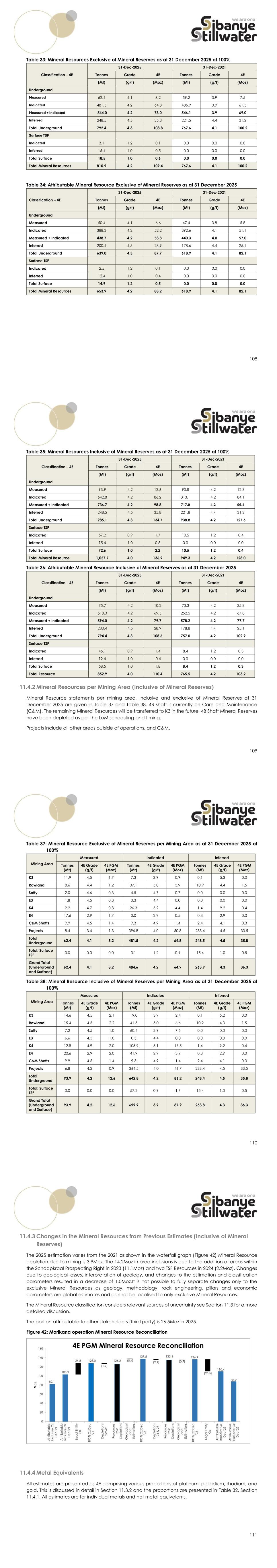 108 Table 33: Mineral Resources Exclusive of Mineral Reserves as at 31 December 2025 at 100% Classification – 4E 31-Dec-2025 31-Dec-2021 Tonnes Grade 4E Tonnes Grade 4E (Mt) (g/t) (Moz) (Mt) (g/t) (Moz) Underground Measured 62.4 4.1 8.2 59.2 3.9 7.5 Indicated 481.5 4.2 64.8 486.9 3.9 61.5 Measured + Indicated 544.0 4.2 73.0 546.1 3.9 69.0 Inferred 248.5 4.5 35.8 221.5 4.4 31.2 Total Underground 792.4 4.3 108.8 767.6 4.1 100.2 Surface TSF Indicated 3.1 1.2 0.1 0.0 0.0 0.0 Inferred 15.4 1.0 0.5 0.0 0.0 0.0 Total Surface 18.5 1.0 0.6 0.0 0.0 0.0 Total Mineral Resources 810.9 4.2 109.4 767.6 4.1 100.2 Table 34: Attributable Mineral Resource Exclusive of Mineral Reserves as at 31 December 2025 Classification – 4E 31-Dec-2025 31-Dec-2021 Tonnes Grade 4E Tonnes Grade 4E (Mt) (g/t) (Moz) (Mt) (g/t) (Moz) Underground Measured 50.4 4.1 6.6 47.4 3.8 5.8 Indicated 388.3 4.2 52.2 392.6 4.1 51.1 Measured + Indicated 438.7 4.2 58.8 440.3 4.0 57.0 Inferred 200.4 4.5 28.9 178.6 4.4 25.1 Total Underground 639.0 4.3 87.7 618.9 4.1 82.1 Surface TSF Indicated 2.5 1.2 0.1 0.0 0.0 0.0 Inferred 12.4 1.0 0.4 0.0 0.0 0.0 Total Surface 14.9 1.2 0.5 0.0 0.0 0.0 Total Mineral Resources 653.9 4.2 88.2 618.9 4.1 82.1 109 Table 35: Mineral Resources Inclusive of Mineral Reserves as at 31 December 2025 at 100% Classification – 4E 31-Dec-2025 31-Dec-2021 Tonnes Grade 4E Tonnes Grade 4E (Mt) (g/t) (Moz) (Mt) (g/t) (Moz) Underground Measured 93.9 4.2 12.6 90.8 4.2 12.3 Indicated 642.8 4.2 86.2 313.1 4.2 84.1 Measured + Indicated 736.7 4.2 98.8 717.0 4.2 96.4 Inferred 248.5 4.5 35.8 221.8 4.4 31.2 Total Underground 985.1 4.3 134.7 938.8 4.2 127.6 Surface TSF Indicated 57.2 0.9 1.7 10.5 1.2 0.4 Inferred 15.4 1.0 0.5 0.0 0.0 0.0 Total Surface 72.6 1.0 2.2 10.5 1.2 0.4 Total Mineral Resource 1,057.7 4.0 136.9 949.3 4.2 128.0 Table 36: Attributable Mineral Resource Inclusive of Mineral Reserves as at 31 December 2025 Classification – 4E 31-Dec-2025 31-Dec-2021 Tonnes Grade 4E Tonnes Grade 4E (Mt) (g/t) (Moz) (Mt) (g/t) (Moz) Underground Measured 75.7 4.2 10.2 73.3 4.2 35.8 Indicated 518.3 4.2 69.5 252.5 4.2 67.8 Measured + Indicated 594.0 4.2 79.7 578.2 4.2 77.7 Inferred 200.4 4.5 28.9 178.8 4.4 25.1 Total Underground 794.4 4.3 108.6 757.0 4.2 102.9 Surface TSF Indicated 46.1 0.9 1.4 8.4 1.2 0.3 Inferred 12.4 1.0 0.4 0.0 0.0 0.0 Total Surface 58.5 1.0 1.8 8.4 1.2 0.3 Total Resource 852.9 4.0 110.4 765.5 4.2 103.2 11.4.2 Mineral Resources per Mining Area (Inclusive of Mineral Reserves) Mineral Resource statements per mining area, inclusive and exclusive of Mineral Reserves at 31 December 2025 are given in Table 37 and Table 38. 4B shaft is currently on Care and Maintenance (C&M). The remaining Mineral Resources will be transferred to K3 in the future. 4B Shaft Mineral Reserves have been depleted as per the LoM scheduling and timing. Projects include all other areas outside of operations, and C&M. 110 Table 37: Mineral Resource Exclusive of Mineral Reserves per Mining Area as at 31 December 2025 at 100% Mining Area Measured Indicated Inferred Tonnes (Mt) 4E Grade (g/t) 4E PGM (Moz) Tonnes (Mt) 4E Grade (g/t) 4E PGM (Moz) Tonnes (Mt) 4E Grade (g/t) 4E PGM (Moz) K3 11.9 4.5 1.7 7.3 3.9 0.9 0.1 5.3 0.0 Rowland 8.6 4.4 1.2 37.1 5.0 5.9 10.9 4.4 1.5 Saffy 2.0 4.6 0.3 4.5 4.7 0.7 0.0 0.0 0.0 E3 1.8 4.5 0.3 0.3 4.4 0.0 0.0 0.0 0.0 K4 2.2 4.7 0.3 26.3 5.2 4.4 1.4 9.2 0.4 E4 17.6 2.9 1.7 0.0 2.9 0.5 0.3 2.9 0.0 C&M Shafts 9.9 4.5 1.4 9.3 4.9 1.4 2.4 4.1 0.3 Projects 8.4 3.4 1.3 396.8 4.0 50.8 233.4 4.5 33.5 Total Underground 62.4 4.1 8.2 481.5 4.2 64.8 248.5 4.5 35.8 Total: Surface TSF 0.0 0.0 0.0 3.1 1.2 0.1 15.4 1.0 0.5 Grand Total (Underground and Surface) 62.4 4.1 8.2 484.6 4.2 64.9 263.9 4.3 36.3 Table 38: Mineral Resource Inclusive of Mineral Reserves per Mining Area as at 31 December 2025 at 100% Mining Area Measured Indicated Inferred Tonnes (Mt) 4E Grade (g/t) 4E PGM (Moz) Tonnes (Mt) 4E Grade (g/t) 4E PGM (Moz) Tonnes (Mt) 4E Grade (g/t) 4E PGM (Moz) K3 14.6 4.5 2.1 19.0 3.9 2.4 0.1 5.2 0.0 Rowland 15.4 4.5 2.2 41.5 5.0 6.6 10.9 4.3 1.5 Saffy 7.2 4.5 1.0 60.4 3.9 7.5 0.0 0.0 0.0 E3 6.6 4.5 1.0 0.3 4.4 0.0 0.0 0.0 0.0 K4 12.8 4.9 2.0 105.9 5.1 17.5 1.4 9.2 0.4 E4 20.6 2.9 2.0 41.9 2.9 3.9 0.3 2.9 0.0 C&M Shafts 9.9 4.5 1.4 9.3 4.9 1.4 2.4 4.1 0.3 Projects 6.8 4.2 0.9 364.5 4.0 46.7 233.4 4.5 33.5 Total Underground 93.9 4.2 12.6 642.8 4.2 86.2 248.4 4.5 35.8 Total: Surface TSF 0.0 0.0 0.0 57.2 0.9 1.7 15.4 1.0 0.5 Grand Total (Underground and Surface) 93.9 4.2 12.6 699.9 3.9 87.9 263.8 4.3 36.3 111 11.4.3 Changes in the Mineral Resources from Previous Estimates (Inclusive of Mineral Reserves) The 2025 estimation varies from the 2021 as shown in the waterfall graph (Figure 42) Mineral Resource depletion due to mining is 3.9Moz. The 14.2Moz in area inclusions is due to the addition of areas within the Schaapkraal Prospecting Right in 2023 (11.1Moz) and two TSF Resources in 2024 (2.2Moz). Changes due to geological losses, interpretation of geology, and changes to the estimation and classification parameters resulted in a decrease of 1.0Moz.It is not possible to fully separate changes only to the exclusive Mineral Resources as geology, methodology, rock engineering, pillars and economic parameters are global estimates and cannot be localised to only exclusive Mineral Resources. The Mineral Resource classification considers relevant sources of uncertainty see Section 11.3 for a more detailed discussion. The portion attributable to other stakeholders (third party) is 26.5Moz in 2025. Figure 42: Marikana operation Mineral Resource Reconciliation 11.4.4 Metal Equivalents All estimates are presented as 4E comprising various proportions of platinum, palladium, rhodium, and gold. This is discussed in detail in Section 11.3.2 and the proportions are presented in Table 32, Section 11.4.1. All estimates are for individual metals and not metal equivalents.