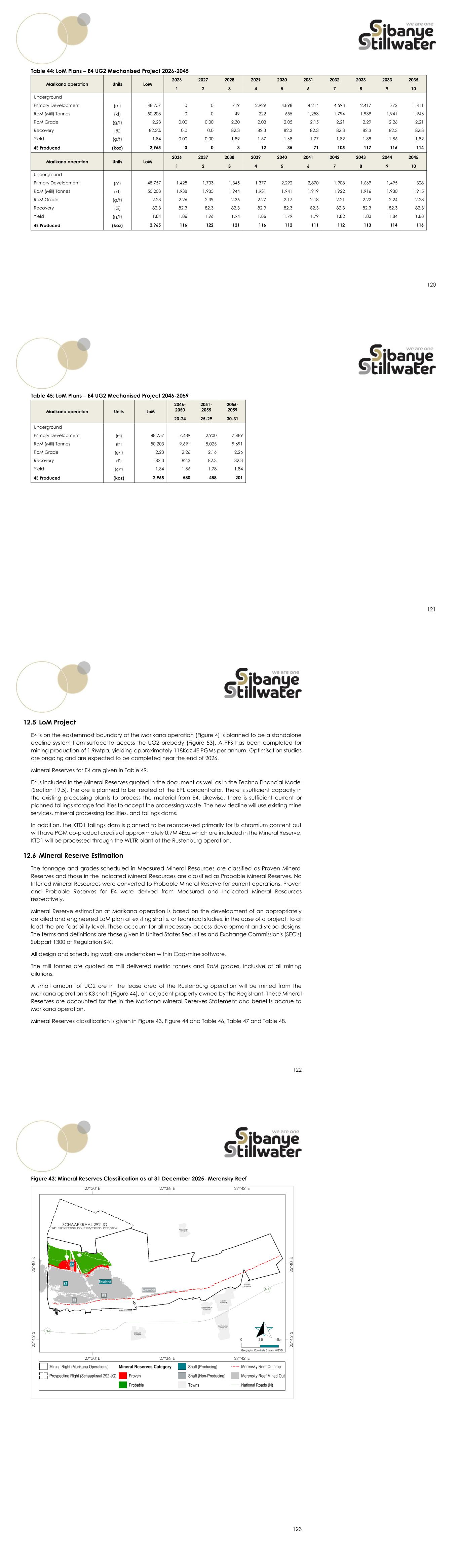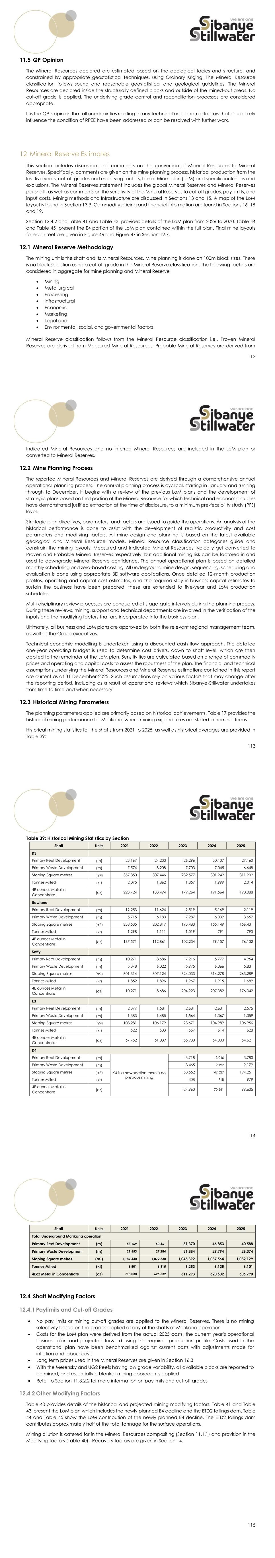 112 11.5 QP Opinion The Mineral Resources declared are estimated based on the geological facies and structure, and constrained by appropriate geostatistical techniques, using Ordinary Kriging. The Mineral Resource classification follows sound and reasonable geostatistical and geological guidelines. The Mineral Resources are declared inside the structurally defined blocks and outside of the mined-out areas. No cut-off grade is applied. The underlying grade control and reconciliation processes are considered appropriate. It is the QP’s opinion that all uncertainties relating to any technical or economic factors that could likely influence the condition of RPEE have been addressed or can be resolved with further work. 12 Mineral Reserve Estimates This section includes discussion and comments on the conversion of Mineral Resources to Mineral Reserves. Specifically, comments are given on the mine planning process, historical production from the last five years, cut-off grades and modifying factors, Life-of Mine- plan (LoM) and specific inclusions and exclusions. The Mineral Reserves statement includes the global Mineral Reserves and Mineral Reserves per shaft, as well as comments on the sensitivity of the Mineral Reserves to cut-off grades, pay-limits, and input costs. Mining methods and Infrastructure are discussed in Sections 13 and 15. A map of the LoM layout is found in Section 13.9. Commodity pricing and financial information are found in Sections 16, 18 and 19. Section 12.4.2 and Table 41 and Table 43. provides details of the LoM plan from 2026 to 2070. Table 44 and Table 45 present the E4 portion of the LoM plan contained within the full plan. Final mine layouts for each reef are given in Figure 46 and Figure 47 in Section 12.7. 12.1 Mineral Reserve Methodology The mining unit is the shaft and its Mineral Resources. Mine planning is done on 100m block sizes. There is no block selection using a cut-off grade in the Mineral Reserve classification. The following factors are considered in aggregate for mine planning and Mineral Reserve • Mining • Metallurgical • Processing • Infrastructural • Economic • Marketing • Legal and • Environmental, social, and governmental factors Mineral Reserve classification follows from the Mineral Resource classification i.e., Proven Mineral Reserves are derived from Measured Mineral Resources, Probable Mineral Reserves are derived from 113 Indicated Mineral Resources and no Inferred Mineral Resources are included in the LoM plan or converted to Mineral Reserves. 12.2 Mine Planning Process The reported Mineral Resources and Mineral Reserves are derived through a comprehensive annual operational planning process. The annual planning process is cyclical, starting in January and running through to December. It begins with a review of the previous LoM plans and the development of strategic plans based on that portion of the Mineral Resource for which technical and economic studies have demonstrated justified extraction at the time of disclosure, to a minimum pre-feasibility study (PFS) level. Strategic plan directives, parameters, and factors are issued to guide the operations. An analysis of the historical performance is done to assist with the development of realistic productivity and cost parameters and modifying factors. All mine design and planning is based on the latest available geological and Mineral Resource models. Mineral Resource classification categories guide and constrain the mining layouts. Measured and Indicated Mineral Resources typically get converted to Proven and Probable Mineral Reserves respectively, but additional mining risk can be factored in and used to downgrade Mineral Reserve confidence. The annual operational plan is based on detailed monthly scheduling and zero-based costing. All underground mine design, sequencing, scheduling and evaluation is done using appropriate 3D software applications. Once detailed 12-month production profiles, operating and capital cost estimates, and the required stay-in-business capital estimates to sustain the business have been prepared, these are extended to five-year and LoM production schedules. Multi-disciplinary review processes are conducted at stage-gate intervals during the planning process. During these reviews, mining, support and technical departments are involved in the verification of the inputs and the modifying factors that are incorporated into the business plan. Ultimately, all business and LoM plans are approved by both the relevant regional management team, as well as the Group executives. Technical economic modelling is undertaken using a discounted cash-flow approach. The detailed one-year operating budget is used to determine cost drivers, down to shaft level, which are then applied to the remainder of the LoM plan. Sensitivities are calculated based on a range of commodity prices and operating and capital costs to assess the robustness of the plan. The financial and technical assumptions underlying the Mineral Resources and Mineral Reserves estimations contained in this report are current as at 31 December 2025. Such assumptions rely on various factors that may change after the reporting period, including as a result of operational reviews which Sibanye-Stillwater undertakes from time to time and when necessary. 12.3 Historical Mining Parameters The planning parameters applied are primarily based on historical achievements. Table 17 provides the historical mining performance for Marikana, where mining expenditures are stated in nominal terms. Historical mining statistics for the shafts from 2021 to 2025, as well as historical averages are provided in Table 39: 114 Table 39: Historical Mining Statistics by Section Shaft Units 2021 2022 2023 2024 2025 K3 Primary Reef Development (m) 23,167 24,233 26,296 30,107 27,160 Primary Waste Development (m) 7,574 8,208 7,703 7,045 6,648 Stoping Square metres (m2) 357,850 307,446 282,577 301,242 311,202 Tonnes Milled (kt) 2,