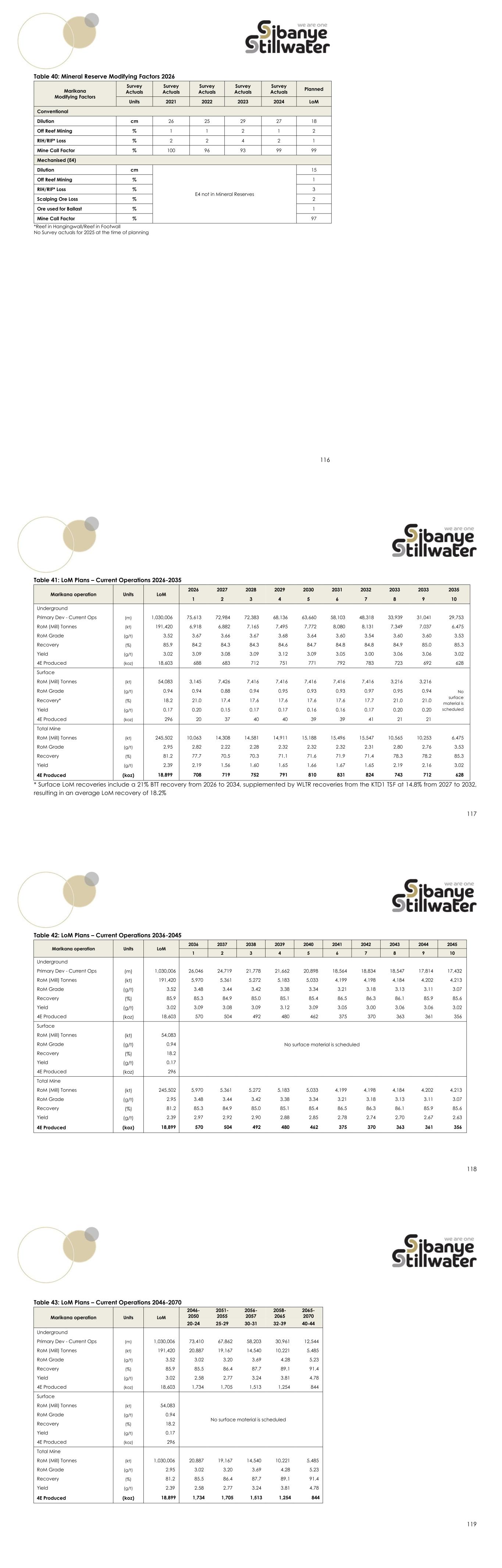 116 Table 40: Mineral Reserve Modifying Factors 2026 Marikana Modifying Factors Survey Actuals Survey Actuals Survey Actuals Survey Actuals Survey Actuals Planned Units 2021 2022 2023 2024 LoM Conventional Dilution cm 26 25 29 27 18 Off Reef Mining % 1 1 2 1 2 RIH/RIF* Loss % 2 2 4 2 1 Mine Call Factor % 100 96 93 99 99 Mechanised (E4) Dilution cm E4 not in Mineral Reserves 15 Off Reef Mining % 1 RIH/RIF* Loss % 3 Scalping Ore Loss % 2 Ore used for Ballast % 1 Mine Call Factor % 97 *Reef in Hangingwall/Reef in Footwall No Survey actuals for 2025 at the time of planning 117 Table 41: LoM Plans – Current Operations 2026-2035 Marikana operation Units LoM 2026 2027 2028 2029 2030 2031 2032 2033 2033 2035 1 2 3 4 5 6 7 8 9 10 Underground Primary Dev - Current Ops (m) 1,030,006 75,613 72,984 72,383 68,136 63,660 58,103 48,318 33,939 31,041 29,753 RoM (Mill) Tonnes (kt) 191,420 6,918 6,882 7,165 7,495 7,772 8,080 8,131 7,349 7,037 6,475 RoM Grade (g/t) 3.52 3.67 3.66 3.67 3.68 3.64 3.60 3.54 3.60 3.60 3.53 Recovery (%) 85.9 84.2 84.3 84.3 84.6 84.7 84.8 84.8 84.9 85.0 85.3 Yield (g/t) 3.02 3.09 3.08 3.09 3.12 3.09 3.05 3.00 3.06 3.06 3.02 4E Produced (koz) 18,603 688 683 712 751 771 792 783 723 692 628 Surface RoM (Mill) Tonnes (kt) 54,083 3,145 7,426 7,416 7,416 7,416 7,416 7,416 3,216 3,216 No surface material is scheduled RoM Grade (g/t) 0.94 0.94 0.88 0.94 0.95 0.93 0.93 0.97 0.95 0.94 Recovery* (%) 18.2 21.0 17.4 17.6 17.6 17.6 17.6 17.7 21.0 21.0 Yield (g/t) 0.17 0.20 0.15 0.17 0.17 0.16 0.16 0.17 0.20 0.20 4E Produced (koz) 296 20 37 40 40 39 39 41 21 21 Total Mine RoM (Mill) Tonnes (kt) 245,502 10,063 14,308 14,581 14,911 15,188 15,496 15,547 10,565 10,253 6,475 RoM Grade (g/t) 2.95 2.82 2.22 2.28 2.32 2.32 2.32 2.31 2.80 2.76 3.53 Recovery (%) 81.2 77.7 70.5 70.3 71.1 71.6 71.9 71.4 78.3 78.2 85.3 Yield (g/t) 2.39 2.19 1.56 1.60 1.65 1.66 1.67 1.65 2.19 2.16 3.02 4E Produced (koz) 18,899 708 719 752 791 810 831 824 743 712 628 * Surface LoM recoveries include a 21% BTT recovery from 2026 to 2034, supplemented by WLTR recoveries from the KTD1 TSF at 14.8% from 2027 to 2032, resulting in an average LoM recovery of 18.2% 118 Table 42: LoM Plans – Current Operations 2036-2045 Marikana operation Units LoM 2036 2037 2038 2039 2040 2041 2042 2043 2044 2045 1 2 3 4 5 6 7 8 9 10 Underground Primary Dev - Current Ops (m) 1,030,006 26,046 24,719 21,778 21,662 20,898 18,564 18,834 18,547 17,814 17,432 RoM (Mill) Tonnes (kt) 191,420 5,970 5,361 5,272 5,183 5,033 4,199 4,198 4,184 4,202 4,213 RoM Grade (g/t) 3.52 3.48 3.44 3.42 3.38 3.34 3.21 3.18 3.13 3.11 3.07 Recovery (%) 85.9 85.3 84.9 85.0 85.1 85.4 86.5 86.3 86.1 85.9 85.6 Yield (g/t) 3.02 3.09 3.08 3.09 3.12 3.09 3.05 3.00 3.06 3.06 3.02 4E Produced (koz) 18,603 570 504 492 480 462 375 370 363 361 356 Surface No surface material is scheduled RoM (Mill) Tonnes (kt) 54,083 RoM Grade (g/t) 0.94 Recovery (%) 18.2 Yield (g/t) 0.17 4E Produced (koz) 296 Total Mine RoM (Mill) Tonnes (kt) 245,502 5,970 5,361 5,272 5,183 5,033 4,199 4,198 4,184 4,202 4,213 RoM Grade (g/t) 2.95 3.48 3.44 3.42 3.38 3.34 3.21 3.18 3.13 3.11 3.07 Recovery (%) 81.2 85.3 84.9 85.0 85.1 85.4 86.5 86.3 86.1 85.9 85.6 Yield (g/t) 2.39 2.97 2.92 2.90 2.88 2.85 2.78 2.74 2.70 2.67 2.63 4E Produced (koz) 18,899 570 504 492 480 462 375 370 363 361 356 119 Table 43: LoM Plans – Current Operations 2046-2070 Marikana operation Units LoM 2046- 2050 2051- 2055 2056- 2057 2058- 2065 2065- 2070 20-24 25-29 30-31 32-39 40-44 Underground Primary Dev - Current Ops (m) 1,030,006 73,410 67,862 58,203 30,961 12,544 RoM (Mill) Tonnes (kt) 191,420 20,887 19,167 14,540 10,221 5,485 RoM Grade (g/t) 3.52 3.02 3.20 3.69 4.28 5.23 Recovery (%) 85.9 85.5 86.4 87.7 89.1 91.4 Yield (g/t) 3.02 2.58 2.77 3.24 3.81 4.78 4E Produced (koz) 18,603 1,734 1,705 1,513 1,254 844 Surface No surface material is scheduled RoM (Mill) Tonnes (kt) 54,083 RoM Grade (g/t) 0.94 Recovery (%) 18.2 Yield (g/t) 0.17 4E Produced (koz) 296 Total Mine RoM (Mill) Tonnes (kt) 1,030,006 20,887 19,167 14,540 10,221 5,485 RoM Grade (g/t) 2.95 3.02 3.20 3.69 4.28 5.23 Recovery (%) 81.2 85.5 86.4 87.7 89.1 91.4 Yield (g/t) 2.39 2.58 2.77 3.24 3.81 4.78 4E Produced (koz) 18,899 1,734 1,705 1,513 1,254 844
