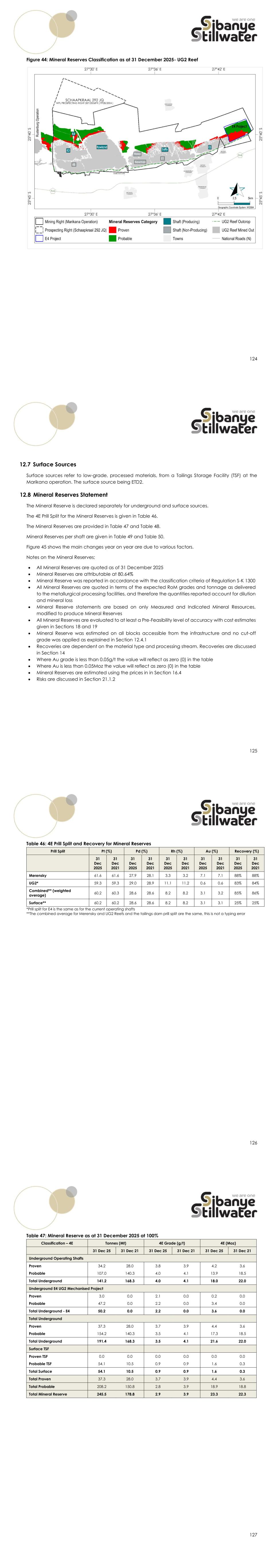 124 Figure 44: Mineral Reserves Classification as at 31 December 2025- UG2 Reef 125 12.7 Surface Sources Surface sources refer to low-grade, processed materials, from a Tailings Storage Facility (TSF) at the Marikana operation. The surface source being ETD2. 12.8 Mineral Reserves Statement The Mineral Reserve is declared separately for underground and surface sources. The 4E Prill Split for the Mineral Reserves is given in Table 46. The Mineral Reserves are provided in Table 47 and Table 48. Mineral Reserves per shaft are given in Table 49 and Table 50. Figure 45 shows the main changes year on year are due to various factors. Notes on the Mineral Reserves; • All Mineral Reserves are quoted as of 31 December 2025 • Mineral Reserves are attributable at 80.64% • Mineral Reserve was reported in accordance with the classification criteria of Regulation S-K 1300 • All Mineral Reserves are quoted in terms of the expected RoM grades and tonnage as delivered to the metallurgical processing facilities, and therefore the quantities reported account for dilution and mineral loss • Mineral Reserve statements are based on only Measured and Indicated Mineral Resources, modified to produce Mineral Reserves • All Mineral Reserves are evaluated to at least a Pre-Feasibility level of accuracy with cost estimates given in Sections 18 and 19 • Mineral Reserve was estimated on all blocks accessible from the infrastructure and no cut-off grade was applied as explained in Section 12.4.1 • Recoveries are dependent on the material type and processing stream. Recoveries are discussed in Section 14 • Where Au grade is less than 0.05g/t the value will reflect as zero (0) in the table • Where Au is less than 0.05Moz the value will reflect as zero (0) in the table • Mineral Reserves are estimated using the prices in in Section 16.4 • Risks are discussed in Section 21.1.2 126 Table 46: 4E Prill Split and Recovery for Mineral Reserves Prill Split Pt (%) Pd (%) Rh (%) Au (%) Recovery (%) 31 Dec 2025 31 Dec 2021 31 Dec 2025 31 Dec 2021 31 Dec 2025 31 Dec 2021 31 Dec 2025 31 Dec 2021 31 Dec 2025 31 Dec 2021 Merensky 61.6 61.6 27.9 28.1 3.3 3.2 7.1 7.1 88% 88% UG2* 59.3 59.3 29.0 28.9 11.1 11.2 0.6 0.6 83% 84% Combined** (weighted average) 60.2 60.3 28.6 28.6 8.2 8.2 3.1 3.2 85% 86% Surface** 60.2 60.2 28.6 28.6 8.2 8.2 3.1 3.1 25% 25% *Prill split for E4 is the same as for the current operating shafts **The combined average for Merensky and UG2 Reefs and the tailings dam prill split are the same, this is not a typing error 127 Table 47: Mineral Reserve as at 31 December 2025 at 100% Classification – 4E Tonnes (Mt) 4E Grade (g/t) 4E (Moz) 31 Dec 25 31 Dec 21 31 Dec 25 31 Dec 21 31 Dec 25 31 Dec 21 Underground Operating Shafts Proven 34.2 28.0 3.8 3.9 4.2 3.6 Probable 107.0 140.3 4.0 4.1 13.9 18.5 Total Underground 141.2 168.3 4.0 4.1 18.0 22.0 Underground E4 UG2 Mechanised Project Proven 3.0 0.0 2.1 0.0 0.2 0.0 Probable 47.2 0.0 2.2 0.0 3.4 0.0 Total Underground - E4 50.2 0.0 2.2 0.0 3.6 0.0 Total Underground Proven 37.3 28.0 3.7 3.9 4.4 3.6 Probable 154.2 140.3 3.5 4.1 17.3 18.5 Total Underground 191.4 168.3 3.5 4.1 21.6 22.0 Surface TSF Proven TSF 0.0 0.0 0.0 0.0 0.0 0.0 Probable TSF 54.1 10.5 0.9 0.9 1.6 0.3 Total Surface 54.1 10.5 0.9 0.9 1.6 0.3 Total Proven 37.3 28.0 3.7 3.9 4.4 3.6 Total Probable 208.2 150.8 2.8 3.9 18.9 18.8 Total Mineral Reserve 245.5 178.8 2.9 3.9 23.3 22.3