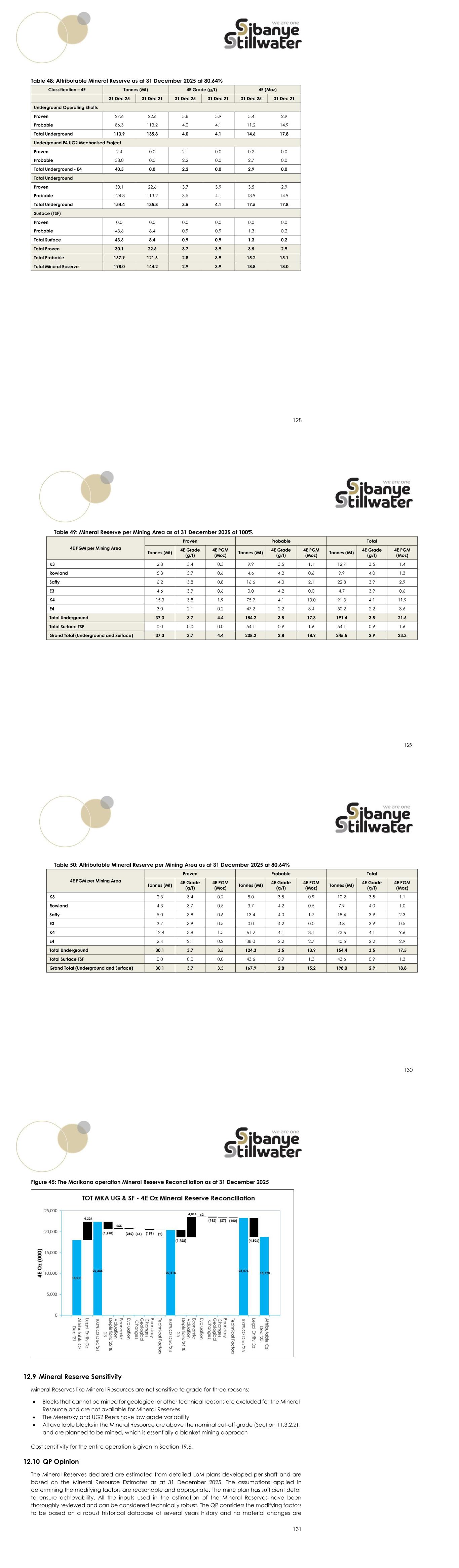 128 Table 48: Attributable Mineral Reserve as at 31 December 2025 at 80.64% Classification – 4E Tonnes (Mt) 4E Grade (g/t) 4E (Moz) 31 Dec 25 31 Dec 21 31 Dec 25 31 Dec 21 31 Dec 25 31 Dec 21 Underground Operating Shafts Proven 27.6 22.6 3.8 3.9 3.4 2.9 Probable 86.3 113.2 4.0 4.1 11.2 14.9 Total Underground 113.9 135.8 4.0 4.1 14.6 17.8 Underground E4 UG2 Mechanised Project Proven 2.4 0.0 2.1 0.0 0.2 0.0 Probable 38.0 0.0 2.2 0.0 2.7 0.0 Total Underground - E4 40.5 0.0 2.2 0.0 2.9 0.0 Total Underground Proven 30.1 22.6 3.7 3.9 3.5 2.9 Probable 124.3 113.2 3.5 4.1 13.9 14.9 Total Underground 154.4 135.8 3.5 4.1 17.5 17.8 Surface (TSF) Proven 0.0 0.0 0.0 0.0 0.0 0.0 Probable 43.6 8.4 0.9 0.9 1.3 0.2 Total Surface 43.6 8.4 0.9 0.9 1.3 0.2 Total Proven 30.1 22.6 3.7 3.9 3.5 2.9 Total Probable 167.9 121.6 2.8 3.9 15.2 15.1 Total Mineral Reserve 198.0 144.2 2.9 3.9 18.8 18.0 129 Table 49: Mineral Reserve per Mining Area as at 31 December 2025 at 100% 4E PGM per Mining Area Proven Probable Total Tonnes (Mt) 4E Grade (g/t) 4E PGM (Moz) Tonnes (Mt) 4E Grade (g/t) 4E PGM (Moz) Tonnes (Mt) 4E Grade (g/t) 4E PGM (Moz) K3 2.8 3.4 0.3 9.9 3.5 1.1 12.7 3.5 1.4 Rowland 5.3 3.7 0.6 4.6 4.2 0.6 9.9 4.0 1.3 Saffy 6.2 3.8 0.8 16.6 4.0 2.1 22.8 3.9 2.9 E3 4.6 3.9 0.6 0.0 4.2 0.0 4.7 3.9 0.6 K4 15.3 3.8 1.9 75.9 4.1 10.0 91.3 4.1 11.9 E4 3.0 2.1 0.2 47.2 2.2 3.4 50.2 2.2 3.6 Total Underground 37.3 3.7 4.4 154.2 3.5 17.3 191.4 3.5 21.6 Total Surface TSF 0.0 0.0 0.0 54.1 0.9 1.6 54.1 0.9 1.6 Grand Total (Underground and Surface) 37.3 3.7 4.4 208.2 2.8 18.9 245.5 2.9 23.3 130 Table 50: Attributable Mineral Reserve per Mining Area as at 31 December 2025 at 80.64% 4E PGM per Mining Area Proven Probable Total Tonnes (Mt) 4E Grade (g/t) 4E PGM (Moz) Tonnes (Mt) 4E Grade (g/t) 4E PGM (Moz) Tonnes (Mt) 4E Grade (g/t) 4E PGM (Moz) K3 2.3 3.4 0.2 8.0 3.5 0.9 10.2 3.5 1.1 Rowland 4.3 3.7 0.5 3.7 4.2 0.5 7.9 4.0 1.0 Saffy 5.0 3.8 0.6 13.4 4.0 1.7 18.4 3.9 2.3 E3 3.7 3.9 0.5 0.0 4.2 0.0 3.8 3.9 0.5 K4 12.4 3.8 1.5 61.2 4.1 8.1 73.6 4.1 9.6 E4 2.4 2.1 0.2 38.0 2.2 2.7 40.5 2.2 2.9 Total Underground 30.1 3.7 3.5 124.3 3.5 13.9 154.4 3.5 17.5 Total Surface TSF 0.0 0.0 0.0 43.6 0.9 1.3 43.6 0.9 1.3 Grand Total (Underground and Surface) 30.1 3.7 3.5 167.9 2.8 15.2 198.0 2.9 18.8 131 Figure 45: The Marikana operation Mineral Reserve Reconciliation as at 31 December 2025 12.9 Mineral Reserve Sensitivity Mineral Reserves like Mineral Resources are not sensitive to grade for three reasons: • Blocks that cannot be mined for geological or other technical reasons are excluded for the Mineral Resource and are not available for Mineral Reserves • The Merensky and UG2 Reefs have low grade variability • All available blocks in the Mineral Resource are above the nominal cut-off grade (Section 11.3.2.2), and are planned to be mined, which is essentially a blanket mining approach Cost sensitivity for the entire operation is given in Section 19.6. 12.10 QP Opinion The Mineral Reserves declared are estimated from detailed LoM plans developed per shaft and are based on the Mineral Resource Estimates as at 31 December 2025. The assumptions applied in determining the modifying factors are reasonable and appropriate. The mine plan has sufficient detail to ensure achievability. All the inputs used in the estimation of the Mineral Reserves have been thoroughly reviewed and can be considered technically robust. The QP considers the modifying factors to be based on a robust historical database of several years history and no material changes are