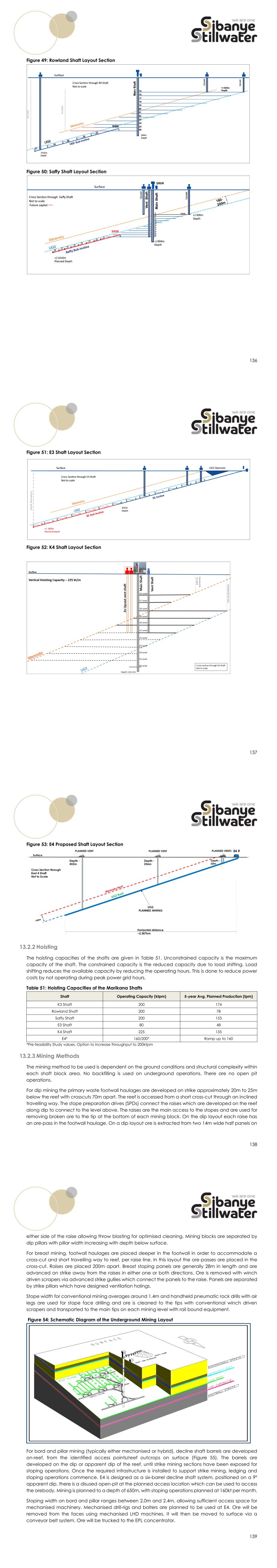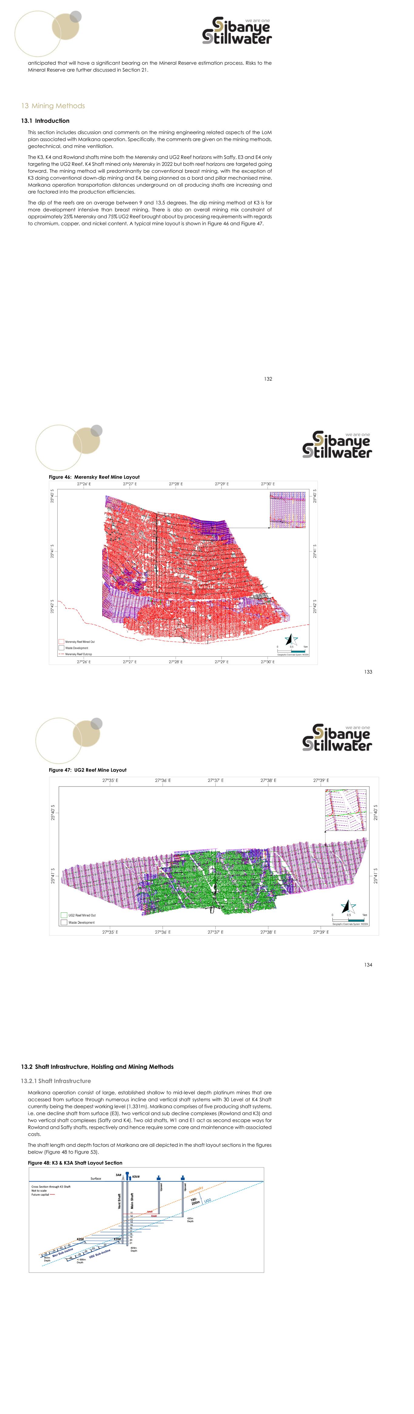 132 anticipated that will have a significant bearing on the Mineral Reserve estimation process. Risks to the Mineral Reserve are further discussed in Section 21. 13 Mining Methods 13.1 Introduction This section includes discussion and comments on the mining engineering related aspects of the LoM plan associated with Marikana operation. Specifically, the comments are given on the mining methods, geotechnical, and mine ventilation. The K3, K4 and Rowland shafts mine both the Merensky and UG2 Reef horizons with Saffy, E3 and E4 only targeting the UG2 Reef. K4 Shaft mined only Merensky in 2022 but both reef horizons are targeted going forward. The mining method will predominantly be conventional breast mining, with the exception of K3 doing conventional down-dip mining and E4, being planned as a bord and pillar mechanised mine. Marikana operation transportation distances underground on all producing shafts are increasing and are factored into the production efficiencies. The dip of the reefs are on average between 9 and 13.5 degrees. The dip mining method at K3 is far more development intensive than breast mining. There is also an overall mining mix constraint of approximately 25% Merensky and 75% UG2 Reef brought about by processing requirements with regards to chromium, copper, and nickel content. A typical mine layout is shown in Figure 46 and Figure 47. 133 Figure 46: Merensky Reef Mine Layout 134 Figure 47: UG2 Reef Mine Layout 13.2 Shaft Infrastructure, Hoisting and Mining Methods 13.2.1 Shaft Infrastructure Marikana operation consist of large, established shallow to mid-level depth platinum mines that are accessed from surface through numerous incline and vertical shaft systems with 30 Level at K4 Shaft currently being the deepest working level (1,331m). Marikana comprises of five producing shaft systems, i.e. one decline shaft from surface (E3), two vertical and sub decline complexes (Rowland and K3) and two vertical shaft complexes (Saffy and K4). Two old shafts, W1 and E1 act as second escape ways for Rowland and Saffy shafts, respectively and hence require some care and maintenance with associated costs. The shaft length and depth factors at Marikana are all depicted in the shaft layout sections in the figures below (Figure 48 to Figure 53). Figure 48: K3 & K3A Shaft Layout Section