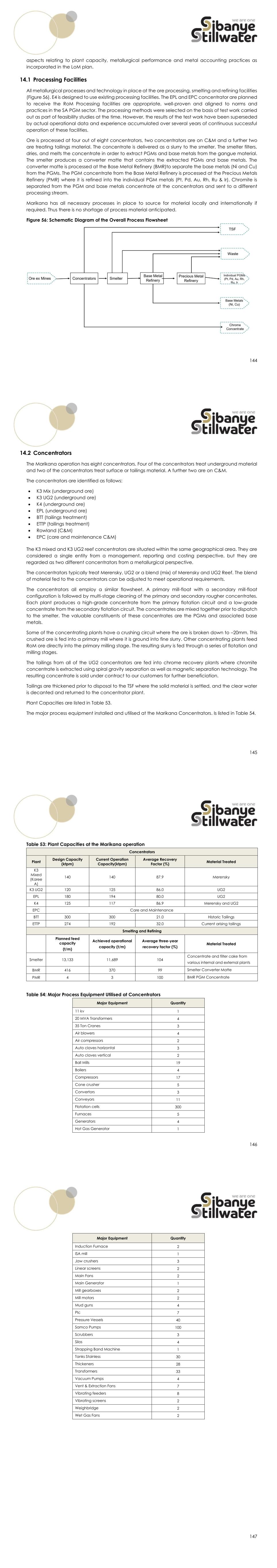 144 aspects relating to plant capacity, metallurgical performance and metal accounting practices as incorporated in the LoM plan. 14.1 Processing Facilities All metallurgical processes and technology in place at the ore processing, smelting and refining facilities (Figure 56). E4 is designed to use existing processing facilities. The EPL and EPC concentrator are planned to receive the RoM Processing facilities are appropriate, well-proven and aligned to norms and practices in the SA PGM sector. The processing methods were selected on the basis of test work carried out as part of feasibility studies at the time. However, the results of the test work have been superseded by actual operational data and experience accumulated over several years of continuous successful operation of these facilities. Ore is processed at four out of eight concentrators, two concentrators are on C&M and a further two are treating tailings material. The concentrate is delivered as a slurry to the smelter. The smelter filters, dries, and melts the concentrate in order to extract PGMs and base metals from the gangue material. The smelter produces a converter matte that contains the extracted PGMs and base metals. The converter matte is processed at the Base Metal Refinery (BMR)to separate the base metals (Ni and Cu) from the PGMs. The PGM concentrate from the Base Metal Refinery is processed at the Precious Metals Refinery (PMR) where it is refined into the individual PGM metals (Pt, Pd, Au, Rh, Ru & Ir). Chromite is separated from the PGM and base metals concentrate at the concentrators and sent to a different processing stream. Marikana has all necessary processes in place to source for material locally and internationally if required. Thus there is no shortage of process material anticipated. Figure 56: Schematic Diagram of the Overall Process Flowsheet 145 14.2 Concentrators The Marikana operation has eight concentrators. Four of the concentrators treat underground material and two of the concentrators treat surface or tailings material. A further two are on C&M. The concentrators are identified as follows: • K3 Mix (underground ore) • K3 UG2 (underground ore) • K4 (underground ore) • EPL (underground ore) • BTT (tailings treatment) • ETTP (tailings treatment) • Rowland (C&M) • EPC (care and maintenance C&M) The K3 mixed and K3 UG2 reef concentrators are situated within the same geographical area. They are considered a single entity from a management, reporting and costing perspective, but they are regarded as two different concentrators from a metallurgical perspective. The concentrators typically treat Merensky, UG2 or a blend (mix) of Merensky and UG2 Reef. The blend of material fed to the concentrators can be adjusted to meet operational requirements. The concentrators all employ a similar flowsheet. A primary mill-float with a secondary mill-float configuration is followed by multi-stage cleaning of the primary and secondary rougher concentrates. Each plant produces a high-grade concentrate from the primary flotation circuit and a low-grade concentrate from the secondary flotation circuit. The concentrates are mixed together prior to dispatch to the smelter. The valuable constituents of these concentrates are the PGMs and associated base metals. Some of the concentrating plants have a crushing circuit where the ore is broken down to –20mm. This crushed ore is fed into a primary mill where it is ground into fine slurry. Other concentrating plants feed RoM ore directly into the primary milling stage. The resulting slurry is fed through a series of flotation and milling stages. The tailings from all of the UG2 concentrators are fed into chrome recovery plants where chromite concentrate is extracted using spiral gravity separation as well as magnetic separation technology. The resulting concentrate is sold under contract to our customers for further beneficiation. Tailings are thickened prior to disposal to the TSF where the solid material is settled, and the clear water is decanted and returned to the concentrator plant. Plant Capacities are listed in Table 53. The major process equipment installed and utilised at the Marikana Concentrators. Is listed in Table 54. 146 Table 53: Plant Capacities at the Marikana operation Concentrators Plant Design Capacity (ktpm) Current Operation Capacity(ktpm) Average Recovery Factor (%) Material Treated K3 Mixed (Karee A) 140 140 87.9 Merensky K3 UG2 120 125 86.0 UG2 EPL 180 194 80.0 UG2 K4 125 117 86.9 Merensky and UG2 EPC Care and Maintenance BTT 300 300 21.0 Historic Tailings ETTP 274 192 32.0 Current arising tailings Smelting and Refining Planned feed capacity (t/m) Achieved operational capacity (t/m) Average three-year recovery factor (%) Material Treated Smelter 13,133 11,689 104 Concentrate and filter cake from various internal and external plants BMR 416 370 99 Smelter Converter Matte PMR 4 3 100 BMR PGM Concentrate Table 54: Major Process Equipment Utilised at Concentrators Major Equipment Quantity 11 kv 1 20 MVA Transformers 4 35 Ton Cranes 3 Air blowers 4 Air compressors 2 Auto claves horizontal 3 Auto claves vertical 2 Ball Mills 19 Boilers 4 Compressors 17 Cone crusher 5 Convertors 3 Conveyors 11 Flotation cells 300 Furnaces 5 Generators 4 Hot Gas Generator 1 147 Major Equipment Quantity Induction Furnace 2 ISA mill 1 Jaw crushers 3 Linear screens 2 Main Fans 2 Main Generator 1 Mill gearboxes 2 Mill motors 2 Mud guns 4 Plc 7 Pressure Vessels 40 Samco Pumps 100 Scrubbers 3 Silos 4 Strapping Band Machine 1 Tanks Stainless 30 Thickeners 28 Transformers 33 Vacuum Pumps 4 Vent & Extraction Fans 7 Vibrating feeders 8 Vibrating screens 2 Weighbridge 2 Wet Gas Fans 2