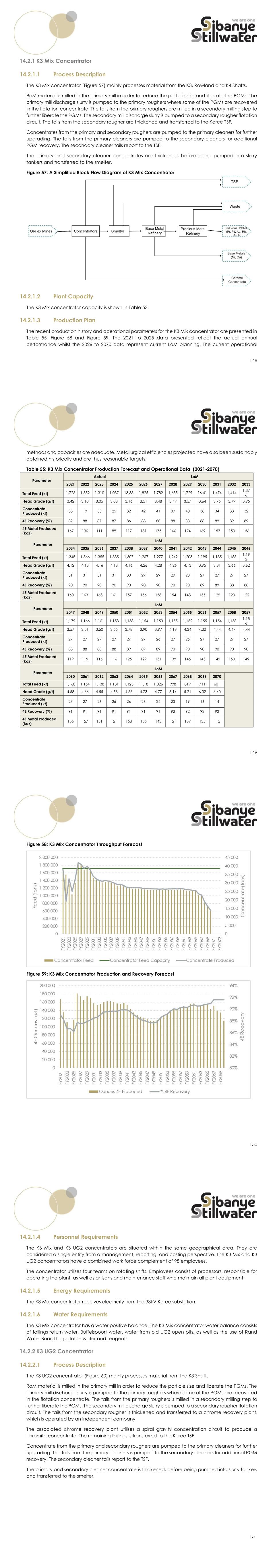 148 14.2.1 K3 Mix Concentrator 14.2.1.1 Process Description The K3 Mix concentrator (Figure 57) mainly processes material from the K3, Rowland and K4 Shafts. RoM material is milled in the primary mill in order to reduce the particle size and liberate the PGMs. The primary mill discharge slurry is pumped to the primary roughers where some of the PGMs are recovered in the flotation concentrate. The tails from the primary roughers are milled in a secondary milling step to further liberate the PGMs. The secondary mill discharge slurry is pumped to a secondary rougher flotation circuit. The tails from the secondary rougher are thickened and transferred to the Karee TSF. Concentrates from the primary and secondary roughers are pumped to the primary cleaners for further upgrading. The tails from the primary cleaners are pumped to the secondary cleaners for additional PGM recovery. The secondary cleaner tails report to the TSF. The primary and secondary cleaner concentrates are thickened, before being pumped into slurry tankers and transferred to the smelter. Figure 57: A Simplified Block Flow Diagram of K3 Mix Concentrator 14.2.1.2 Plant Capacity The K3 Mix concentrator capacity is shown in Table 53. 14.2.1.3 Production Plan The recent production history and operational parameters for the K3 Mix concentrator are presented in Table 55, Figure 58 and Figure 59. The 2021 to 2025 data presented reflect the actual annual performance whilst the 2026 to 2070 data represent current LoM planning. The current operational 149 methods and capacities are adequate. Metallurgical efficiencies projected have also been sustainably obtained historically and are thus reasonable targets. Table 55: K3 Mix Concentrator Production Forecast and Operational Data (2021-2070) Parameter Actual LoM 2021 2022 2023 2024 2025 2026 2027 2028 2029 2030 2031 2032 2033 Total Feed (kt) 1,726 1,552 1,310 1,037 13,38 1,825 1,782 1,685 1,729 16,41 1,474 1,414 1,37 6 Head Grade (g/t) 3.42 3.10 3.05 3.08 3.16 3.51 3.48 3.49 3.57 3.64 3.75 3.79 3.95 Concentrate Produced (kt) 38 19 33 25 32 42 41 39 40 38 34 33 32 4E Recovery (%) 89 88 87 87 86 88 88 88 88 88 89 89 89 4E Metal Produced (koz) 167 136 111 89 117 181 175 166 174 169 157 153 156 Parameter LoM 2034 2035 2036 2037 2038 2039 2040 2041 2042 2043 2044 2045 2046 Total Feed (kt) 1,348 1,366 1,355 1,335 1,307 1,267 1,277 1,249 1,203 1,195 1,185 1,188 1,19 2 Head Grade (g/t) 4.12 4.13 4.16 4.18 4.16 4.26 4.28 4.26 4.13 3.95 3.81 3.66 3.62 Concentrate Produced (kt) 31 31 31 31 30 29 29 29 28 27 27 27 27 4E Recovery (%) 90 90 90 90 90 90 90 90 90 89 89 88 88 4E Metal Produced (koz) 160 163 163 161 157 156 158 154 143 135 129 123 122 Parameter LoM 2047 2048 2049 2050 2051 2052 2053 2054 2055 2056 2057 2058 2059 Total Feed (kt) 1,179 1,166 1,161 1,158 1,158 1,154 1,150 1,155 1,152 1,155 1,154 1,158 1,15 6 Head Grade (g/t) 3.57 3.51 3.50 3.55 3.78 3.90 3.97 4.18 4.34 4.30 4.44 4.47 4.44 Concentrate Produced (kt) 27 27 27 27 27 27 26 27 26 27 27 27 27 4E Recovery (%) 88 88 88 88 89 89 89 90 90 90 90 90 90 4E Metal Produced (koz) 119 115 115 116 125 129 131 139 145 143 149 150 149 Parameter LoM 2060 2061 2062 2063 2064 2065 2066 2067 2068 2069 2070 Total Feed (kt) 1,168 1,154 1,138 1,131 1,123 11,18 1,026 998 819 711 601 Head Grade (g/t) 4.58 4.66 4.55 4.58 4.66 4.73 4.77 5.14 5.71 6.32 6.40 Concentrate Produced (kt) 27 27 26 26 26 26 24 23 19 16 14 4E Recovery (%) 91 91 91 91 91 91 91 92 92 92 92 4E Metal Produced (koz) 156 157 151 151 153 155 143 151 139 135 115 150 Figure 58: K3 Mix Concentrator Throughput Forecast Figure 59: K3 Mix Concentrator Production and Recovery Forecast 151 14.2.1.4 Personnel Requirements The K3 Mix and K3 UG2 concentrators are situated within the same geographical area. They are considered a single entity from a management, reporting, and costing perspective. The K3 Mix and K3 UG2 concentrators have a combined work force complement of 98 employees. The concentrator utilises four teams on rotating shifts. Employees consist of processors, responsible for operating the plant, as well as artisans and maintenance staff who maintain all plant equipment. 14.2.1.5 Energy Requirements The K3 Mix concentrator receives electricity from the 33kV Karee substation. 14.2.1.6 Water Requirements The K3 Mix concentrator has a water positive balance. The K3 Mix concentrator water balance consists of tailings return water, Buffelspoort water, water from old UG2 open pits, as well as the use of Rand Water Board for potable water and reagents. 14.2.2 K3 UG2 Concentrator 14.2.2.1 Process Description The K3 UG2 concentrator (Figure 60) mainly processes material from the K3 Shaft. RoM material is milled in the primary mill in order to reduce the particle size and liberate the PGMs. The primary mill discharge slurry is pumped to the primary roughers where some of the PGMs are recovered in the flotation concentrate. The tails from the primary roughers is milled in a secondary milling step to further liberate the PGMs. The secondary mill discharge slurry is pumped to a secondary rougher flotation circuit. The tails from the secondary rougher is thickened and transferred to a chrome recovery plant, which is operated by an independent company. The associated chrome recovery plant utilises a spiral gravity concentration circuit to produce a chromite concentrate. The remaining tailings is transferred to the Karee TSF. Concentrate from the primary and secondary roughers are pumped to the primary cleaners for further upgrading. The tails from the primary cleaners is pumped to the secondary cleaners for additional PGM recovery. The secondary cleaner tails report to the TSF. The primary and secondary cleaner concentrate is thickened, before being pumped into slurry tankers and transferred to the smelter.