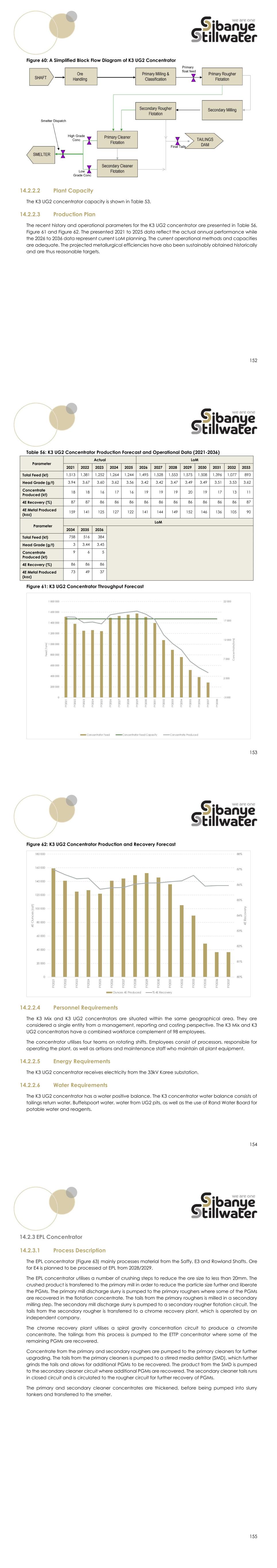 152 Figure 60: A Simplified Block Flow Diagram of K3 UG2 Concentrator 14.2.2.2 Plant Capacity The K3 UG2 concentrator capacity is shown in Table 53. 14.2.2.3 Production Plan The recent history and operational parameters for the K3 UG2 concentrator are presented in Table 56, Figure 61 and Figure 62. The presented 2021 to 2025 data reflect the actual annual performance while the 2026 to 2036 data represent current LoM planning. The current operational methods and capacities are adequate. The projected metallurgical efficiencies have also been sustainably obtained historically and are thus reasonable targets. 153 Table 56: K3 UG2 Concentrator Production Forecast and Operational Data (2021-2036) Parameter Actual LoM 2021 2022 2023 2024 2025 2026 2027 2028 2029 2030 2031 2032 2033 Total Feed (kt) 1,513 1,381 1,252 1,264 1,244 1,495 1,528 1,553 1,575 1,508 1,396 1,077 893 Head Grade (g/t) 3.94 3.67 3.60 3.62 3.56 3.42 3.42 3.47 3.49 3.49 3.51 3.53 3.62 Concentrate Produced (kt) 18 18 16 17 16 19 19 19 20 19 17 13 11 4E Recovery (%) 87 87 86 86 86 86 86 86 86 86 86 86 87 4E Metal Produced (koz) 159 141 125 127 122 141 144 149 152 146 136 105 90 Parameter LoM 2034 2035 2036 Total Feed (kt) 758 516 384 Head Grade (g/t) 3 3.44 3.45 Concentrate Produced (kt) 9 6 5 4E Recovery (%) 86 86 86 4E Metal Produced (koz) 73 49 37 Figure 61: K3 UG2 Concentrator Throughput Forecast 154 Figure 62: K3 UG2 Concentrator Production and Recovery Forecast 14.2.2.4 Personnel Requirements The K3 Mix and K3 UG2 concentrators are situated within the same geographical area. They are considered a single entity from a management, reporting and costing perspective. The K3 Mix and K3 UG2 concentrators have a combined workforce complement of 98 employees. The concentrator utilises four teams on rotating shifts. Employees consist of processors, responsible for operating the plant, as well as artisans and maintenance staff who maintain all plant equipment. 14.2.2.5 Energy Requirements The K3 UG2 concentrator receives electricity from the 33kV Karee substation. 14.2.2.6 Water Requirements The K3 UG2 concentrator has a water positive balance. The K3 concentrator water balance consists of tailings return water, Buffelspoort water, water from UG2 pits, as well as the use of Rand Water Board for potable water and reagents. 155 14.2.3 EPL Concentrator 14.2.3.1 Process Description The EPL concentrator (Figure 63) mainly processes material from the Saffy, E3 and Rowland Shafts. Ore for E4 is planned to be processed at EPL from 2028/2029. The EPL concentrator utilises a number of crushing steps to reduce the ore size to less than 20mm. The crushed product is transferred to the primary mill in order to reduce the particle size further and liberate the PGMs. The primary mill discharge slurry is pumped to the primary roughers where some of the PGMs are recovered in the flotation concentrate. The tails from the primary roughers is milled in a secondary milling step. The secondary mill discharge slurry is pumped to a secondary rougher flotation circuit. The tails from the secondary rougher is transferred to a chrome recovery plant, which is operated by an independent company. The chrome recovery plant utilises a spiral gravity concentration circuit to produce a chromite concentrate. The tailings from this process is pumped to the ETTP concentrator where some of the remaining PGMs are recovered. Concentrate from the primary and secondary roughers are pumped to the primary cleaners for further upgrading. The tails from the primary cleaners is pumped to a stirred media detritor (SMD), which further grinds the tails and allows for additional PGMs to be recovered. The product from the SMD is pumped to the secondary cleaner circuit where additional PGMs are recovered. The secondary cleaner tails runs in closed circuit and is circulated to the rougher circuit for further recovery of PGMs. The primary and secondary cleaner concentrates are thickened, before being pumped into slurry tankers and transferred to the smelter.