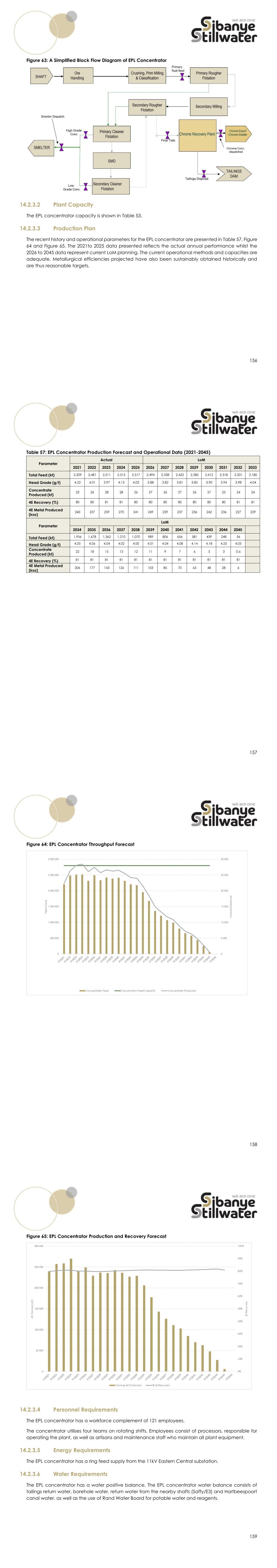 156 Figure 63: A Simplified Block Flow Diagram of EPL Concentrator 14.2.3.2 Plant Capacity The EPL concentrator capacity is shown in Table 53. 14.2.3.3 Production Plan The recent history and operational parameters for the EPL concentrator are presented in Table 57, Figure 64 and Figure 65. The 2021to 2025 data presented reflects the actual annual performance whilst the 2026 to 2045 data represent current LoM planning. The current operational methods and capacities are adequate. Metallurgical efficiencies projected have also been sustainably obtained historically and are thus reasonable targets. 157 Table 57: EPL Concentrator Production Forecast and Operational Data (2021-2045) Parameter Actual LoM 2021 2022 2023 2024 2025 2026 2027 2028 2029 2030 2031 2032 2033 Total Feed (kt) 2,209 2,481 2,511 2,515 2,317 2,494 2,338 2,422 2,385 2,412 2,318 2,201 2,180 Head Grade (g/t) 4.22 4.01 3.97 4.13 4.03 3.88 3.82 3.81 3.85 3.90 3.94 3.98 4.04 Concentrate Produced (kt) 22 26 28 28 26 27 26 27 26 27 25 24 24 4E Recovery (%) 80 80 81 81 80 80 80 80 80 80 80 81 81 4E Metal Produced (koz) 240 257 259 270 241 249 229 237 236 242 236 227 229 Parameter LoM 2034 2035 2036 2037 2038 2039 2040 2041 2042 2043 2044 2045 Total Feed (kt) 1,956 1,678 1,362 1,210 1,070 989 806 656 581 439 248 56 Head Grade (g/t) 4.05 4.06 4.04 4.02 4.00 4.01 4.04 4.08 4.14 4.18 4.25 4.05 Concentrate Produced (kt) 22 18 15 13 12 11 9 7 6 5 3 0.6 4E Recovery (%) 81 81 81 81 81 81 81 81 81 81 81 81 4E Metal Produced (koz) 206 177 143 126 111 103 85 70 63 48 28 6 158 Figure 64: EPL Concentrator Throughput Forecast 159 Figure 65: EPL Concentrator Production and Recovery Forecast 14.2.3.4 Personnel Requirements The EPL concentrator has a workforce complement of 121 employees. The concentrator utilises four teams on rotating shifts. Employees consist of processors, responsible for operating the plant, as well as artisans and maintenance staff who maintain all plant equipment. 14.2.3.5 Energy Requirements The EPL concentrator has a ring feed supply from the 11kV Eastern Central substation. 14.2.3.6 Water Requirements The EPL concentrator has a water positive balance. The EPL concentrator water balance consists of tailings return water, borehole water, return water from the nearby shafts (Saffy/E3) and Hartbeespoort canal water, as well as the use of Rand Water Board for potable water and reagents.