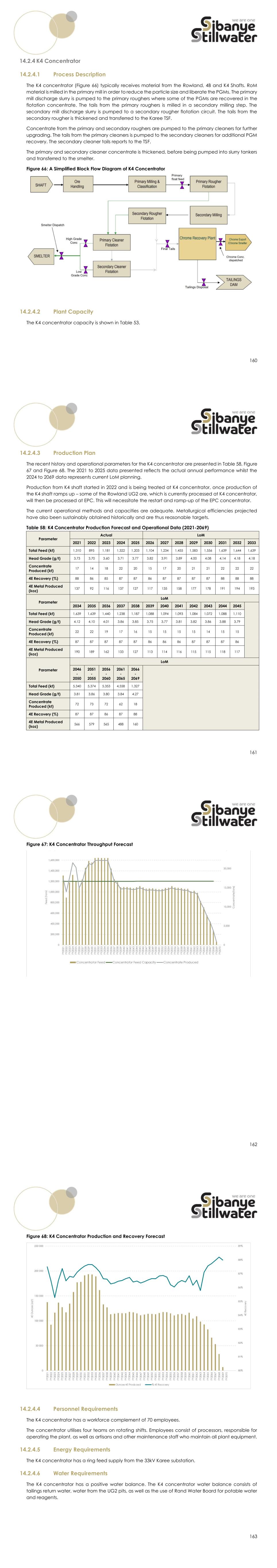 160 14.2.4 K4 Concentrator 14.2.4.1 Process Description The K4 concentrator (Figure 66) typically receives material from the Rowland, 4B and K4 Shafts. RoM material is milled in the primary mill in order to reduce the particle size and liberate the PGMs. The primary mill discharge slurry is pumped to the primary roughers where some of the PGMs are recovered in the flotation concentrate. The tails from the primary roughers is milled in a secondary milling step. The secondary mill discharge slurry is pumped to a secondary rougher flotation circuit. The tails from the secondary rougher is thickened and transferred to the Karee TSF. Concentrate from the primary and secondary roughers are pumped to the primary cleaners for further upgrading. The tails from the primary cleaners is pumped to the secondary cleaners for additional PGM recovery. The secondary cleaner tails reports to the TSF. The primary and secondary cleaner concentrate is thickened, before being pumped into slurry tankers and transferred to the smelter. Figure 66: A Simplified Block Flow Diagram of K4 Concentrator 14.2.4.2 Plant Capacity The K4 concentrator capacity is shown in Table 53. 161 14.2.4.3 Production Plan The recent history and operational parameters for the K4 concentrator are presented in Table 58, Figure 67 and Figure 68. The 2021 to 2025 data presented reflects the actual annual performance whilst the 2024 to 2069 data represents current LoM planning. Production from K4 shaft started in 2022 and is being treated at K4 concentrator, once production of the K4 shaft ramps up – some of the Rowland UG2 ore, which is currently processed at K4 concentrator, will then be processed at EPC. This will necessitate the restart and ramp-up of the EPC concentrator. The current operational methods and capacities are adequate. Metallurgical efficiencies projected have also been sustainably obtained historically and are thus reasonable targets. Table 58: K4 Concentrator Production Forecast and Operational Data (2021-2069) Parameter Actual LoM 2021 2022 2023 2024 2025 2026 2027 2028 2029 2030 2031 2032 2033 Total Feed (kt) 1,310 895 1,181 1,322 1,203 1,104 1,234 1,455 1,583 1,556 1,639 1,644 1,639 Head Grade (g/t) 3.73 3.70 3.60 3.71 3.77 3.82 3.91 3.89 4.00 4.08 4.14 4.18 4.18 Concentrate Produced (kt) 17 14 18 22 20 15 17 20 21 21 22 22 22 4E Recovery (%) 88 86 85 87 87 86 87 87 87 87 88 88 88 4E Metal Produced (koz) 137 92 116 137 127 117 135 158 177 178 191 194 193 Parameter LoM 2034 2035 2036 2037 2038 2039 2040 2041 2042 2043 2044 2045 Total Feed (kt) 1,639 1,639 1,440 1,238 1,187 1,088 1,094 1,093 1,084 1,072 1,088 1,110 Head Grade (g/t) 4.12 4.10 4.01 3.86 3.85 3.75 3.77 3.81 3.82 3.86 3.88 3.79 Concentrate Produced (kt) 22 22 19 17 16 15 15 15 15 14 15 15 4E Recovery (%) 87 87 87 87 87 86 86 86 87 87 87 86 4E Metal Produced (koz) 190 189 162 133 127 113 114 116 115 115 118 117 Parameter LoM 2046 - 2050 2051 - 2055 2056 - 2060 2061 - 2065 2066 - 2069 Total Feed (kt) 5,340 5,374 5,353 4,558 1,327 Head Grade (g/t) 3.81 3.86 3.80 3.84 4.27 Concentrate Produced (kt) 72 73 72 62 18 4E Recovery (%) 87 87 86 87 88 4E Metal Produced (koz) 566 579 565 488 160 162 Figure 67: K4 Concentrator Throughput Forecast 163 Figure 68: K4 Concentrator Production and Recovery Forecast 14.2.4.4 Personnel Requirements The K4 concentrator has a workforce complement of 70 employees. The concentrator utilises four teams on rotating shifts. Employees consist of processors, responsible for operating the plant, as well as artisans and other maintenance staff who maintain all plant equipment. 14.2.4.5 Energy Requirements The K4 concentrator has a ring feed supply from the 33kV Karee substation. 14.2.4.6 Water Requirements The K4 concentrator has a positive water balance. The K4 concentrator water balance consists of tailings return water, water from the UG2 pits, as well as the use of Rand Water Board for potable water and reagents.