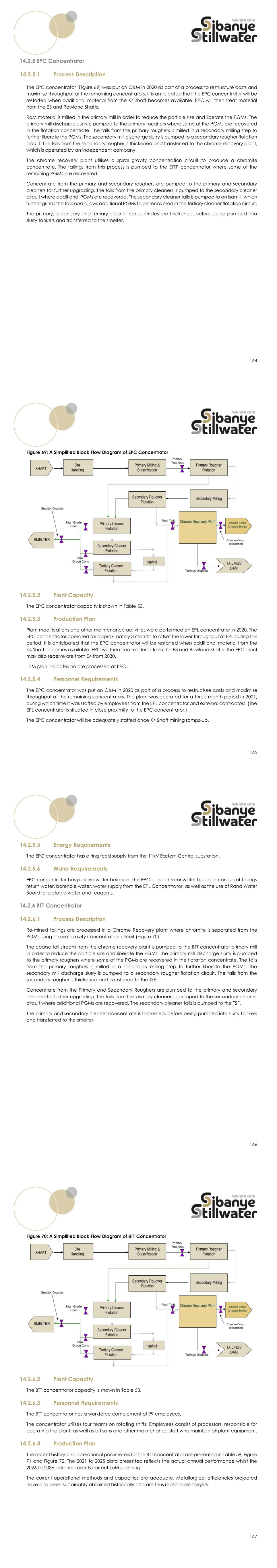 164 14.2.5 EPC Concentrator 14.2.5.1 Process Description The EPC concentrator (Figure 69) was put on C&M in 2020 as part of a process to restructure costs and maximise throughput at the remaining concentrators. It is anticipated that the EPC concentrator will be restarted when additional material from the K4 shaft becomes available. EPC will then treat material from the E3 and Rowland Shafts. RoM material is milled in the primary mill in order to reduce the particle size and liberate the PGMs. The primary mill discharge slurry is pumped to the primary roughers where some of the PGMs are recovered in the flotation concentrate. The tails from the primary roughers is milled in a secondary milling step to further liberate the PGMs. The secondary mill discharge slurry is pumped to a secondary rougher flotation circuit. The tails from the secondary rougher is thickened and transferred to the chrome recovery plant, which is operated by an independent company. The chrome recovery plant utilises a spiral gravity concentration circuit to produce a chromite concentrate. The tailings from this process is pumped to the ETTP concentrator where some of the remaining PGMs are recovered. Concentrate from the primary and secondary roughers are pumped to the primary and secondary cleaners for further upgrading. The tails from the primary cleaners is pumped to the secondary cleaner circuit where additional PGMs are recovered. The secondary cleaner tails is pumped to an Isamill, which further grinds the tails and allows additional PGMs to be recovered in the tertiary cleaner flotation circuit. The primary, secondary and tertiary cleaner concentrates are thickened, before being pumped into slurry tankers and transferred to the smelter. 165 Figure 69: A Simplified Block Flow Diagram of EPC Concentrator 14.2.5.2 Plant Capacity The EPC concentrator capacity is shown in Table 53. 14.2.5.3 Production Plan Plant modifications and other maintenance activities were performed on EPL concentrator in 2020. The EPC concentrator operated for approximately 3 months to offset the lower throughput at EPL during this period. It is anticipated that the EPC concentrator will be restarted when additional material from the K4 Shaft becomes available. EPC will then treat material from the E3 and Rowland Shafts. The EPC plant may also receive ore from E4 from 2030. LoM plan indicates no ore processed at EPC. 14.2.5.4 Personnel Requirements The EPC concentrator was put on C&M in 2020 as part of a process to restructure costs and maximise throughput at the remaining concentrators. The plant was operated for a three month period in 2021, during which time it was staffed by employees from the EPL concentrator and external contractors. (The EPL concentrator is situated in close proximity to the EPC concentrator.) The EPC concentrator will be adequately staffed once K4 Shaft mining ramps-up. 166 14.2.5.5 Energy Requirements The EPC concentrator has a ring feed supply from the 11kV Eastern Central substation. 14.2.5.6 Water Requirements EPC concentrator has positive water balance. The EPC concentrator water balance consists of tailings return water, borehole water, water supply from the EPL Concentrator, as well as the use of Rand Water Board for potable water and reagents. 14.2.6 BTT Concentrator 14.2.6.1 Process Description Re-mined tailings are processed in a Chrome Recovery plant where chromite is separated from the PGMs using a spiral gravity concentration circuit (Figure 70). The coarse tail stream from the chrome recovery plant is pumped to the BTT concentrator primary mill in order to reduce the particle size and liberate the PGMs. The primary mill discharge slurry is pumped to the primary roughers where some of the PGMs are recovered in the flotation concentrate. The tails from the primary roughers is milled in a secondary milling step to further liberate the PGMs. The secondary mill discharge slurry is pumped to a secondary rougher flotation circuit. The tails from the secondary rougher is thickened and transferred to the TSF. Concentrate from the Primary and Secondary Roughers are pumped to the primary and secondary cleaners for further upgrading. The tails from the primary cleaners is pumped to the secondary cleaner circuit where additional PGMs are recovered. The secondary cleaner tails is pumped to the TSF. The primary and secondary cleaner concentrate is thickened, before being pumped into slurry tankers and transferred to the smelter. 167 Figure 70: A Simplified Block Flow Diagram of BTT Concentrator 14.2.6.2 Plant Capacity The BTT concentrator capacity is shown in Table 53. 14.2.6.3 Personnel Requirements The BTT concentrator has a workforce complement of 99 employees. The concentrator utilises four teams on rotating shifts. Employees consist of processors, responsible for operating the plant, as well as artisans and other maintenance staff who maintain all plant equipment. 14.2.6.4 Production Plan The recent history and operational parameters for the BTT concentrator are presented in Table 59, Figure 71 and Figure 72. The 2021 to 2025 data presented reflects the actual annual performance whilst the 2026 to 2036 data represents current LoM planning. The current operational methods and capacities are adequate. Metallurgical efficiencies projected have also been sustainably obtained historically and are thus reasonable targets.