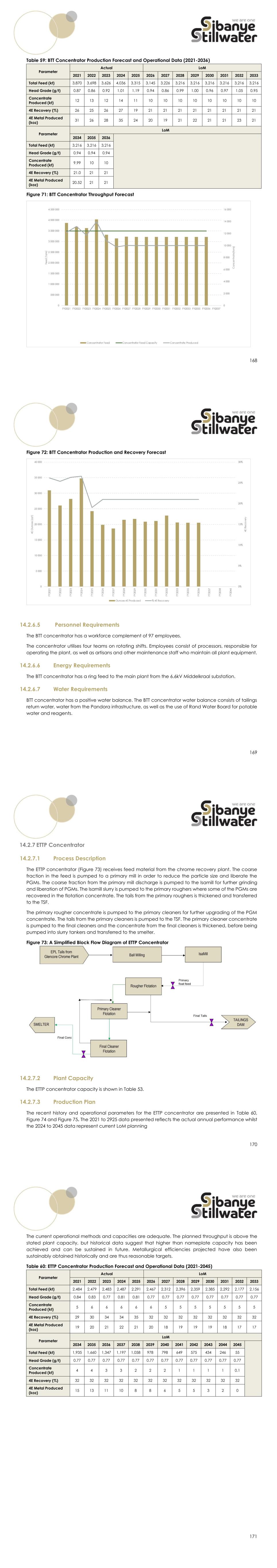 168 Table 59: BTT Concentrator Production Forecast and Operational Data (2021-2036) Parameter Actual LoM 2021 2022 2023 2024 2025 2026 2027 2028 2029 2030 2031 2032 2033 Total Feed (kt) 3,870 3,698 3,626 4,036 3,315 3,145 3,226 3,216 3,216 3,216 3,216 3,216 3,216 Head Grade (g/t) 0.87 0.86 0.92 1.01 1.19 0.94 0.86 0.99 1.00 0.96 0.97 1.05 0.95 Concentrate Produced (kt) 12 13 12 14 11 10 10 10 10 10 10 10 10 4E Recovery (%) 26 25 26 27 19 21 21 21 21 21 21 21 21 4E Metal Produced (koz) 31 26 28 35 24 20 19 21 22 21 21 23 21 Parameter LoM 2034 2035 2036 Total Feed (kt) 3,216 3,216 3,216 Head Grade (g/t) 0.94 0.94 0.94 Concentrate Produced (kt) 9.99 10 10 4E Recovery (%) 21.0 21 21 4E Metal Produced (koz) 20.52 21 21 Figure 71: BTT Concentrator Throughput Forecast 169 Figure 72: BTT Concentrator Production and Recovery Forecast 14.2.6.5 Personnel Requirements The BTT concentrator has a workforce complement of 97 employees. The concentrator utilises four teams on rotating shifts. Employees consist of processors, responsible for operating the plant, as well as artisans and other maintenance staff who maintain all plant equipment. 14.2.6.6 Energy Requirements The BTT concentrator has a ring feed to the main plant from the 6.6kV Middelkraal substation. 14.2.6.7 Water Requirements BTT concentrator has a positive water balance. The BTT concentrator water balance consists of tailings return water, water from the Pandora infrastructure, as well as the use of Rand Water Board for potable water and reagents. 170 14.2.7 ETTP Concentrator 14.2.7.1 Process Description The ETTP concentrator (Figure 73) receives feed material from the chrome recovery plant. The coarse fraction in the feed is pumped to a primary mill in order to reduce the particle size and liberate the PGMs. The coarse fraction from the primary mill discharge is pumped to the Isamill for further grinding and liberation of PGMs. The Isamill slurry is pumped to the primary roughers where some of the PGMs are recovered in the flotation concentrate. The tails from the primary roughers is thickened and transferred to the TSF. The primary rougher concentrate is pumped to the primary cleaners for further upgrading of the PGM concentrate. The tails from the primary cleaners is pumped to the TSF. The primary cleaner concentrate is pumped to the final cleaners and the concentrate from the final cleaners is thickened, before being pumped into slurry tankers and transferred to the smelter. Figure 73: A Simplified Block Flow Diagram of ETTP Concentrator 14.2.7.2 Plant Capacity The ETTP concentrator capacity is shown in Table 53. 14.2.7.3 Production Plan The recent history and operational parameters for the ETTP concentrator are presented in Table 60, Figure 74 and Figure 75. The 2021 to 2925 data presented reflects the actual annual performance whilst the 2024 to 2045 data represent current LoM planning 171 The current operational methods and capacities are adequate. The planned throughput is above the stated plant capacity, but historical data suggest that higher than nameplate capacity has been achieved and can be sustained in future. Metallurgical efficiencies projected have also been sustainably obtained historically and are thus reasonable targets. Table 60: ETTP Concentrator Production Forecast and Operational Data (2021-2045) Parameter Actual LoM 2021 2022 2023 2024 2025 2026 2027 2028 2029 2030 2031 2032 2033 Total Feed (kt) 2,484 2,479 2,483 2,487 2,291 2,467 2,312 2,396 2,359 2,385 2,292 2,177 2,156 Head Grade (g/t) 0.84 0.83 0.77 0.81 0.81 0.77 0.77 0.77 0.77 0.77 0.77 0.77 0.77 Concentrate Produced (kt) 5 6 6 6 6 6 5 5 5 5 5 5 5 4E Recovery (%) 29 30 34 34 35 32 32 32 32 32 32 32 32 4E Metal Produced (koz) 19 20 21 22 21 20 18 19 19 19 18 17 17 Parameter LoM 2034 2035 2036 2037 2038 2039 2040 2041 2042 2043 2044 2045 Total Feed (kt) 1,935 1,660 1,347 1,197 1,058 978 798 649 575 434 246 55 Head Grade (g/t) 0.77 0.77 0.77 0.77 0.77 0.77 0.77 0.77 0.77 0.77 0.77 0.77 Concentrate Produced (kt) 4 4 3 3 2 2 2 1 1 1 1 0.1 4E Recovery (%) 32 32 32 32 32 32 32 32 32 32 32 32 4E Metal Produced (koz) 15 13 11 10 8 8 6 5 5 3 2 0