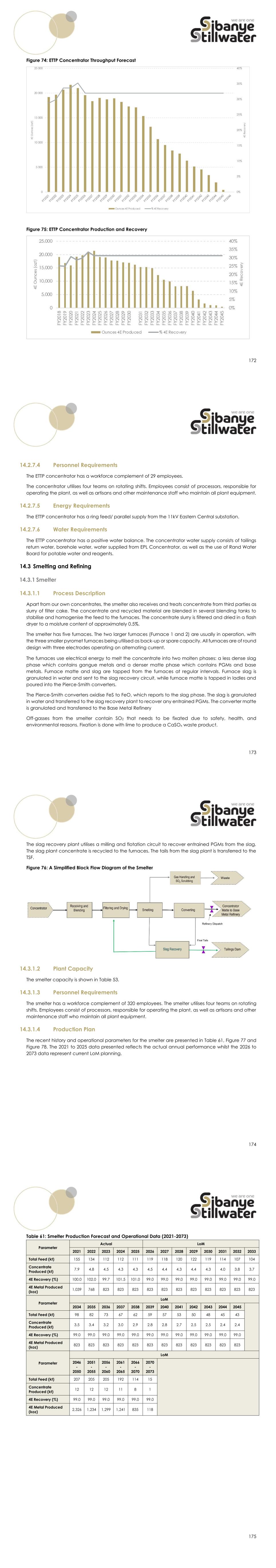 172 Figure 74: ETTP Concentrator Throughput Forecast Figure 75: ETTP Concentrator Production and Recovery 173 14.2.7.4 Personnel Requirements The ETTP concentrator has a workforce complement of 29 employees. The concentrator utilises four teams on rotating shifts. Employees consist of processors, responsible for operating the plant, as well as artisans and other maintenance staff who maintain all plant equipment. 14.2.7.5 Energy Requirements The ETTP concentrator has a ring feed/ parallel supply from the 11kV Eastern Central substation. 14.2.7.6 Water Requirements The ETTP concentrator has a positive water balance. The concentrator water supply consists of tailings return water, borehole water, water supplied from EPL Concentrator, as well as the use of Rand Water Board for potable water and reagents. 14.3 Smelting and Refining 14.3.1 Smelter 14.3.1.1 Process Description Apart from our own concentrates, the smelter also receives and treats concentrate from third parties as slurry of filter cake. The concentrate and recycled material are blended in several blending tanks to stabilise and homogenise the feed to the furnaces. The concentrate slurry is filtered and dried in a flash dryer to a moisture content of approximately 0.5%. The smelter has five furnaces. The two larger furnaces (Furnace 1 and 2) are usually in operation, with the three smaller pyromet furnaces being utilised as back-up or spare capacity. All furnaces are of round design with three electrodes operating on alternating current. The furnaces use electrical energy to melt the concentrate into two molten phases: a less dense slag phase which contains gangue metals and a denser matte phase which contains PGMs and base metals. Furnace matte and slag are tapped from the furnaces at regular intervals. Furnace slag is granulated in water and sent to the slag recovery circuit, while furnace matte is tapped in ladles and poured into the Pierce-Smith converters. The Pierce-Smith converters oxidise FeS to FeO, which reports to the slag phase. The slag is granulated in water and transferred to the slag recovery plant to recover any entrained PGMs. The converter matte is granulated and transferred to the Base Metal Refinery Off-gasses from the smelter contain SO2 that needs to be fixated due to safety, health, and environmental reasons. Fixation is done with lime to produce a CaSOx waste product. 174 The slag recovery plant utilises a milling and flotation circuit to recover entrained PGMs from the slag. The slag plant concentrate is recycled to the furnaces. The tails from the slag plant is transferred to the TSF. Figure 76: A Simplified Block Flow Diagram of the Smelter 14.3.1.2 Plant Capacity The smelter capacity is shown in Table 53. 14.3.1.3 Personnel Requirements The smelter has a workforce complement of 320 employees. The smelter utilises four teams on rotating shifts. Employees consist of processors, responsible for operating the plant, as well as artisans and other maintenance staff who maintain all plant equipment. 14.3.1.4 Production Plan The recent history and operational parameters for the smelter are presented in Table 61, Figure 77 and Figure 78. The 2021 to 2025 data presented reflects the actual annual performance whilst the 2026 to 2073 data represent current LoM planning. 175 Table 61: Smelter Production Forecast and Operational Data (2021-2073) Parameter Actual LoM 2021 2022 2023 2024 2025 2026 2027 2028 2029 2030 2031 2032 2033 Total Feed (kt) 155 134 112 112 111 119 118 120 122 119 114 107 104 Concentrate Produced (kt) 7.9 4.8 4.5 4.3 4.3 4.5 4.4 4.3 4.4 4.3 4.0 3.8 3.7 4E Recovery (%) 100.0 102.0 99.7 101.5 101.0 99.0 99.0 99.0 99.0 99.0 99.0 99.0 99.0 4E Metal Produced (koz) 1,039 768 823 823 823 823 823 823 823 823 823 823 823 Parameter LoM 2034 2035 2036 2037 2038 2039 2040 2041 2042 2043 2044 2045 Total Feed (kt) 98 82 73 67 62 59 57 53 50 48 45 43 Concentrate Produced (kt) 3.5 3.4 3.2 3.0 2.9 2.8 2.8 2.7 2.5 2.5 2.4 2.4 4E Recovery (%) 99.0 99.0 99.0 99.0 99.0 99.0 99.0 99.0 99.0 99.0 99.0 99.0 4E Metal Produced (koz) 823 823 823 823 823 823 823 823 823 823 823 823 Parameter LoM 2046 - 2050 2051 - 2055 2056 - 2060 2061 - 2065 2066 - 2070 2070 - 2073 Total Feed (kt) 207 205 205 192 114 15 Concentrate Produced (kt) 12 12 12 11 8 1 4E Recovery (%) 99.0 99.0 99.0 99.0 99.0 99.0 4E Metal Produced (koz) 2,326 1,234 1,299 1,241 835 118