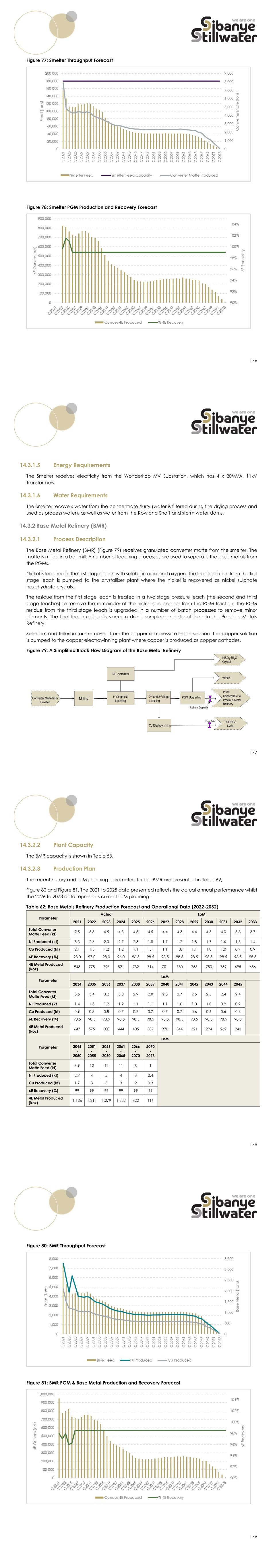 176 Figure 77: Smelter Throughput Forecast Figure 78: Smelter PGM Production and Recovery Forecast 177 14.3.1.5 Energy Requirements The Smelter receives electricity from the Wonderkop MV Substation, which has 4 x 20MVA, 11kV Transformers. 14.3.1.6 Water Requirements The Smelter recovers water from the concentrate slurry (water is filtered during the drying process and used as process water), as well as water from the Rowland Shaft and storm water dams. 14.3.2 Base Metal Refinery (BMR) 14.3.2.1 Process Description The Base Metal Refinery (BMR) (Figure 79) receives granulated converter matte from the smelter. The matte is milled in a ball mill. A number of leaching processes are used to separate the base metals from the PGMs. Nickel is leached in the first stage leach with sulphuric acid and oxygen. The leach solution from the first stage leach is pumped to the crystalliser plant where the nickel is recovered as nickel sulphate hexahydrate crystals. The residue from the first stage leach is treated in a two stage pressure leach (the second and third stage leaches) to remove the remainder of the nickel and copper from the PGM fraction. The PGM residue from the third stage leach is upgraded in a number of batch processes to remove minor elements. The final leach residue is vacuum dried, sampled and dispatched to the Precious Metals Refinery. Selenium and tellurium are removed from the copper rich pressure leach solution. The copper solution is pumped to the copper electrowinning plant where copper is produced as copper cathodes. Figure 79: A Simplified Block Flow Diagram of the Base Metal Refinery 178 14.3.2.2 Plant Capacity The BMR capacity is shown in Table 53. 14.3.2.3 Production Plan The recent history and LoM planning parameters for the BMR are presented in Table 62, Figure 80 and Figure 81. The 2021 to 2025 data presented reflects the actual annual performance whilst the 2026 to 2073 data represents current LoM planning. Table 62: Base Metals Refinery Production Forecast and Operational Data (2022-2032) Parameter Actual LoM 2021 2022 2023 2024 2025 2026 2027 2028 2029 2030 2031 2032 2033 Total Converter Matte Feed (kt) 7.5 5.3 4.5 4.3 4.3 4.5 4.4 4.3 4.4 4.3 4.0 3.8 3.7 Ni Produced (kt) 3.3 2.6 2.0 2.7 2.3 1.8 1.7 1.7 1.8 1.7 1.6 1.5 1.4 Cu Produced (kt) 2.1 1.5 1.2 1.2 1.1 1.1 1.1 1.0 1.1 1.0 1.0 0.9 0.9 6E Recovery (%) 98.0 97.0 98.0 96.0 96.3 98.5 98.5 98.5 98.5 98.5 98.5 98.5 98.5 4E Metal Produced (koz) 948 778 796 821 732 714 701 730 756 753 739 695 686 Parameter LoM 2034 2035 2036 2037 2038 2039 2040 2041 2042 2043 2044 2045 Total Converter Matte Feed (kt) 3.5 3.4 3.2 3.0 2.9 2.8 2.8 2.7 2.5 2.5 2.4 2.4 Ni Produced (kt 1.4 1.3 1.2 1.2 1.1 1.1 1.1 1.0 1.0 1.0 0.9 0.9 Cu Produced (kt) 0.9 0.8 0.8 0.7 0.7 0.7 0.7 0.7 0.6 0.6 0.6 0.6 6E Recovery (%) 98.5 98.5 98.5 98.5 98.5 98.5 98.5 98.5 98.5 98.5 98.5 98.5 4E Metal Produced (koz) 647 575 500 444 405 387 370 344 321 294 269 240 Parameter LoM 2046 - 2050 2051 - 2055 2056 - 2060 2061 - 2065 2066 - 2070 2070 - 2073 Total Converter Matte Feed (kt) 6.9 12 12 11 8 1 Ni Produced (kt) 2.7 4 5 4 3 0.4 Cu Produced (kt) 1.7 3 3 3 2 0.3 6E Recovery (%) 99 99 99 99 99 99 4E Metal Produced (koz) 1,126 1,215 1,279 1,222 822 116 179 Figure 80: BMR Throughput Forecast Figure 81: BMR PGM & Base Metal Production and Recovery Forecast