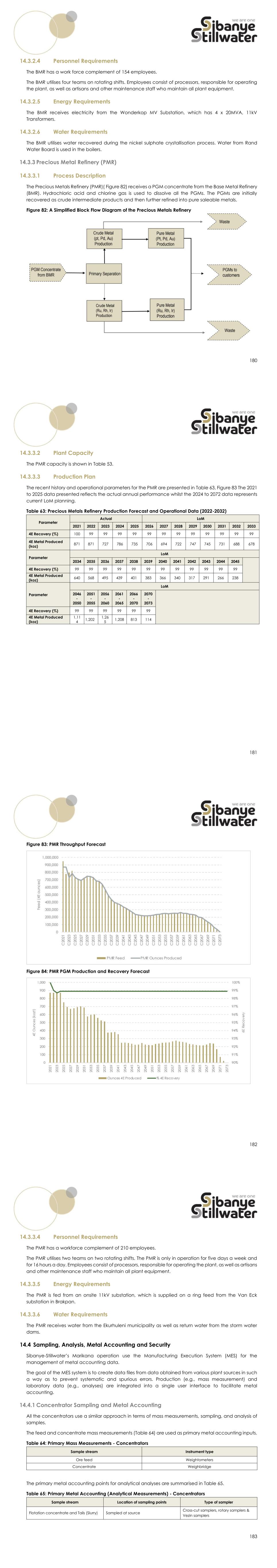 180 14.3.2.4 Personnel Requirements The BMR has a work force complement of 154 employees. The BMR utilises four teams on rotating shifts. Employees consist of processors, responsible for operating the plant, as well as artisans and other maintenance staff who maintain all plant equipment. 14.3.2.5 Energy Requirements The BMR receives electricity from the Wonderkop MV Substation, which has 4 x 20MVA, 11kV Transformers. 14.3.2.6 Water Requirements The BMR utilises water recovered during the nickel sulphate crystallisation process. Water from Rand Water Board is used in the boilers. 14.3.3 Precious Metal Refinery (PMR) 14.3.3.1 Process Description The Precious Metals Refinery (PMR)( Figure 82) receives a PGM concentrate from the Base Metal Refinery (BMR). Hydrochloric acid and chlorine gas is used to dissolve all the PGMs. The PGMs are initially recovered as crude intermediate products and then further refined into pure saleable metals. Figure 82: A Simplified Block Flow Diagram of the Precious Metals Refinery 181 14.3.3.2 Plant Capacity The PMR capacity is shown in Table 53. 14.3.3.3 Production Plan The recent history and operational parameters for the PMR are presented in Table 63, Figure 83 The 2021 to 2025 data presented reflects the actual annual performance whilst the 2024 to 2072 data represents current LoM planning. Table 63: Precious Metals Refinery Production Forecast and Operational Data (2022-2032) Parameter Actual LoM 2021 2022 2023 2024 2025 2026 2027 2028 2029 2030 2031 2032 2033 4E Recovery (%) 100 99 99 99 99 99 99 99 99 99 99 99 99 4E Metal Produced (koz) 871 871 727 786 735 706 694 722 747 745 731 688 678 Parameter LoM 2034 2035 2036 2037 2038 2039 2040 2041 2042 2043 2044 2045 4E Recovery (%) 99 99 99 99 99 99 99 99 99 99 99 99 4E Metal Produced (koz) 640 568 495 439 401 383 366 340 317 291 266 238 Parameter LoM 2046 - 2050 2051 - 2055 2056 - 2060 2061 - 2065 2066 - 2070 2070 - 2073 4E Recovery (%) 99 99 99 99 99 99 4E Metal Produced (koz) 1,11 4 1,202 1,26 5 1,208 813 114 182 Figure 83: PMR Throughput Forecast Figure 84: PMR PGM Production and Recovery Forecast 183 14.3.3.4 Personnel Requirements The PMR has a workforce complement of 210 employees. The PMR utilises two teams on two rotating shifts. The PMR is only in operation for five days a week and for 16 hours a day. Employees consist of processors, responsible for operating the plant, as well as artisans and other maintenance staff who maintain all plant equipment. 14.3.3.5 Energy Requirements The PMR is fed from an onsite 11kV substation, which is supplied on a ring feed from the Van Eck substation in Brakpan. 14.3.3.6 Water Requirements The PMR receives water from the Ekurhuleni municipality as well as return water from the storm water dams. 14.4 Sampling, Analysis, Metal Accounting and Security Sibanye-Stillwater’s Marikana operation use the Manufacturing Execution System (MES) for the management of metal accounting data. The goal of the MES system is to create data files from data obtained from various plant sources in such a way as to prevent systematic and spurious errors. Production (e.g., mass measurement) and laboratory data (e.g., analyses) are integrated into a single user interface to facilitate metal accounting. 14.4.1 Concentrator Sampling and Metal Accounting All the concentrators use a similar approach in terms of mass measurements, sampling, and analysis of samples. The feed and concentrate mass measurements (Table 64) are used as primary metal accounting inputs. Table 64: Primary Mass Measurements - Concentrators Sample stream Instrument type Ore feed Weightometers Concentrate Weighbridge The primary metal accounting points for analytical analyses are summarised in Table 65. Table 65: Primary Metal Accounting (Analytical Measurements) - Concentrators Sample stream Location of sampling points Type of sampler Flotation concentrate and Tails (Slurry) Sampled at source Cross-cut samplers, rotary samplers & Vezin samplers