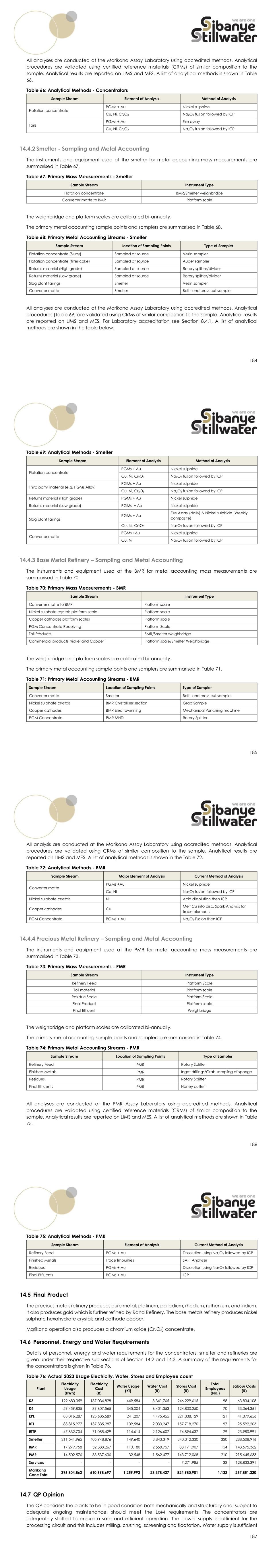 184 All analyses are conducted at the Marikana Assay Laboratory using accredited methods. Analytical procedures are validated using certified reference materials (CRMs) of similar composition to the sample. Analytical results are reported on LIMS and MES. A list of analytical methods is shown in Table 66. Table 66: Analytical Methods - Concentrators Sample Stream Element of Analysis Method of Analysis Flotation concentrate PGMs + Au Nickel sulphide Cu, Ni, Cr2O3 Na2O2 fusion followed by ICP Tails PGMs + Au Fire assay Cu, Ni, Cr2O3 Na2O2 fusion followed by ICP 14.4.2 Smelter - Sampling and Metal Accounting The instruments and equipment used at the smelter for metal accounting mass measurements are summarised in Table 67. Table 67: Primary Mass Measurements - Smelter Sample Stream Instrument Type Flotation concentrate BMR/Smelter weighbridge Converter matte to BMR Platform scale The weighbridge and platform scales are calibrated bi-annually. The primary metal accounting sample points and samplers are summarised in Table 68. Table 68: Primary Metal Accounting Streams - Smelter Sample Stream Location of Sampling Points Type of Sampler Flotation concentrate (Slurry) Sampled at source Vezin sampler Flotation concentrate (filter cake) Sampled at source Auger sampler Returns material (High grade) Sampled at source Rotary splitter/divider Returns material (Low grade) Sampled at source Rotary splitter/divider Slag plant tailings Smelter Vezin sampler Converter matte Smelter Belt –end cross cut sampler All analyses are conducted at the Marikana Assay Laboratory using accredited methods. Analytical procedures (Table 69) are validated using CRMs of similar composition to the sample. Analytical results are reported on LIMS and MES. For Laboratory accreditation see Section 8.4.1. A list of analytical methods are shown in the table below. 185 Table 69: Analytical Methods - Smelter Sample Stream Element of Analysis Method of Analysis Flotation concentrate PGMs + Au Nickel sulphide Cu, Ni, Cr2O3 Na2O2 fusion followed by ICP Third party material (e.g. PGMs Alloy) PGMs + Au Nickel sulphide Cu, Ni, Cr2O3 Na2O2 fusion followed by ICP Returns material (High grade) PGMs + Au Nickel sulphide Returns material (Low grade) PGMs + Au Nickel sulphide Slag plant tailings PGMs + Au Fire Assay (daily) & Nickel sulphide (Weekly composite) Cu, Ni, Cr2O3 Na2O2 fusion followed by ICP Converter matte PGMs +Au Nickel sulphide Cu, Ni Na2O2 fusion followed by ICP 14.4.3 Base Metal Refinery – Sampling and Metal Accounting The instruments and equipment used at the BMR for metal accounting mass measurements are summarised in Table 70. Table 70: Primary Mass Measurements - BMR Sample Stream Instrument Type Converter matte to BMR Platform scale Nickel sulphate crystals platform scale Platform scale Copper cathodes platform scales Platform scale PGM Concentrate Receiving Platform Scale Toll Products BMR/Smelter weighbridge Commercial products Nickel and Copper Platform scale/Smelter Weighbridge The weighbridge and platform scales are calibrated bi-annually. The primary metal accounting sample points and samplers are summarised in Table 71. Table 71: Primary Metal Accounting Streams - BMR Sample Stream Location of Sampling Points Type of Sampler Converter matte Smelter Belt –end cross cut sampler Nickel sulphate crystals BMR Crystalliser section Grab Sample Copper cathodes BMR Electrowinning Mechanical Punching machine PGM Concentrate PMR MHD Rotary Splitter 186 All analysis are conducted at the Marikana Assay Laboratory using accredited methods. Analytical procedures are validated using CRMs of similar composition to the sample. Analytical results are reported on LIMS and MES. A list of analytical methods is shown in the Table 72. Table 72: Analytical Methods - BMR Sample Stream Major Element of Analysis Current Method of Analysis Converter matte PGMs +Au Nickel sulphide Cu, Ni Na2O2 fusion followed by ICP Nickel sulphate crystals Ni Acid dissolution then ICP Copper cathodes Cu Melt Cu into disc, Spark Analysis for trace elements PGM Concentrate PGMs + Au Na2O2 Fusion then ICP 14.4.4 Precious Metal Refinery – Sampling and Metal Accounting The instruments and equipment used at the PMR for metal accounting mass measurements are summarised in Table 73. Table 73: Primary Mass Measurements - PMR Sample Stream Instrument Type Refinery Feed Platform Scale Toll material Platform scale Residue Scale Platform Scale Final Product Platform scale Final Effluent Weighbridge The weighbridge and platform scales are calibrated bi-annually. The primary metal accounting sample points and samplers are summarised in Table 74. Table 74: Primary Metal Accounting Streams - PMR Sample Stream Location of Sampling Points Type of Sampler Refinery Feed PMR Rotary Splitter Finished Metals PMR Ingot drillings/Grab sampling of sponge Residues PMR Rotary Splitter Final Effluents PMR Honey cutter All analyses are conducted at the PMR Assay Laboratory using accredited methods. Analytical procedures are validated using certified reference materials (CRMs) of similar composition to the sample. Analytical results are reported on LIMS and MES. A list of analytical methods are shown in Table 75. 187 Table 75: Analytical Methods - PMR Sample Stream Element of Analysis Current Method of Analysis Refinery Feed PGMs + Au Dissolution using Na2O2 followed by ICP Finished Metals Trace Impurities SAFT Analyser Residues PGMs + Au Dissolution using Na2O2 followed by ICP Final Effluents PGMs + Au ICP 14.5 Final Product The precious metals refinery produces pure metal, platinum, palladium, rhodium, ruthenium, and Iridium. It also produces gold which is further refined by Rand Refinery. The base metals refinery produces nickel sulphate hexahydrate crystals and cathode copper. Marikana operation also produces a chromium oxide (Cr2O3) concentrate. 14.6 Personnel, Energy and Water Requirements Details of personnel, energy and water requirements for the concentrators, smelter and r