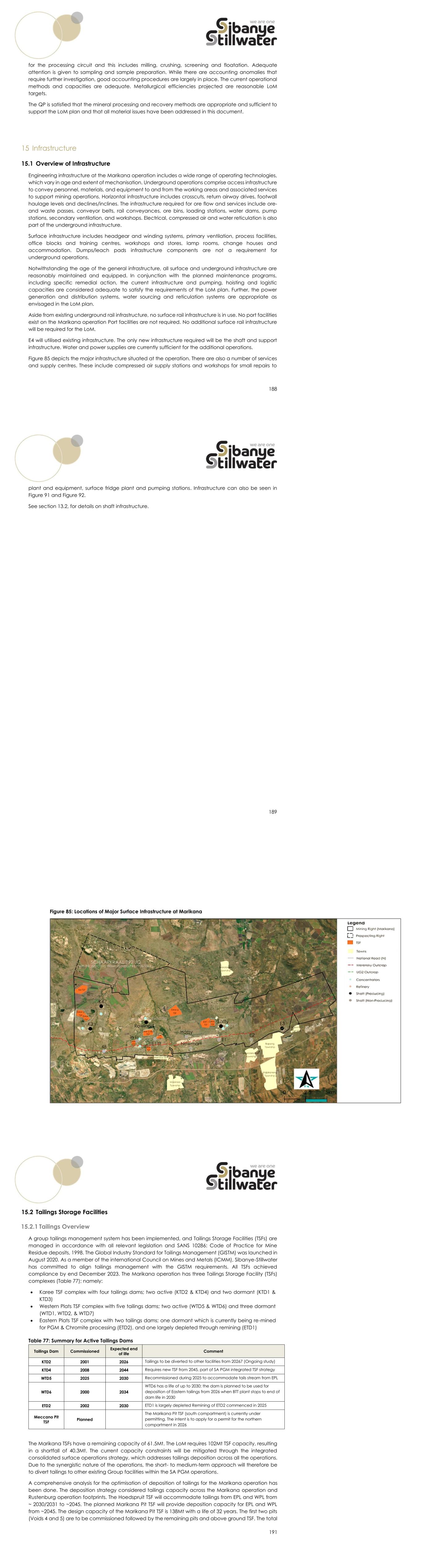 188 for the processing circuit and this includes milling, crushing, screening and floatation. Adequate attention is given to sampling and sample preparation. While there are accounting anomalies that require further investigation, good accounting procedures are largely in place. The current operational methods and capacities are adequate. Metallurgical efficiencies projected are reasonable LoM targets. The QP is satisfied that the mineral processing and recovery methods are appropriate and sufficient to support the LoM plan and that all material issues have been addressed in this document. 15 Infrastructure 15.1 Overview of Infrastructure Engineering infrastructure at the Marikana operation includes a wide range of operating technologies, which vary in age and extent of mechanisation. Underground operations comprise access infrastructure to convey personnel, materials, and equipment to and from the working areas and associated services to support mining operations. Horizontal infrastructure includes crosscuts, return airway drives, footwall haulage levels and declines/inclines. The infrastructure required for ore flow and services include ore- and waste passes, conveyor belts, rail conveyances, ore bins, loading stations, water dams, pump stations, secondary ventilation, and workshops. Electrical, compressed air and water reticulation is also part of the underground infrastructure. Surface infrastructure includes headgear and winding systems, primary ventilation, process facilities, office blocks and training centres, workshops and stores, lamp rooms, change houses and accommodation. Dumps/leach pads infrastructure components are not a requirement for underground operations. Notwithstanding the age of the general infrastructure, all surface and underground infrastructure are reasonably maintained and equipped. In conjunction with the planned maintenance programs, including specific remedial action, the current infrastructure and pumping, hoisting and logistic capacities are considered adequate to satisfy the requirements of the LoM plan. Further, the power generation and distribution systems, water sourcing and reticulation systems are appropriate as envisaged in the LoM plan. Aside from existing underground rail infrastructure, no surface rail infrastructure is in use. No port facilities exist on the Marikana operation Port facilities are not required. No additional surface rail infrastructure will be required for the LoM. E4 will utilised existing infrastructure. The only new infrastructure required will be the shaft and support infrastructure. Water and power supplies are currently sufficient for the additional operations. Figure 85 depicts the major infrastructure situated at the operation. There are also a number of services and supply centres. These include compressed air supply stations and workshops for small repairs to 189 plant and equipment, surface fridge plant and pumping stations. Infrastructure can also be seen in Figure 91 and Figure 92. See section 13.2, for details on shaft infrastructure. Figure 85: Locations of Major Surface Infrastructure at Marikana 191 15.2 Tailings Storage Facilities 15.2.1 Tailings Overview A group tailings management system has been implemented, and Tailings Storage Facilities (TSFs) are managed in accordance with all relevant legislation and SANS 10286: Code of Practice for Mine Residue deposits, 1998. The Global Industry Standard for Tailings Management (GISTM) was launched in August 2020. As a member of the international Council on Mines and Metals (ICMM), Sibanye-Stillwater has committed to align tailings management with the GISTM requirements. All TSFs achieved compliance by end December 2023. The Marikana operation has three Tailings Storage Facility (TSFs) complexes (Table 77); namely: • Karee TSF complex with four tailings dams; two active (KTD2 & KTD4) and two dormant (KTD1 & KTD3) • Western Plats TSF complex with five tailings dams; two active (WTD5 & WTD6) and three dormant (WTD1, WTD2, & WTD7) • Eastern Plats TSF complex with two tailings dams; one dormant which is currently being re-mined for PGM & Chromite processing (ETD2), and one largely depleted through remining (ETD1) Table 77: Summary for Active Tailings Dams Tailings Dam Commissioned Expected end of life Comment KTD2 2001 2026 Tailings to be diverted to other facilities from 20267 (Ongoing study) KTD4 2008 2044 Requires new TSF from 2045, part of SA PGM integrated TSF strategy WTD5 2025 2030 Recommissioned during 2025 to accommodate tails stream from EPL WTD6 2000 2034 WTD6 has a life of up to 2030; the dam is planned to be used for deposition of Eastern tailings from 2026 when BTT plant stops to end of dam life in 2030 ETD2 2002 2030 ETD1 is largely depleted Remining of ETD2 commenced in 2025 Meccano Pit TSF Planned The Marikana Pit TSF (south compartment) is currently under permitting. The intent is to apply for a permit for the northern compartment in 2026 The Marikana TSFs have a remaining capacity of 61.5Mt. The LoM requires 102Mt TSF capacity, resulting in a shortfall of 40.3Mt. The current capacity constraints will be mitigated through the integrated consolidated surface operations strategy, which addresses tailings deposition across all the operations. Due to the synergistic nature of the operations, the short- to medium-term approach will therefore be to divert tailings to other existing Group facilities within the SA PGM operations. A comprehensive analysis for the optimisation of deposition of tailings for the Marikana operation has been done. The deposition strategy considered tailings capacity across the Marikana operation and Rustenburg operation footprints. The Hoedspruit TSF will accommodate tailings from EPL and WPL from ~ 2030/2031 to ~2045. The planned Marikana Pit TSF will provide deposition capacity for EPL and WPL from ~2045. The design capacity of the Marikana Pit TSF is 138Mt with a life of 32 years. The first two pits (Voids 4 and 5) are to be 
