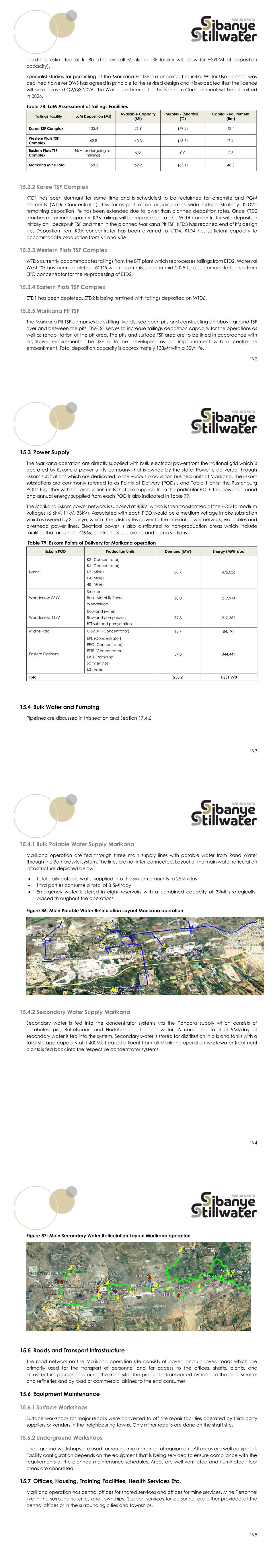 192 capital is estimated at R1.8b. (The overall Marikana TSF facility will allow for ~290Mt of deposition capacity). Specialist studies for permitting of the Marikana Pit TSF are ongoing. The initial Water Use Licence was declined however DWS has agreed in principle to the revised design and it is expected that the licence will be approved Q2/Q3 2026. The Water Use License for the Northern Compartment will be submitted in 2026. Table 78: LoM Assessment of Tailings Facilities Tailings Facility LoM Deposition (Mt) Available Capacity (Mt) Surplus / (Shortfall) (%) Capital Requirement (Rm) Karee TSF Complex 105.4 21.9 (79.2) 43.4 Western Plats TSF Complex 62.8 40.3 (48.5) 2.4 Eastern Plats TSF Complex N/A (undergoing re- mining) N/A 0.0 2.5 Marikana Mine Total 168.2 62.2 (63.1) 48.3 15.2.2 Karee TSF Complex KTD1 has been dormant for some time and is scheduled to be reclaimed for chromite and PGM elements (WLTR Concentrator). This forms part of an ongoing mine-wide surface strategy. KTD2’s remaining deposition life has been extended due to lower than planned deposition rates. Once KTD2 reaches maximum capacity, K3B tailings will be reprocessed at the WLTR concentrator with deposition initially on Hoedspruit TSF and then in the planned Marikana Pit TSF. KTD3 has reached end of it’s design life. Deposition from K3A concentrator has been diverted to KTD4. KTD4 has sufficient capacity to accommodate production from K4 and K3A. 15.2.3 Western Plats TSF Complex WTD6 currently accommodates tailings from the BTT plant which reprocesses tailings from ETD2. Waterval West TSF has been depleted. WTD5 was re-commissioned in mid 2025 to accommodate tailings from EPC concentrator for the re-processing of ETD2. 15.2.4 Eastern Plats TSF Complex ETD1 has been depleted. ETD2 is being remined with tailings deposited on WTD6. 15.2.5 Marikana Pit TSF The Marikana Pit TSF comprises backfilling five disused open pits and constructing an above ground TSF over and between the pits. The TSF serves to increase tailings deposition capacity for the operations as well as rehabilitation of the pit area. The pits and surface TSF area are to be lined in accordance with legislative requirements. The TSF is to be developed as an impoundment with a centre-line embankment. Total deposition capacity is approximately 138Mt with a 32yr life. 193 15.3 Power Supply The Marikana operation are directly supplied with bulk electrical power from the national grid which is operated by Eskom, a power utility company that is owned by the state. Power is delivered through Eskom substations which are dedicated to the various production business units at Marikana. The Eskom substations are commonly referred to as Points of Delivery (PODs), and Table 1 enlist the Rustenburg PODs together with the production units that are supplied from the particular POD. The power demand and annual energy supplied from each POD is also indicated in Table 79. The Marikana Eskom power network is supplied at 88kV, which is then transformed at the POD to medium voltages (6.6kV, 11kV, 33kV). Associated with each POD would be a medium voltage intake substation which is owned by Sibanye, which then distributes power to the internal power network, via cables and overhead power lines. Electrical power is also distributed to non-production areas which include facilities that are under C&M, central services areas, and pump stations. Table 79: Eskom Points of Delivery for Marikana operation Eskom POD Production Units Demand (MW) Energy (MWh)/pa Karee K3 (Concentrator) K4 (Concentrator) K3 (Mine) K4 (Mine) 4B (Mine) 80.7 475,036 Wonderkop 88kV Smelter, Base Metal Refinery Wonderkop 60.0 217,914 Wonderkop 11kV Rowland (Mine) Rowland compressors BTT sub and pumpstation 39.8 210,382 Middelkraal UG2 BTT (Concentrator) 13.7 84,191 Eastern Platinum EPL (Concentrator) EPC (Concentrator) ETTP (Concentrator) EBTT (Remining) Saffy (Mine) E3 (Mine) 59.0 344,447 Total 253.2 1,331,970 15.4 Bulk Water and Pumping Pipelines are discussed in this section and Section 17.4.6. 194 15.4.1 Bulk Potable Water Supply Marikana Marikana operation are fed through three main supply lines with potable water from Rand Water through the Barnardsvlei system. The lines are not inter-connected. Layout of the main water reticulation infrastructure depicted below. • Total daily potable water supplied into the system amounts to 25Ml/day • Third parties consume a total of 8.5Ml/day • Emergency water is stored in eight reservoirs with a combined capacity of 39Ml strategically placed throughout the operations Figure 86: Main Potable Water Reticulation Layout Marikana operation 15.4.2 Secondary Water Supply Marikana Secondary water is fed into the concentrator systems via the Pandora supply which consists of boreholes, pits, Buffelspoort and Hartebeespoort canal water. A combined total of 9Ml/day of secondary water is fed into the system. Secondary water is stored for distribution in pits and tanks with a total storage capacity of 1,400Ml. Treated effluent from all Marikana operation wastewater treatment plants is fed back into the respective concentrator systems. 195 Figure 87: Main Secondary Water Reticulation Layout Marikana operation 15.5 Roads and Transport Infrastructure The road network on the Marikana operation site consists of paved and unpaved roads which are primarily used for the transport of personnel and for access to the offices, shafts, plants, and infrastructure positioned around the mine site. The product is transported by road to the local smelter and refineries and by road or commercial airlines to the end consumer. 15.6 Equipment Maintenance 15.6.1 Surface Workshops Surface workshops for major repairs were converted to off-site repair facilities operated by third party suppliers or vendors in the neighbouring towns. Only minor repairs are done on the shaft site. 15.6.2 Underground Workshops Underground workshops are used for routine maintenance of equipment. All areas are well equipp