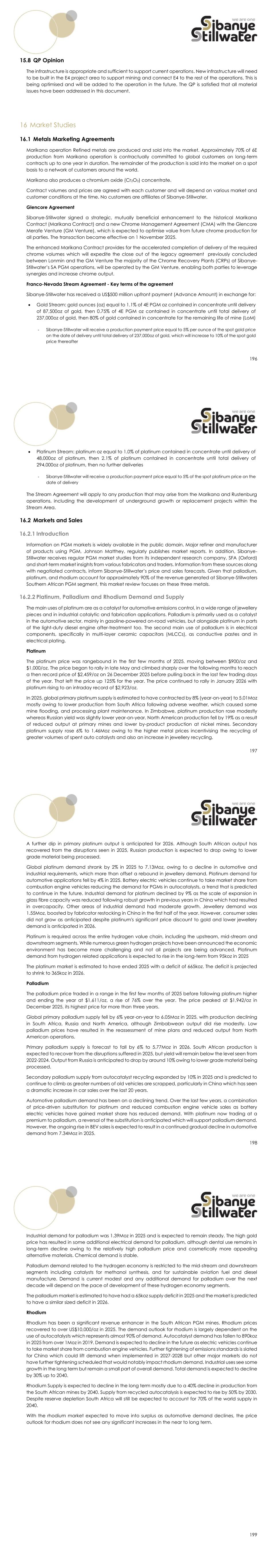 196 15.8 QP Opinion The infrastructure is appropriate and sufficient to support current operations. New infrastructure will need to be built in the E4 project area to support mining and connect E4 to the rest of the operations. This is being optimised and will be added to the operation in the future. The QP is satisfied that all material issues have been addressed in this document. 16 Market Studies 16.1 Metals Marketing Agreements Marikana operation Refined metals are produced and sold into the market. Approximately 70% of 6E production from Marikana operation is contractually committed to global customers on long-term contracts up to one year in duration. The remainder of the production is sold into the market on a spot basis to a network of customers around the world. Marikana also produces a chromium oxide (Cr2O3) concentrate. Contract volumes and prices are agreed with each customer and will depend on various market and customer conditions at the time. No customers are affiliates of Sibanye-Stillwater. Glencore Agreement Sibanye-Stillwater signed a strategic, mutually beneficial enhancement to the historical Marikana Contract (Marikana Contract) and a new Chrome Management Agreement (CMA) with the Glencore Merafe Venture (GM Venture), which is expected to optimise value from future chrome production for all parties. The transaction became effective on 1 November 2025. The enhanced Marikana Contract provides for the accelerated completion of delivery of the required chrome volumes which will expedite the close out of the legacy agreement previously concluded between Lonmin and the GM Venture The majority of the Chrome Recovery Plants (CRPs) at Sibanye- Stillwater’s SA PGM operations, will be operated by the GM Venture, enabling both parties to leverage synergies and increase chrome output. Franco-Nevada Stream Agreement - Key terms of the agreement Sibanye-Stillwater has received a US$500 million upfront payment (Advance Amount) in exchange for: • Gold Stream: gold ounces (oz) equal to 1.1% of 4E PGM oz contained in concentrate until delivery of 87,500oz of gold, then 0.75% of 4E PGM oz contained in concentrate until total delivery of 237,000oz of gold, then 80% of gold contained in concentrate for the remaining life of mine (LoM) - Sibanye-Stillwater will receive a production payment price equal to 5% per ounce of the spot gold price on the date of delivery until total delivery of 237,000oz of gold, which will increase to 10% of the spot gold price thereafter 197 • Platinum Stream: platinum oz equal to 1.0% of platinum contained in concentrate until delivery of 48,000oz of platinum, then 2.1% of platinum contained in concentrate until total delivery of 294,000oz of platinum, then no further deliveries - Sibanye-Stillwater will receive a production payment price equal to 5% of the spot platinum price on the date of delivery The Stream Agreement will apply to any production that may arise from the Marikana and Rustenburg operations, including the development of underground growth or replacement projects within the Stream Area. 16.2 Markets and Sales 16.2.1 Introduction Information on PGM markets is widely available in the public domain. Major refiner and manufacturer of products using PGM, Johnson Matthey, regularly publishes market reports. In addition, Sibanye- Stillwater receives regular PGM market studies from its independent research company, SFA (Oxford) and short-term market insights from various fabricators and traders. Information from these sources along with negotiated contracts, inform Sibanye-Stillwater’s price and sales forecasts. Given that palladium, platinum, and rhodium account for approximately 90% of the revenue generated at Sibanye-Stillwaters Southern African PGM segment, this market review focuses on these three metals. 16.2.2 Platinum, Palladium and Rhodium Demand and Supply The main uses of platinum are as a catalyst for automotive emissions control, in a wide range of jewellery pieces and in industrial catalytic and fabrication applications. Palladium is primarily used as a catalyst in the automotive sector, mainly in gasoline-powered on-road vehicles, but alongside platinum in parts of the light-duty diesel engine after-treatment too. The second main use of palladium is in electrical components, specifically in multi-layer ceramic capacitors (MLCCs), as conductive pastes and in electrical plating. Platinum The platinum price was rangebound in the first few months of 2025, moving between $900/oz and $1,000/oz. The price began to rally in late May and climbed sharply over the following months to reach a then record price of $2,459/oz on 26 December 2025 before pulling back in the last few trading days of the year. That left the price up 125% for the year. The price continued to rally in January 2026 with platinum rising to an intraday record of $2,923/oz. In 2025, global primary platinum supply is estimated to have contracted by 8% (year-on-year) to 5.01Moz mostly owing to lower production from South Africa following adverse weather, which caused some mine flooding, and processing plant maintenance. In Zimbabwe, platinum production rose modestly whereas Russian yield was slightly lower year-on-year. North American production fell by 19% as a result of reduced output at primary mines and lower by-product production at nickel mines. Secondary platinum supply rose 6% to 1.46Moz owing to the higher metal prices incentivising the recycling of greater volumes of spent auto catalysts and also an increase in jewellery recycling. 198 A further dip in primary platinum output is anticipated for 2026. Although South African output has recovered from the disruptions seen in 2025, Russian production is expected to drop owing to lower grade material being processed. Global platinum demand shrank by 2% in 2025 to 7.13Moz, owing to a decline in automotive and industrial requirements, which more than offset a rebound in jewellery demand. Platinum demand for automotive a