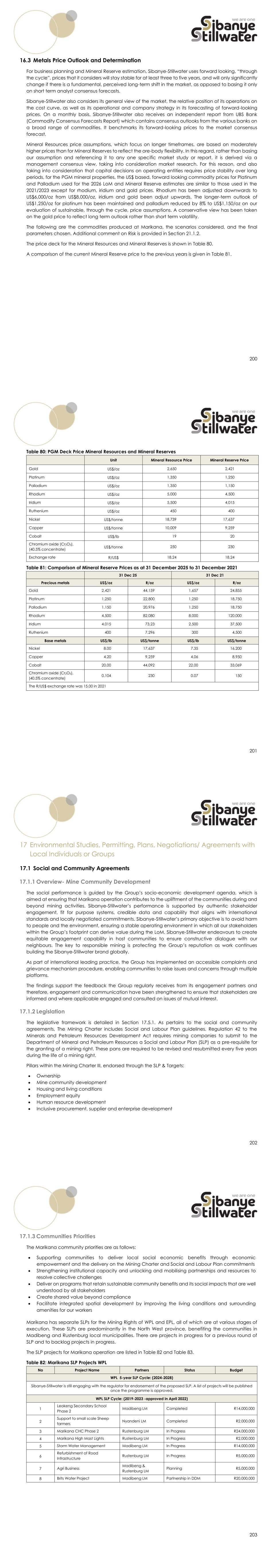 200 16.3 Metals Price Outlook and Determination For business planning and Mineral Reserve estimation, Sibanye-Stillwater uses forward looking, “through the cycle”, prices that it considers will stay stable for at least three to five years, and will only significantly change if there is a fundamental, perceived long-term shift in the market, as opposed to basing it only on short term analyst consensus forecasts. Sibanye-Stillwater also considers its general view of the market, the relative position of its operations on the cost curve, as well as its operational and company strategy in its forecasting of forward-looking prices. On a monthly basis, Sibanye-Stillwater also receives an independent report from UBS Bank (Commodity Consensus Forecasts Report) which contains consensus outlooks from the various banks on a broad range of commodities. It benchmarks its forward-looking prices to the market consensus forecast. Mineral Resources price assumptions, which focus on longer timeframes, are based on moderately higher prices than for Mineral Reserves to reflect the ore-body flexibility. In this regard, rather than basing our assumption and referencing it to any one specific market study or report, it is derived via a management consensus view, taking into consideration market research. For this reason, and also taking into consideration that capital decisions on operating entities requires price stability over long periods, for the PGM mineral properties, the US$ based, forward looking commodity prices for Platinum and Palladium used for the 2026 LoM and Mineral Reserve estimates are similar to those used in the 2021/2023 except for rhodium, iridium and gold prices. Rhodium has been adjusted downwards to US$6,000/oz from US$8,000/oz, iridium and gold been adjust upwards. The longer-term outlook of US$1,250/oz for platinum has been maintained and palladium reduced by 8% to US$1,150/oz on our evaluation of sustainable, through the cycle, price assumptions. A conservative view has been taken on the gold price to reflect long term outlook rather than short term volatility. The following are the commodities produced at Marikana, the scenarios considered, and the final parameters chosen. Additional comment on Risk is provided in Section 21.1.2. The price deck for the Mineral Resources and Mineral Reserves is shown in Table 80. A comparison of the current Mineral Reserve price to the previous years is given in Table 81. 201 Table 80: PGM Deck Price Mineral Resources and Mineral Reserves Unit Mineral Resource Price Mineral Reserve Price Gold US$/oz 2,650 2,421 Platinum US$/oz 1,350 1,250 Palladium US$/oz 1,350 1,150 Rhodium US$/oz 5,000 4,500 Iridium US$/oz 5,500 4,015 Ruthenium US$/oz 450 400 Nickel US$/tonne 18,739 17,637 Copper US$/tonne 10,009 9,259 Cobalt US$/lb 19 20 Chromium oxide (Cr2O3), (40.5% concentrate) US$/tonne 250 230 Exchange rate R/US$ 18.24 18.24 Table 81: Comparison of Mineral Reserve Prices as at 31 December 2025 to 31 December 2021 31 Dec 25 31 Dec 21 Precious metals US$/oz R/oz US$/oz R/oz Gold 2,421 44,159 1,657 24,855 Platinum 1,250 22,800 1,250 18,750 Palladium 1,150 20,976 1,250 18,750 Rhodium 4,500 82,080 8,000 120,000 Iridium 4,015 73,23 2,500 37,500 Ruthenium 400 7,296 300 4,500 Base metals US$/lb US$/tonne US$/lb US$/tonne Nickel 8.00 17,637 7.35 16,200 Copper 4.20 9,259 4.06 8,950 Cobalt 20.00 44,092 22.00 33,069 Chromium oxide (Cr2O3), (40.5% concentrate) 0.104 230 0.07 150 The R/US$ exchange rate was 15.00 in 2021 202 17 Environmental Studies, Permitting, Plans, Negotiations/ Agreements with Local Individuals or Groups 17.1 Social and Community Agreements 17.1.1 Overview- Mine Community Development The social performance is guided by the Group’s socio-economic development agenda, which is aimed at ensuring that Marikana operation contributes to the upliftment of the communities during and beyond mining activities. Sibanye-Stillwater’s performance is supported by authentic stakeholder engagement, fit for purpose systems, credible data and capability that aligns with international standards and locally negotiated commitments. Sibanye-Stillwater’s primary objective is to avoid harm to people and the environment, ensuring a stable operating environment in which all our stakeholders within the Group’s footprint can derive value during the LoM. Sibanye-Stillwater endeavours to create equitable engagement capability in host communities to ensure constructive dialogue with our neighbours. The key to responsible mining is protecting the Group’s reputation as work continues building the Sibanye-Stillwater brand globally. As part of international leading practice, the Group has implemented an accessible complaints and grievance mechanism procedure, enabling communities to raise issues and concerns through multiple platforms. The findings support the feedback the Group regularly receives from its engagement partners and therefore, engagement and communication have been strengthened to ensure that stakeholders are informed and where applicable engaged and consulted on issues of mutual interest. 17.1.2 Legislation The legislative framework is detailed in Section 17.5.1. As pertains to the social and community agreements, The Mining Charter includes Social and Labour Plan guidelines. Regulation 42 to the Minerals and Petroleum Resources Development Act requires mining companies to submit to the Department of Mineral and Petroleum Resources a Social and Labour Plan (SLP) as a pre-requisite for the granting of a mining right. These pans are required to be revised and resubmitted every five years during the life of a mining right. Pillars within the Mining Charter III, endorsed through the SLP & Targets: • Ownership • Mine community development • Housing and living conditions • Employment equity • Human resource development • Inclusive procurement, supplier and enterprise development 203 17.1.3 Communities Priorities The Marikana community priorities are as f