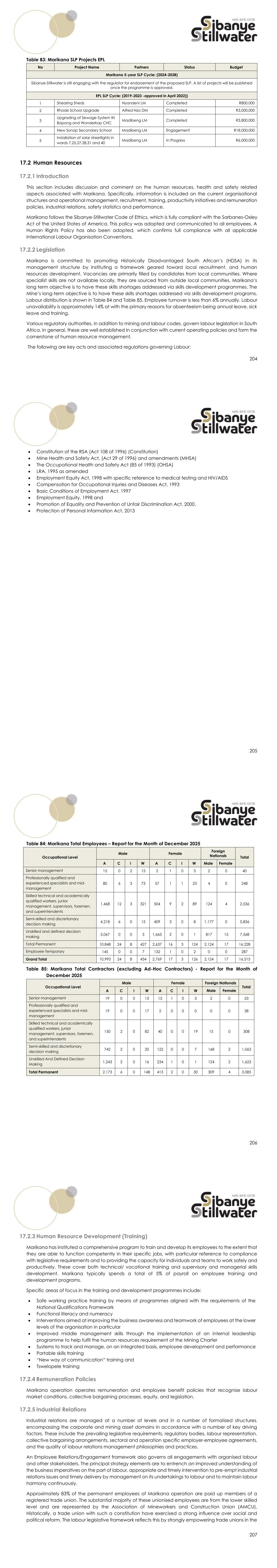 204 Table 83: Marikana SLP Projects EPL No Project Name Partners Status Budget Marikana 5-year SLP Cycle: (2024-2028) Sibanye-Stillwater is still engaging with the regulator for endorsement of the proposed SLP. A list of projects will be published once the programme is approved. EPL SLP Cycle: (2019-2023 -approved in April 2022)) 1 Shearing Sheds Nyandeni LM Completed R800,000 2 Rhode School Upgrade Alfred Nzo DM Completed R3,000,000 3 Upgrading of Sewage System IN Bapong and Wonderkop CHC Madibeng LM Completed R3,800,000 4 New Sonop Secondary School Madibeng LM Engagement R18,000,000 5 Installation of solar streetlights in wards 7,25,27,28,31 and 40 Madibeng LM In Progress R6,000,000 17.2 Human Resources 17.2.1 Introduction This section includes discussion and comment on the human resources, health and safety related aspects associated with Marikana. Specifically, information is included on the current organisational structures and operational management, recruitment, training, productivity initiatives and remuneration policies, industrial relations, safety statistics and performance. Marikana follows the Sibanye-Stillwater Code of Ethics, which is fully compliant with the Sarbanes-Oxley Act of the United States of America. This policy was adopted and communicated to all employees. A Human Rights Policy has also been adopted, which confirms full compliance with all applicable International Labour Organisation Conventions. 17.2.2 Legislation Marikana is committed to promoting Historically Disadvantaged South African’s (HDSA) in its management structure by instituting a framework geared toward local recruitment, and human resources development. Vacancies are primarily filled by candidates from local communities. Where specialist skills are not available locally, they are sourced from outside local communities. Marikana’s long term objective is to have these skills shortages addressed via skills development programmes. The Mine’s long-term objective is to have these skills shortages addressed via skills development programs. Labour distribution is shown in Table 84 and Table 85. Employee turnover is less than 6% annually. Labour unavailability is approximately 14% at with the primary reasons for absenteeism being annual leave, sick leave and training. Various regulatory authorities, in addition to mining and labour codes, govern labour legislation in South Africa. In general, these are well established in conjunction with current operating policies and form the cornerstone of human resource management. The following are key acts and associated regulations governing Labour: 205 • Constitution of the RSA (Act 108 of 1996) (Constitution) • Mine Health and Safety Act, (Act 29 of 1996) and amendments (MHSA) • The Occupational Health and Safety Act (85 of 1993) (OHSA) • LRA, 1995 as amended • Employment Equity Act, 1998 with specific reference to medical testing and HIV/AIDS • Compensation for Occupational Injuries and Diseases Act, 1993 • Basic Conditions of Employment Act, 1997 • Employment Equity, 1998 and • Promotion of Equality and Prevention of Unfair Discrimination Act, 2000. • Protection of Personal Information Act, 2013 206 Table 84: Marikana Total Employees – Report for the Month of December 2025 Occupational Level Male Female Foreign Nationals Total A C I W A C I W Male Female Senior management 15 0 2 15 2 1 0 3 2 0 40 Professionally qualified and experienced specialists and mid- management 80 6 3 73 57 1 1 23 4 0 248 Skilled technical and academically qualified workers, junior management, supervisors, foremen, and superintendents 1,468 12 3 321 504 9 2 89 124 4 2,536 Semi-skilled and discretionary decision making 4,218 6 0 15 409 3 0 8 1,177 0 5,836 Unskilled and defined decision making 5,067 0 0 3 1,665 2 0 1 817 13 7,568 Total Permanent 10,848 24 8 427 2,637 16 3 124 2,124 17 16,228 Employee-Temporary 145 0 0 7 132 1 0 2 0 0 287 Grand Total 10,993 24 8 434 2,769 17 3 126 2,124 17 16,515 Table 85: Marikana Total Contractors (excluding Ad-Hoc Contractors) - Report for the Month of December 2025 Occupational Level Male Female Foreign Nationals Total A C I W A C I W Male Female Senior management 19 0 0 13 15 1 0 3 2 0 53 Professionally qualified and experienced specialists and mid- management 19 0 0 17 2 0 0 0 0 0 38 Skilled technical and academically qualified workers, junior management, supervisors, foremen, and superintendents 150 2 0 82 40 0 0 19 15 0 308 Semi-skilled and discretionary decision making 742 2 0 20 122 0 0 7 168 2 1,063 Unskilled And Defined Decision Making 1,243 2 0 16 234 1 0 1 124 2 1,623 Total Permanent 2,173 6 0 148 413 2 0 30 309 4 3,085 207 17.2.3 Human Resource Development (Training) Marikana has instituted a comprehensive program to train and develop its employees to the extent that they are able to function competently in their specific jobs, with particular reference to compliance with legislative requirements and to providing the capacity for individuals and teams to work safely and productively. These cover both technical/ vocational training and supervisory and managerial skills development. Marikana typically spends a total of 5% of payroll on employee training and development programs. Specific areas of focus in the training and development programmes include: • Safe working practice training by means of programmes aligned with the requirements of the National Qualifications Framework • Functional literacy and numeracy • Interventions aimed at improving the business awareness and teamwork of employees at the lower levels of the organisation in particular • Improved middle management skills through the implementation of an internal leadership programme to help fulfil the human resources requirement of the Mining Charter • Systems to track and manage, on an integrated basis, employee development and performance • Portable skills training • “New way of communication” training and • Tswelopele training 17.2.4