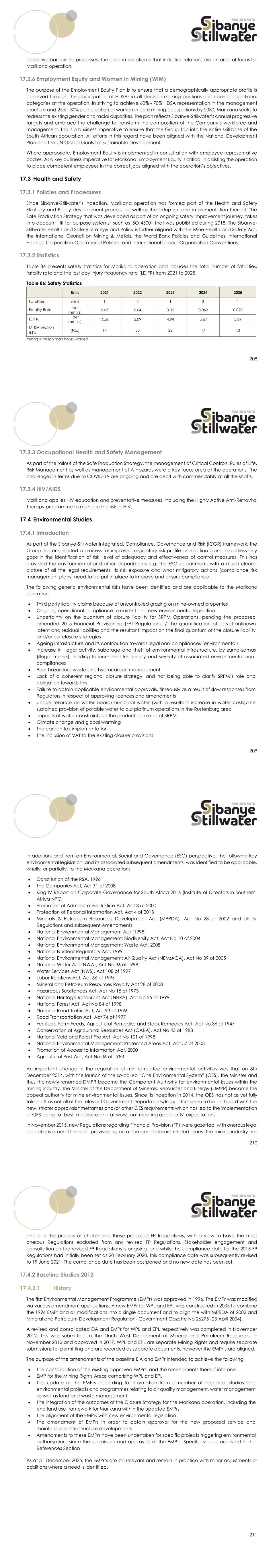 208 collective bargaining processes. The clear implication is that industrial relations are an area of focus for Marikana operation. 17.2.6 Employment Equity and Women in Mining (WIM) The purpose of the Employment Equity Plan is to ensure that a demographically appropriate profile is achieved through the participation of HDSAs in all decision-making positions and core occupational categories at the operation. In striving to achieve 60% - 70% HDSA representation in the management structure and 25% - 30% participation of women in core mining occupations by 2030, Marikana seeks to redress the existing gender and racial disparities. The plan reflects Sibanye-Stillwater’s annual progressive targets and embrace the challenge to transform the composition of the Company’s workforce and management. This is a business imperative to ensure that the Group tap into the entire skill base of the South African population. All efforts in this regard have been aligned with the National Development Plan and the UN Global Goals for Sustainable Development. Where appropriate, Employment Equity is implemented in consultation with employee representative bodies. As a key business imperative for Marikana, Employment Equity is critical in assisting the operation to place competent employees in the correct jobs aligned with the operation’s objectives. 17.3 Health and Safety 17.3.1 Policies and Procedures Since Sibanye-Stillwater’s inception, Marikana operation has formed part of the Health and Safety Strategy and Policy development process, as well as the adoption and implementation thereof. The Safe Production Strategy that was developed as part of an ongoing safety improvement journey, takes into account “fit for purpose systems” such as ISO 45001 that was published during 2018. The Sibanye- Stillwater Health and Safety Strategy and Policy is further aligned with the Mine Health and Safety Act, the International Council on Mining & Metals, the World Bank Policies and Guidelines, International Finance Corporation Operational Policies, and International Labour Organisation Conventions. 17.3.2 Statistics Table 86 presents safety statistics for Marikana operation and includes the total number of fatalities, fatality rate and the lost day injury frequency rate (LDIFR) from 2021 to 2025. Table 86: Safety Statistics Units 2021 2022 2023 2024 2025 Fatalities (No) 1 2 1 3 1 Fatality Rate (per mmhrs) 0.03 0.04 0.02 0.062 0.020 LDIFR (per mmhrs) 7.56 5.09 4.94 3.67 3.29 MHSA Section 54’s (No.) 17 30 22 17 10 mmhrs = million man hours worked 209 17.3.3 Occupational Health and Safety Management As part of the rollout of the Safe Production Strategy, the management of Critical Controls, Rules of Life, Risk Management as well as management of A Hazards were a key focus area at the operations. The challenges in terms due to COVID-19 are ongoing and are dealt with commendably at all the shafts. 17.3.4 HIV/AIDS Marikana applies HIV education and preventative measures, including the Highly Active Anti-Retroviral Therapy programme to manage the risk of HIV. 17.4 Environmental Studies 17.4.1 Introduction As part of the Sibanye-Stillwater Integrated, Compliance, Governance and Risk (ICGR) framework, the Group has embedded a process for improved regulatory risk profile and action plans to address any gaps in the identification of risk, level of adequacy and effectiveness of control measures. This has provided the environmental and other departments e.g. the ESG department, with a much clearer picture of all the legal requirements, its risk exposure and what mitigatory actions (compliance risk management plans) need to be put in place to improve and ensure compliance. The following generic environmental risks have been identified and are applicable to the Marikana operation: • Third party liability claims because of uncontrolled grazing on mine-owned properties • Ongoing operational compliance to current and new environmental legislation • Uncertainty on the quantum of closure liability for SRPM Operations, pending the proposed amended 2015 Financial Provisioning (FP) Regulations. / The quantification of as-yet unknown latent and residual liabilities and the resultant impact on the final quantum of the closure liability and/or our closure strategies • Ageing infrastructure and its contribution towards legal non-compliances (environmental) • Increase in illegal activity, sabotage and theft of environmental infrastructure, by zama-zamas (illegal miners), leading to increased frequency and severity of associated environmental non- compliances • Poor hazardous waste and hydrocarbon management • Lack of a coherent regional closure strategy, and not being able to clarify SRPM’s role and obligation towards this • Failure to obtain applicable environmental approvals, timeously as a result of slow responses from Regulators in respect of approving licences and amendments • Undue reliance on water board/municipal water (with a resultant increase in water costs)/The sustained provision of potable water to our platinum operations in the Rustenburg area • Impacts of water constraints on the production profile of SRPM • Climate change and global warming • The carbon tax implementation • The inclusion of VAT to the existing closure provisions 210 In addition, and from an Environmental, Social and Governance (ESG) perspective, the following key environmental legislation, and its associated subsequent amendments, was identified to be applicable, wholly, or partially, to the Marikana operation: • Constitution of the RSA, 1996 • The Companies Act, Act 71 of 2008 • King IV Report on Corporate Governance for South Africa 2016 (Institute of Directors in Southern Africa NPC) • Promotion of Administrative Justice Act, Act 3 of 2000 • Protection of Personal Information Act, Act 4 of 2013 • Minerals & Petroleum Resources Development Act (MPRDA), Act No 28 of 2002 and all its Regulations and subsequent Amendm
