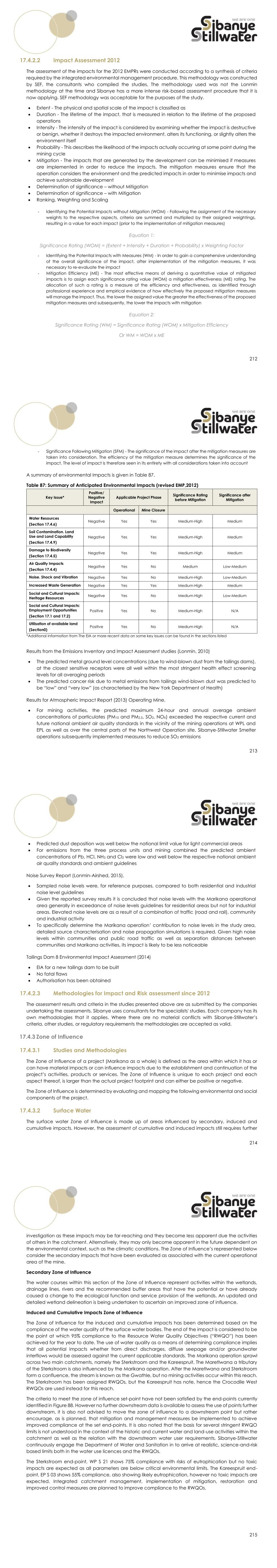 212 17.4.2.2 Impact Assessment 2012 The assessment of the impacts for the 2012 EMPRs were conducted according to a synthesis of criteria required by the integrated environmental management procedure. This methodology was constructed by SEF, the consultants who compiled the studies, The methodology used was not the Lonmin methodology at the time and Sibanye has a more intense risk-based assessment procedure that it is now applying. SEF methodology was acceptable for the purposes of the study. • Extent - The physical and spatial scale of the impact is classified as • Duration - The lifetime of the impact, that is measured in relation to the lifetime of the proposed operations • Intensity - The intensity of the impact is considered by examining whether the impact is destructive or benign, whether it destroys the impacted environment, alters its functioning, or slightly alters the environment itself • Probability - This describes the likelihood of the impacts actually occurring at some point during the mining cycle • Mitigation - The impacts that are generated by the development can be minimised if measures are implemented in order to reduce the impacts. The mitigation measures ensure that the operation considers the environment and the predicted impacts in order to minimise impacts and achieve sustainable development • Determination of significance – without Mitigation • Determination of significance – with Mitigation • Ranking, Weighting and Scaling - Identifying the Potential Impacts without Mitigation (WOM) - Following the assignment of the necessary weights to the respective aspects, criteria are summed and multiplied by their assigned weightings, resulting in a value for each impact (prior to the implementation of mitigation measures) Equation 1: Significance Rating (WOM) = (Extent + Intensity + Duration + Probability) x Weighting Factor - Identifying the Potential Impacts with Measures (WM) - In order to gain a comprehensive understanding of the overall significance of the impact, after implementation of the mitigation measures, it was necessary to re-evaluate the impact - Mitigation Efficiency (ME) - The most effective means of deriving a quantitative value of mitigated impacts is to assign each significance rating value (WOM) a mitigation effectiveness (ME) rating. The allocation of such a rating is a measure of the efficiency and effectiveness, as identified through professional experience and empirical evidence of how effectively the proposed mitigation measures will manage the impact. Thus, the lower the assigned value the greater the effectiveness of the proposed mitigation measures and subsequently, the lower the impacts with mitigation Equation 2: Significance Rating (WM) = Significance Rating (WOM) x Mitigation Efficiency Or WM = WOM x ME 213 - Significance Following Mitigation (SFM) - The significance of the impact after the mitigation measures are taken into consideration. The efficiency of the mitigation measure determines the significance of the impact. The level of impact is therefore seen in its entirety with all considerations taken into account A summary of environmental Impacts is given in Table 87. Table 87: Summary of Anticipated Environmental Impacts (revised EMP,2012) Key Issue* Positive/ Negative Impact Applicable Project Phase Significance Rating before Mitigation Significance after Mitigation Operational Mine Closure Water Resources (Section 17.4.6) Negative Yes Yes Medium-High Medium Soil Contamination. Land Use and Land Capability (Section 17.4.9) Negative Yes Yes Medium-High Medium Damage to Biodiversity (Section 17.4.5) Negative Yes Yes Medium-High Medium Air Quality Impacts (Section 17.4.4) Negative Yes No Medium Low-Medium Noise. Shock and Vibration Negative Yes No Medium-High Low-Medium Increased Waste Generation Negative Yes Yes Medium-High Medium Social and Cultural Impacts: Heritage Resources Negative Yes No Medium-High Low-Medium Social and Cultural Impacts: Employment Opportunities (Section 17.1 and 17.2) Positive Yes No Medium-High N/A Utilisation of available land (Section0) Positive Yes No Medium-High N/A *Additional Information from The EIA or more recent data on some key issues can be found in the sections listed Results from the Emissions Inventory and Impact Assessment studies (Lonmin, 2010) • The predicted metal ground level concentrations (due to wind-blown dust from the tailings dams), at the closest sensitive receptors were all well within the most stringent health effect screening levels for all averaging periods • The predicted cancer risk due to metal emissions from tailings wind-blown dust was predicted to be “low” and “very low” (as characterised by the New York Department of Health) Results for Atmospheric Impact Report (2013) Operating Mine. • For mining activities, the predicted maximum 24-hour and annual average ambient concentrations of particulates (PM10 and PM2.5, SO2, NOX) exceeded the respective current and future national ambient air quality standards in the vicinity of the mining operations at WPL and EPL as well as over the central parts of the Northwest Operation site. Sibanye-Stillwater Smelter operations subsequently implemented measures to reduce SO2 emissions 214 • Predicted dust deposition was well below the national limit value for light commercial areas • For emissions from the three process units and mining combined the predicted ambient concentrations of Pb, HCl, NH3 and Cl2 were low and well below the respective national ambient air quality standards and ambient guidelines Noise Survey Report (Lonmin-Airshed, 2015). • Sampled noise levels were, for reference purposes, compared to both residential and industrial noise level guidelines • Given the reported survey results it is concluded that noise levels with the Marikana operational area generally in exceedance of noise levels guidelines for residential areas but not for industrial areas. Elevated noise levels are as a 