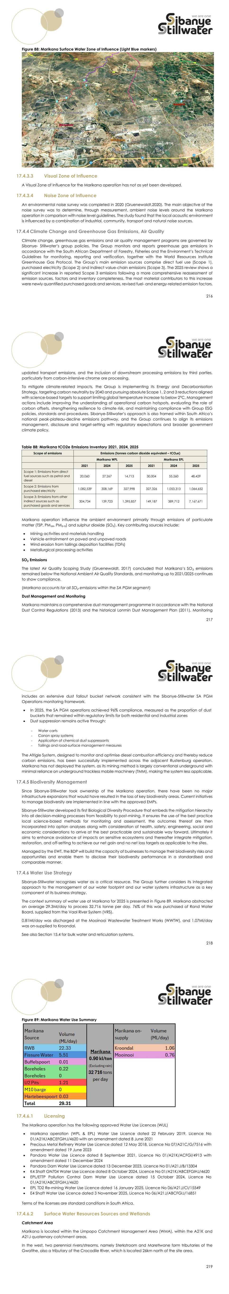 216 Figure 88: Marikana Surface Water Zone of Influence (Light Blue markers) 17.4.3.3 Visual Zone of Influence A Visual Zone of Influence for the Marikana operation has not as yet been developed. 17.4.3.4 Noise Zone of Influence An environmental noise survey was completed in 2020 (Gruenewaldt,2020). The main objective of the noise survey was to determine, through measurement, ambient noise levels around the Marikana operation in comparison with noise level guidelines. The study found that the local acoustic environment is influenced by a combination of industrial, community, transport and natural noise sources. 17.4.4 Climate Change and Greenhouse Gas Emissions, Air Quality Climate change, greenhouse gas emissions and air quality management programs are governed by Sibanye- Stillwater’s group policies. The Group monitors and reports greenhouse gas emissions in accordance with the South African Department of Forestry, Fisheries and the Environment’s Technical Guidelines for monitoring, reporting and verification, together with the World Resources Institute Greenhouse Gas Protocol. The Group’s main emission sources comprise direct fuel use (Scope 1), purchased electricity (Scope 2) and indirect value-chain emissions (Scope 3). The 2025 review shows a significant increase in reported Scope 3 emissions following a more comprehensive reassessment of emission sources, factors and inventory completeness. The most material contributors to this increase were newly quantified purchased goods and services, revised fuel- and energy-related emission factors, 217 updated transport emissions, and the inclusion of downstream processing emissions by third parties, particularly from carbon-intensive chrome ore processing. To mitigate climate-related impacts, the Group is implementing its Energy and Decarbonisation Strategy, targeting carbon neutrality by 2040 and pursuing absolute Scope 1, 2 and 3 reductions aligned with science-based targets to support limiting global temperature increase to below 2°C. Management actions include improving the understanding of operational carbon hotspots, evaluating the role of carbon offsets, strengthening resilience to climate risk, and maintaining compliance with Group ESG policies, standards and procedures. Sibanye-Stillwater’s approach is also framed within South Africa’s national peak-plateau-decline emissions pathway, and the Group continues to align its emissions management, disclosure and target-setting with regulatory expectations and broader government climate policy. Table 88: Marikana tCO2e Emissions Inventory 2021, 2024, 2025 Scope of emissions Emissions (tonnes carbon dioxide equivalent – tCO2e) Marikana WPL Marikana EPL 2021 2024 2025 2021 2024 2025 Scope 1: Emissions from direct fuel sources such as petrol and diesel 20,060 27,267 14,713 30,004 55,260 48,429 Scope 2: Emissions from purchased electricity 1,082,539 308,169 327,998 327,326 1,053,313 1,064,652 Scope 3: Emissions from other indirect sources such as purchased goods and services 304,734 139,723 1,395,857 149,187 389,712 7,167,671 Marikana operation influence the ambient environment primarily through emissions of particulate matter (TSP, PM₁₀, PM₂.₅) and sulphur dioxide (SO₂). Key contributing sources include: • Mining activities and materials handling • Vehicle entrainment on paved and unpaved roads • Wind erosion from tailings deposition facilities (TDFs) • Metallurgical processing activities SO₂ Emissions The latest Air Quality Scoping Study (Gruenewaldt, 2017) concluded that Marikana’s SO₂ emissions remained below the National Ambient Air Quality Standards, and monitoring up to 2021/2025 continues to show compliance. (Marikana accounts for all SO₂ emissions within the SA PGM segment) Dust Management and Monitoring Marikana maintains a comprehensive dust management programme in accordance with the National Dust Control Regulations (2013) and the historical Lonmin Dust Management Plan (2011). Monitoring 218 includes an extensive dust fallout bucket network consistent with the Sibanye‑Stillwater SA PGM Operations monitoring framework. • In 2025, the SA PGM operations achieved 96% compliance, measured as the proportion of dust buckets that remained within regulatory limits for both residential and industrial zones • Dust suppression remains active through: - Water carts - Canon spray systems - Application of chemical dust suppressants - Tailings and road‑surface management measures The Afrigle System, designed to monitor and optimise diesel combustion efficiency and thereby reduce carbon emissions, has been successfully implemented across the adjacent Rustenburg operation. Marikana has not deployed the system, as its mining method is largely conventional underground with minimal reliance on underground trackless mobile machinery (TMM), making the system less applicable. 17.4.5 Biodiversity Management Since Sibanye-Stillwater took ownership of the Marikana operation, there have been no major infrastructure expansions that would have resulted in the loss of key biodiversity areas. Current initiatives to manage biodiversity are implemented in line with the approved EMPs. Sibanye-Stillwater developed its first Biological Diversity Procedure that embeds the mitigation hierarchy into all decision-making processes from feasibility to post-mining. It ensures the use of the best practice local science-based methods for monitoring and assessment, the outcomes thereof are then incorporated into option analyses along with consideration of health, safety, engineering, social and economic considerations to arrive at the best practicable and sustainable way forward. Ultimately it aims to enhance avoidance of impacts on sensitive ecosystems and thereafter integrate mitigation, restoration, and off-setting to achieve our net gain and no net loss targets as applicable to the sites. Managed by the EWT, the BDP will build the capacity of businesses to manage their biodi