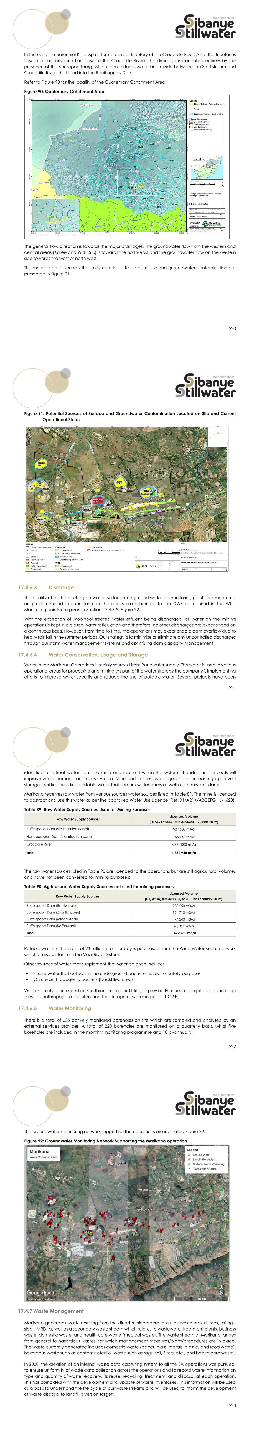 220 In the east, the perennial Kareespruit forms a direct tributary of the Crocodile River. All of the tributaries flow in a northerly direction (toward the Crocodile River). The drainage is controlled entirely by the presence of the Kareepoortberg, which forms a local watershed divide between the Sterkstroom and Crocodile Rivers that feed into the Rooikoppies Dam. Refer to Figure 90 for the locality of the Quaternary Catchment Area. Figure 90: Quaternary Catchment Area The general flow direction is towards the major drainages. The groundwater flow from the western and central areas (Karee and WPL TSFs) is towards the north-east and the groundwater flow on the western side towards the west or north west. The main potential sources that may contribute to both surface and groundwater contamination are presented in Figure 91. 221 Figure 91: Potential Sources of Surface and Groundwater Contamination Located on Site and Current Operational Status 17.4.6.3 Discharge The quality of all the discharged water, surface and ground water at monitoring points are measured on predetermined frequencies and the results are submitted to the DWS as required in the WUL. Monitoring points are given in Section 17.4.6.5, Figure 92. With the exception of Mooinooi treated water effluent being discharged, all water on the mining operations is kept in a closed water reticulation and therefore, no other discharges are experienced on a continuous basis. However, from time to time, the operations may experience a dam overflow due to heavy rainfall in the summer periods. Our strategy is to minimise or eliminate any uncontrolled discharges through our storm water management systems and optimising dam capacity management. 17.4.6.4 Water Conservation, Usage and Storage Water in the Marikana Operations is mainly sourced from Randwater supply. This water is used in various operational areas for processing and mining. As part of the water strategy the company is implementing efforts to improve water security and reduce the use of potable water. Several projects have been 222 identified to retreat water from the mine and re-use it within the system. The identified projects will improve water demand and conservation. Mine and process water gets stored in existing approved storage facilities including portable water tanks, return water dams as well as stormwater dams. Marikana receives raw water from various sources water sources listed in Table 89. The mine is licenced to abstract and use this water as per the approved Water Use Licence (Ref: 01/A21K/ABCEFGIHJ/4620). Table 89: Raw Water Supply Sources Used for Mining Purposes Raw Water Supply Sources Licensed Volume (01/A21K/ABCDEFGIJ/4620 – 22 Feb 2019) Buffelspoort Dam (via irrigation canal) 927,500 m3/a Hartbeespoort Dam (via irrigation canal) 255,440 m3/a Crocodile River 3,650,000 m3/a Total 4,832,940 m3/a The raw water sources listed in Table 90 are licenced to the operations but are still agricultural volumes and have not been converted for mining purposes: Table 90: Agricultural Water Supply Sources not used for mining purposes Raw Water Supply Sources Licensed Volume (01/A21K/ABCDEFGIJ/4620 – 22 February 2019) Buffelspoort Dam (Rooikoppies) 755,250 m3/a Buffelspoort Dam (Zwartkoppies) 321,710 m3/a Buffelspoort Dam (Middelkraal) 497,240 m3/a Buffelspoort Dam (Kaffirskraal) 98,580 m3/a Total 1,672,780 m3/a Potable water in the order of 23 million litres per day is purchased from the Rand Water Board network which draws water from the Vaal River System. Other sources of water that supplement the water balance include: • Fissure water that collects in the underground and is removed for safety purposes • On site anthropogenic aquifers (backfilled areas) Water security is increased on site through the backfilling of previously mined open pit areas and using these as anthropogenic aquifers and the storage of water in-pit i.e., UG2 Pit. 17.4.6.5 Water Monitoring There is a total of 235 actively monitored boreholes on site which are sampled and analysed by an external services provider. A total of 220 boreholes are monitored on a quarterly basis, whilst five boreholes are included in the monthly monitoring programme and 10 bi-annually. 223 The groundwater monitoring network supporting the operations are indicated Figure 92. Figure 92: Groundwater Monitoring Network Supporting the Marikana operation 17.4.7 Waste Management Marikana generates waste resulting from the direct mining operations (i.e., waste rock dumps, tailings, slag – MRD) as well as a secondary waste stream which relates to wastewater treatment plants, business waste, domestic waste, and health care waste (medical waste). The waste stream at Marikana ranges from general to hazardous wastes, for which management measures/plans/procedures are in place. The waste currently generated includes domestic waste (paper, glass, metals, plastic, and food waste), hazardous waste such as contaminated oil waste such as rags, soil, filters, etc., and health care waste. In 2020, the creation of an internal waste data capturing system to all the SA operations was pursued, to ensure uniformity of waste data collection across the operations and to record waste information on type and quantity of waste recovery, its reuse, recycling, treatment, and disposal at each operation. This has coincided with the development and update of waste inventories. This information will be used as a basis to understand the life cycle of our waste streams and will be used to inform the development of waste disposal to landfill diversion target.