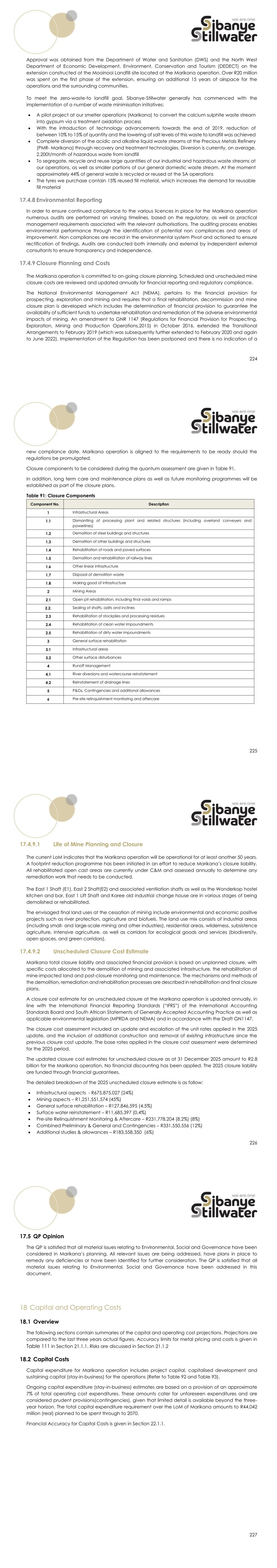 224 Approval was obtained from the Department of Water and Sanitation (DWS) and the North West Department of Economic Development, Environment, Conservation and Tourism (DEDECT) on the extension constructed at the Mooinooi Landfill site located at the Marikana operation. Over R20 million was spent on the first phase of the extension, ensuring an additional 15 years of airspace for the operations and the surrounding communities. To meet the zero-waste-to landfill goal, Sibanye-Stillwater generally has commenced with the implementation of a number of waste minimisation initiatives: • A pilot project at our smelter operations (Marikana) to convert the calcium sulphite waste stream into gypsum via a treatment oxidation process • With the introduction of technology advancements towards the end of 2019, reduction of between 10% to 15% of quantity and the lowering of salt levels of this waste to landfill was achieved • Complete diversion of the acidic and alkaline liquid waste streams at the Precious Metals Refinery (PMR- Marikana) through recovery and treatment technologies. Diversion is currently, on average, 2,200t/month of hazardous waste from landfill • To segregate, recycle and reuse large quantities of our industrial and hazardous waste streams at our operations, as well as smaller portions of our general domestic waste stream. At the moment approximately 44% of general waste is recycled or reused at the SA operations • The tyres we purchase contain 15% reused fill material, which increases the demand for reusable fill material 17.4.8 Environmental Reporting In order to ensure continued compliance to the various licences in place for the Marikana operation numerous audits are performed on varying timelines, based on the regulatory, as well as practical management requirements associated with the relevant authorisations. The auditing process enables environmental performance through the identification of potential non compliances and areas of improvement. Non compliances are record in the environmental system Pivot and actioned to ensure rectification of findings. Audits are conducted both internally and external by independent external consultants to ensure transparency and independence. 17.4.9 Closure Planning and Costs The Marikana operation is committed to on-going closure planning. Scheduled and unscheduled mine closure costs are reviewed and updated annually for financial reporting and regulatory compliance. The National Environmental Management Act (NEMA), pertains to the financial provision for prospecting, exploration and mining and requires that a final rehabilitation, decommission and mine closure plan is developed which includes the determination of financial provision to guarantee the availability of sufficient funds to undertake rehabilitation and remediation of the adverse environmental impacts of mining. An amendment to GNR 1147 (Regulations for Financial Provision for Prospecting, Exploration, Mining and Production Operations,2015) in October 2016, extended the Transitional Arrangements to February 2019 (which was subsequently further extended to February 2020 and again to June 2022). Implementation of the Regulation has been postponed and there is no indication of a 225 new compliance date. Marikana operation is aligned to the requirements to be ready should the regulations be promulgated. Closure components to be considered during the quantum assessment are given in Table 91. In addition, long term care and maintenance plans as well as future monitoring programmes will be established as part of the closure plans. Table 91: Closure Components Component No. Description 1 Infrastructural Areas 1.1 Dismantling of processing plant and related structures (including overland conveyers and powerlines) 1.2 Demolition of steel buildings and structures 1.3 Demolition of other buildings and structures 1.4 Rehabilitation of roads and paved surfaces 1.5 Demolition and rehabilitation of railway lines 1.6 Other linear infrastructure 1.7 Disposal of demolition waste 1.8 Making good of infrastructure 2 Mining Areas 2.1 Open pit rehabilitation, including final voids and ramps 2.2. Sealing of shafts, adits and inclines 2.3 Rehabilitation of stockpiles and processing residues 2.4 Rehabilitation of clean water impoundments 2.5 Rehabilitation of dirty water impoundments 3 General surface rehabilitation 3.1 Infrastructural areas 3.2 Other surface disturbances 4 Runoff Management 4.1 River diversions and watercourse reinstatement 4.2 Reinstatement of drainage lines 5 P&Gs, Contingencies and additional allowances 6 Pre-site relinquishment monitoring and aftercare 226 17.4.9.1 Life of Mine Planning and Closure The current LoM indicates that the Marikana operation will be operational for at least another 50 years. A footprint reduction programme has been initiated in an effort to reduce Marikana’s closure liability. All rehabilitated open cast areas are currently under C&M and assessed annually to determine any remediation work that needs to be conducted. The East 1 Shaft (E1), East 2 Shaft(E2) and associated ventilation shafts as well as the Wonderkop hostel kitchen and bar, East 1 Lift Shaft and Karee old industrial change house are in various stages of being demolished or rehabilitated. The envisaged final land uses at the cessation of mining include environmental and economic positive projects such as river protection, agriculture and biofuels. The land use mix consists of industrial areas (including small- and large-scale mining and other industries), residential areas, wilderness, subsistence agriculture, intensive agriculture, as well as corridors for ecological goods and services (biodiversity, open spaces, and green corridors). 17.4.9.2 Unscheduled Closure Cost Estimate Marikana total closure liability and associated financial provision is based on unplanned closure, with specific costs allocated to the demolition of mining and associated infrastructure, the rehabilitation of 