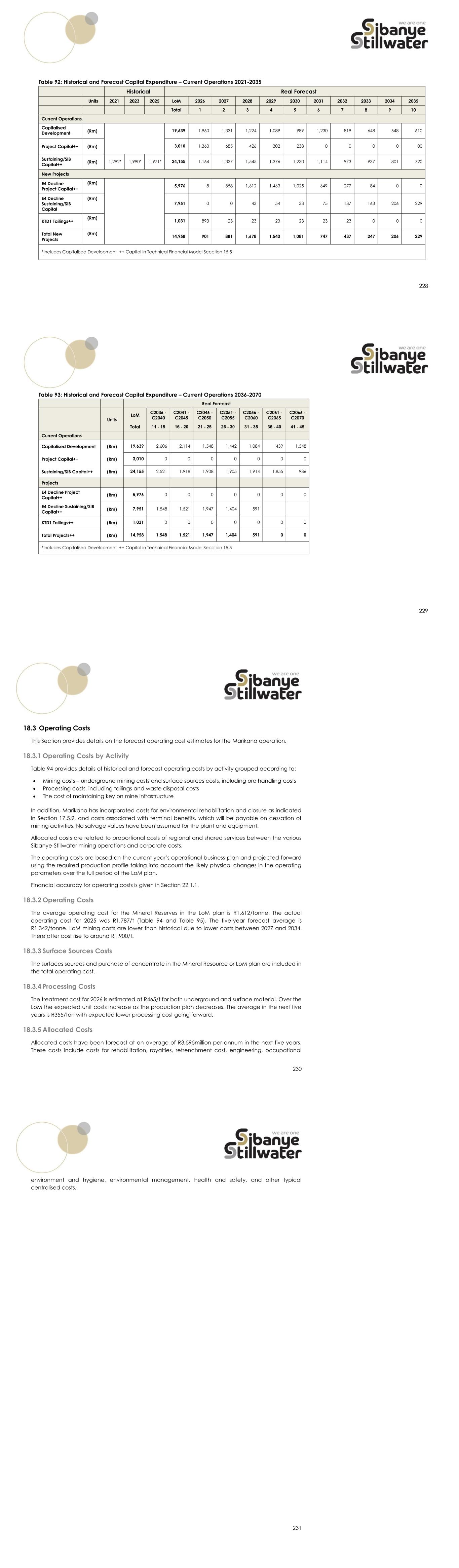 228 Table 92: Historical and Forecast Capital Expenditure – Current Operations 2021-2035 Historical Real Forecast Units 2021 2023 2025 LoM 2026 2027 2028 2029 2030 2031 2032 2033 2034 2035 Total 1 2 3 4 5 6 7 8 9 10 Current Operations Capitalised Development (Rm) 19,639 1,960 1,331 1,224 1,089 989 1,230 819 648 648 610 Project Capital++ (Rm) 3,010 1,360 685 426 302 238 0 0 0 0 00 Sustaining/SIB Capital++ (Rm) 1,292* 1,990* 1,971* 24,155 1,164 1,337 1,545 1,376 1,230 1,114 973 937 801 720 New Projects E4 Decline Project Capital++ (Rm) 5,976 8 858 1,612 1,463 1,025 649 277 84 0 0 E4 Decline Sustaining/SIB Capital (Rm) 7,951 0 0 43 54 33 75 137 163 206 229 KTD1 Tailings++ (Rm) 1,031 893 23 23 23 23 23 23 0 0 0 Total New Projects (Rm) 14,958 901 881 1,678 1,540 1,081 747 437 247 206 229 *Includes Capitalised Development ++ Capital in Technical Financial Model Secction 15.5 229 Table 93: Historical and Forecast Capital Expenditure – Current Operations 2036-2070 Real Forecast Units LoM C2036 - C2040 C2041 - C2045 C2046 - C2050 C2051 - C2055 C2056 - C2060 C2061 - C2065 C2066 - C2070 Total 11 - 15 16 - 20 21 - 25 26 - 30 31 - 35 36 - 40 41 - 45 Current Operations Capitalised Development (Rm) 19,639 2,606 2,114 1,548 1,442 1,084 439 1,548 Project Capital++ (Rm) 3,010 0 0 0 0 0 0 0 Sustaining/SIB Capital++ (Rm) 24,155 2,521 1,918 1,908 1,905 1,914 1,855 936 Projects E4 Decline Project Capital++ (Rm) 5,976 0 0 0 0 0 0 0 E4 Decline Sustaining/SIB Capital++ (Rm) 7,951 1,548 1,521 1,947 1,404 591 KTD1 Tailings++ (Rm) 1,031 0 0 0 0 0 0 0 Total Projects++ (Rm) 14,958 1,548 1,521 1,947 1,404 591 0 0 *Includes Capitalised Development ++ Capital in Technical Financial Model Secction 15.5 230 18.3 Operating Costs This Section provides details on the forecast operating cost estimates for the Marikana operation. 18.3.1 Operating Costs by Activity Table 94 provides details of historical and forecast operating costs by activity grouped according to: • Mining costs – underground mining costs and surface sources costs, including ore handling costs • Processing costs, including tailings and waste disposal costs • The cost of maintaining key on mine infrastructure In addition, Marikana has incorporated costs for environmental rehabilitation and closure as indicated in Section 17.5.9, and costs associated with terminal benefits, which will be payable on cessation of mining activities. No salvage values have been assumed for the plant and equipment. Allocated costs are related to proportional costs of regional and shared services between the various Sibanye-Stillwater mining operations and corporate costs. The operating costs are based on the current year’s operational business plan and projected forward using the required production profile taking into account the likely physical changes in the operating parameters over the full period of the LoM plan. Financial accuracy for operating costs is given in Section 22.1.1. 18.3.2 Operating Costs The average operating cost for the Mineral Reserves in the LoM plan is R1,612/tonne. The actual operating cost for 2025 was R1,787/t (Table 94 and Table 95). The five-year forecast average is R1,342/tonne. LoM mining costs are lower than historical due to lower costs between 2027 and 2034. There after cost rise to around R1,900/t. 18.3.3 Surface Sources Costs The surfaces sources and purchase of concentrate in the Mineral Resource or LoM plan are included in the total operating cost. 18.3.4 Processing Costs The treatment cost for 2026 is estimated at R465/t for both underground and surface material. Over the LoM the expected unit costs increase as the production plan decreases. The average in the next five years is R355/ton with expected lower processing cost going forward. 18.3.5 Allocated Costs Allocated costs have been forecast at an average of R3,595million per annum in the next five years. These costs include costs for rehabilitation, royalties, retrenchment cost, engineering, occupational 231 environment and hygiene, environmental management, health and safety, and other typical centralised costs.