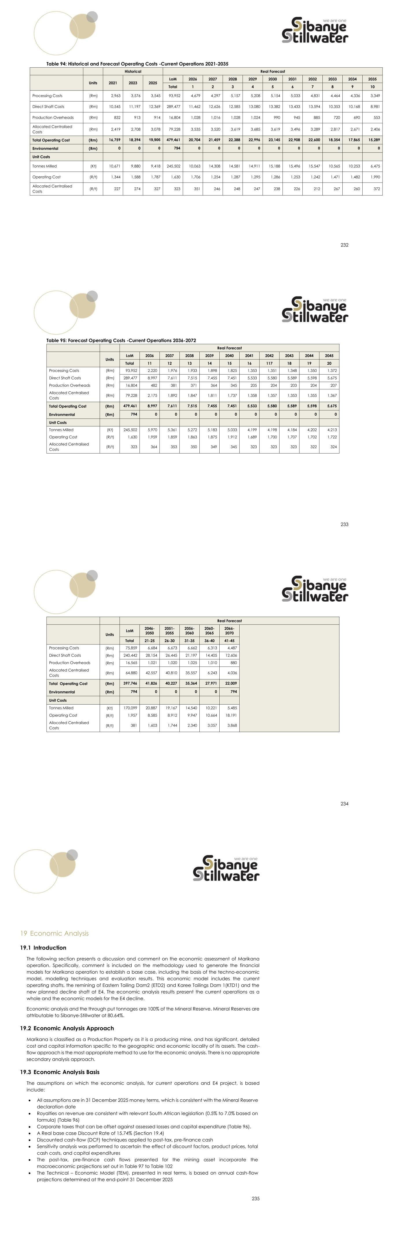 232 Table 94: Historical and Forecast Operating Costs -Current Operations 2021-2035 Historical Real Forecast Units 2021 2023 2025 LoM 2026 2027 2028 2029 2030 2031 2032 2033 2034 2035 Total 1 2 3 4 5 6 7 8 9 10 Processing Costs (Rm) 2,963 3,576 3,545 93,952 4,679 4,297 5,157 5,208 5,154 5,033 4,831 4,464 4,336 3,349 Direct Shaft Costs (Rm) 10,545 11,197 12,369 289,477 11,462 12,626 12,585 13,080 13,382 13,433 13,594 10,353 10,168 8,981 Production Overheads (Rm) 832 913 914 16,804 1,028 1,016 1,028 1,024 990 945 885 720 690 553 Allocated Centralised Costs (Rm) 2,419 2,708 3,078 79,228 3,535 3,520 3,619 3,685 3,619 3,496 3,289 2,817 2,671 2,406 Total Operating Cost (Rm) 16,759 18,394 19,906 479,461 20,704 21,459 22,388 22,996 23,145 22,908 22,600 18,354 17,865 15,289 Environmental (Rm) 0 0 0 794 0 0 0 0 0 0 0 0 0 0 Unit Costs Tonnes Milled (Kt) 10,671 9,880 9,418 245,502 10,063 14,308 14,581 14,911 15,188 15,496 15,547 10,565 10,253 6,475 Operating Cost (R/t) 1,344 1,588 1,787 1,630 1,706 1,254 1,287 1,295 1,286 1,253 1,242 1,471 1,482 1,990 Allocated Centralised Costs (R/t) 227 274 327 323 351 246 248 247 238 226 212 267 260 372 233 Table 95: Forecast Operating Costs -Current Operations 2036-2072 Real Forecast Units LoM 2036 2037 2038 2039 2040 2041 2042 2043 2044 2045 Total 11 12 13 14 15 16 117 18 19 20 Processing Costs (Rm) 93,952 2,220 1,976 1,933 1,898 1,825 1,353 1,351 1,348 1,350 1,372 Direct Shaft Costs (Rm) 289,477 8,997 7,611 7,515 7,455 7,451 5,533 5,580 5,589 5,598 5,675 Production Overheads (Rm) 16,804 482 381 371 364 345 205 204 203 204 207 Allocated Centralised Costs (Rm) 79,228 2,175 1,892 1,847 1,811 1,737 1,358 1,357 1,353 1,355 1,367 Total Operating Cost (Rm) 479,461 8,997 7,611 7,515 7,455 7,451 5,533 5,580 5,589 5,598 5,675 Environmental (Rm) 794 0 0 0 0 0 0 0 0 0 0 Unit Costs Tonnes Milled (Kt) 245,502 5,970 5,361 5,272 5,183 5,033 4,199 4,198 4,184 4,202 4,213 Operating Cost (R/t) 1,630 1,959 1,859 1,863 1,875 1,912 1,689 1,700 1,707 1,702 1,722 Allocated Centralised Costs (R/t) 323 364 353 350 349 345 323 323 323 322 324 234 Real Forecast Units LoM 2046- 2050 2051- 2055 2056- 2060 2060- 2065 2066- 2070 Total 21-25 26-30 31-35 36-40 41-45 Processing Costs (Rm) 75,859 6,684 6,673 6,662 6,313 4,487 Direct Shaft Costs (Rm) 240,442 28,154 26,445 21,197 14,405 12,606 Production Overheads (Rm) 16,565 1,021 1,020 1,025 1,010 880 Allocated Centralised Costs (Rm) 64,880 42,557 40,810 35,557 6,243 4,036 Total Operating Cost (Rm) 397,746 41,826 40,227 35,364 27,971 22,009 Environmental (Rm) 794 0 0 0 0 794 Unit Costs Tonnes Milled (Kt) 170,099 20,887 19,167 14,540 10,221 5,485 Operating Cost (R/t) 1,957 8,585 8,912 9,947 10,664 18,191 Allocated Centralised Costs (R/t) 381 1,603 1,744 2,340 3,057 3,868 235 19 Economic Analysis 19.1 Introduction The following section presents a discussion and comment on the economic assessment of Marikana operation. Specifically, comment is included on the methodology used to generate the financial models for Marikana operation to establish a base case, including the basis of the techno-economic model, modelling techniques and evaluation results. This economic model includes the current operating shafts, the remining of Eastern Tailing Dam2 (ETD2) and Karee Tailings Dam 1(KTD1) and the new planned decline shaft at E4. The economic analysis results present the current operations as a whole and the economic models for the E4 decline. Economic analysis and the through put tonnages are 100% of the Mineral Reserve. Mineral Reserves are attributable to Sibanye-Stillwater at 80.64%. 19.2 Economic Analysis Approach Marikana is classified as a Production Property as it is a producing mine, and has significant, detailed cost and capital information specific to the geographic and economic locality of its assets. The cash- flow approach is the most appropriate method to use for the economic analysis. There is no appropriate secondary analysis approach. 19.3 Economic Analysis Basis The assumptions on which the economic analysis, for current operations and E4 project, is based include: • All assumptions are in 31 December 2025 money terms, which is consistent with the Mineral Reserve declaration date • Royalties on revenue are consistent with relevant South African legislation (0.5% to 7.0% based on formula) (Table 96) • Corporate taxes that can be offset against assessed losses and capital expenditure (Table 96). • A Real base case Discount Rate of 15.74% (Section 19.4) • Discounted cash-flow (DCF) techniques applied to post-tax, pre-finance cash • Sensitivity analysis was performed to ascertain the effect of discount factors, product prices, total cash costs, and capital expenditures • The post-tax, pre-finance cash flows presented for the mining asset incorporate the macroeconomic projections set out in Table 97 to Table 102 • The Technical – Economic Model (TEM), presented in real terms, is based on annual cash-flow projections determined at the end-point 31 December 2025
