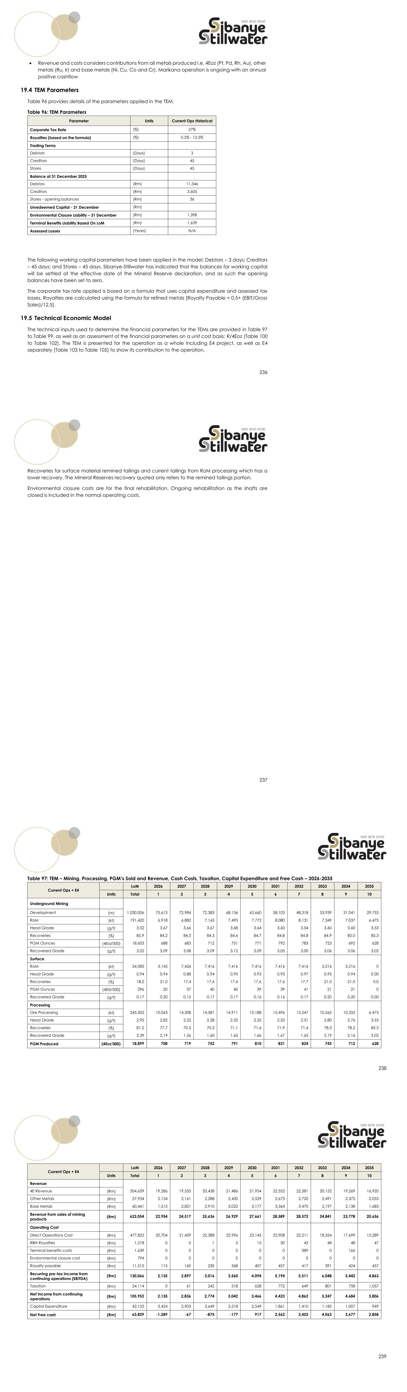 236 • Revenue and costs considers contributions from all metals produced i.e. 4Eoz (Pt, Pd, Rh, Au), other metals (Ru, Ir) and base metals (Ni, Cu, Co and Cr). Marikana operation is ongoing with an annual positive cashflow 19.4 TEM Parameters Table 96 provides details of the parameters applied in the TEM. Table 96: TEM Parameters Parameter Units Current Ops Historical Corporate Tax Rate (%) 27% Royalties (based on the formula) (%) 0.5% - 12.5% Trading Terms Debtors (Days) 3 Creditors (Days) 45 Stores (Days) 45 Balance at 31 December 2025 Debtors (Rm) 11,346 Creditors (Rm) 3,605 Stores - opening balances (Rm) 36 Unredeemed Capital - 31 December (Rm) Environmental Closure Liability – 31 December (Rm) 1,398 Terminal Benefits Liability Based On LoM (Rm) 1,639 Assessed Losses (Years) N/A The following working capital parameters have been applied in the model: Debtors – 3 days; Creditors – 45 days; and Stores – 45 days. Sibanye-Stillwater has indicated that the balances for working capital will be settled at the effective date of the Mineral Reserve declaration, and as such the opening balances have been set to zero. The corporate tax rate applied is based on a formula that uses capital expenditure and assessed tax losses. Royalties are calculated using the formula for refined metals [Royalty Payable = 0.5+ (EBIT/Gross Sales)/12.5]. 19.5 Technical Economic Model The technical inputs used to determine the financial parameters for the TEMs are provided in Table 97 to Table 99, as well as an assessment of the financial parameters on a unit cost basis: R/4Eoz (Table 100 to Table 102). The TEM is presented for the operation as a whole including E4 project, as well as E4 separately (Table 103 to Table 105) to show its contribution to the operation. 237 Recoveries for surface material remined tailings and current tailings from RoM processing which has a lower recovery. The Mineral Reserves recovery quoted only refers to the remined tailings portion. Environmental closure costs are for the final rehabilitation. Ongoing rehabilitation as the shafts are closed is included in the normal operating costs. 238 Table 97: TEM – Mining, Processing, PGM’s Sold and Revenue, Cash Costs, Taxation, Capital Expenditure and Free Cash – 2026-2035 Current Ops + E4 LoM 2026 2027 2028 2029 2030 2031 2032 2033 2034 2035 Units Total 1 2 3 4 5 6 7 8 9 10 Underground Mining Development (m) 1,030,006 75,613 72,984 72,383 68,136 63,660 58,103 48,318 33,939 31,041 29,753 RoM (kt) 191,420 6,918 6,882 7,165 7,495 7,772 8,080 8,131 7,349 7,037 6,475 Head Grade (g/t) 3.52 3.67 3.66 3.67 3.68 3.64 3.60 3.54 3.60 3.60 3.53 Recoveries (%) 85.9 84.2 84.3 84.3 84.6 84.7 84.8 84.8 84.9 85.0 85.3 PGM Ounces (4Eoz'000) 18,603 688 683 712 751 771 792 783 723 692 628 Recovered Grade (g/t) 3.02 3.09 3.08 3.09 3.12 3.09 3.05 3.00 3.06 3.06 3.02 Surface RoM (kt) 54,083 3,145 7,426 7,416 7,416 7,416 7,416 7,416 3,216 3,216 0 Head Grade (g/t) 0.94 0.94 0.88 0.94 0.95 0.93 0.93 0.97 0.95 0.94 0.00 Recoveries (%) 18.2 21.0 17.4 17.6 17.6 17.6 17.6 17.7 21.0 21.0 0.0 PGM Ounces (4E0z'000) 296 20 37 40 40 39 39 41 21 21 0 Recovered Grade (g/t) 0.17 0.20 0.15 0.17 0.17 0.16 0.16 0.17 0.20 0.20 0.00 Processing Ore Processing (kt) 245,502 10,063 14,308 14,581 14,911 15,188 15,496 15,547 10,565 10,253 6,475 Head Grade (g/t) 2.95 2.82 2.22 2.28 2.32 2.32 2.32 2.31 2.80 2.76 3.53 Recoveries (%) 81.2 77.7 70.5 70.3 71.1 71.6 71.9 71.4 78.3 78.2 85.3 Recovered Grade (g/t) 2.39 2.19 1.56 1.60 1.65 1.66 1.67 1.65 2.19 2.16 3.02 PGM Produced (4Eoz’000) 18,899 708 719 752 791 810 831 824 743 712 628 239 Current Ops + E4 LoM 2026 2027 2028 2029 2030 2031 2032 2033 2034 2035 Units Total 1 2 3 4 5 6 7 8 9 10 Revenue 4E Revenue (Rm) 504,659 19,286 19,535 20,438 21,486 21,954 22,552 22,381 20,152 19,269 16,920 Other Metals (Rm) 57,934 2,154 2,161 2,288 2,420 2,529 2,673 2,720 2,491 2,372 2,053 Base Metals (Rm) 60,461 1,515 2,821 2,910 3,022 3,177 3,364 3,470 2,197 2,138 1,683 Revenue from sales of mining products (Rm) 623,054 22,954 24,517 25,636 26,929 27,661 28,589 28,572 24,841 23,778 20,656 Operating Cost Direct Operations Cost (Rm) 477,822 20,704 21,459 22,388 22,996 23,145 22,908 22,211 18,354 17,699 15,289 RBN Royalties (Rm) 1,218 0 0 1 5 15 30 43 48 48 47 Terminal benefits costs (Rm) 1,639 0 0 0 0 0 0 389 0 166 0 Environmental closure cost (Rm) 794 0 0 0 0 0 0 0 0 0 0 Royalty payable (Rm) 11,515 115 160 230 368 407 457 417 391 424 457 Recurring pre-tax income from continuing operations (EBITDA) (Rm) 130,066 2,135 2,897 3,016 3,560 4,094 5,194 5,511 6,048 5,442 4,863 Taxation (Rm) 24,114 0 61 242 518 628 772 649 801 758 1,057 Net Income from continuing operations (Rm) 105,952 2,135 2,836 2,774 3,042 3,466 4,423 4,862 5,247 4,684 3,806 Capital Expenditure (Rm) 42,123 3,424 2,903 3,649 3,218 2,549 1,861 1,410 1,185 1,007 949 Net Free cash (Rm) 63,829 -1,289 -67 -875 -177 917 2,562 3,452 4,062 3,677 2,858