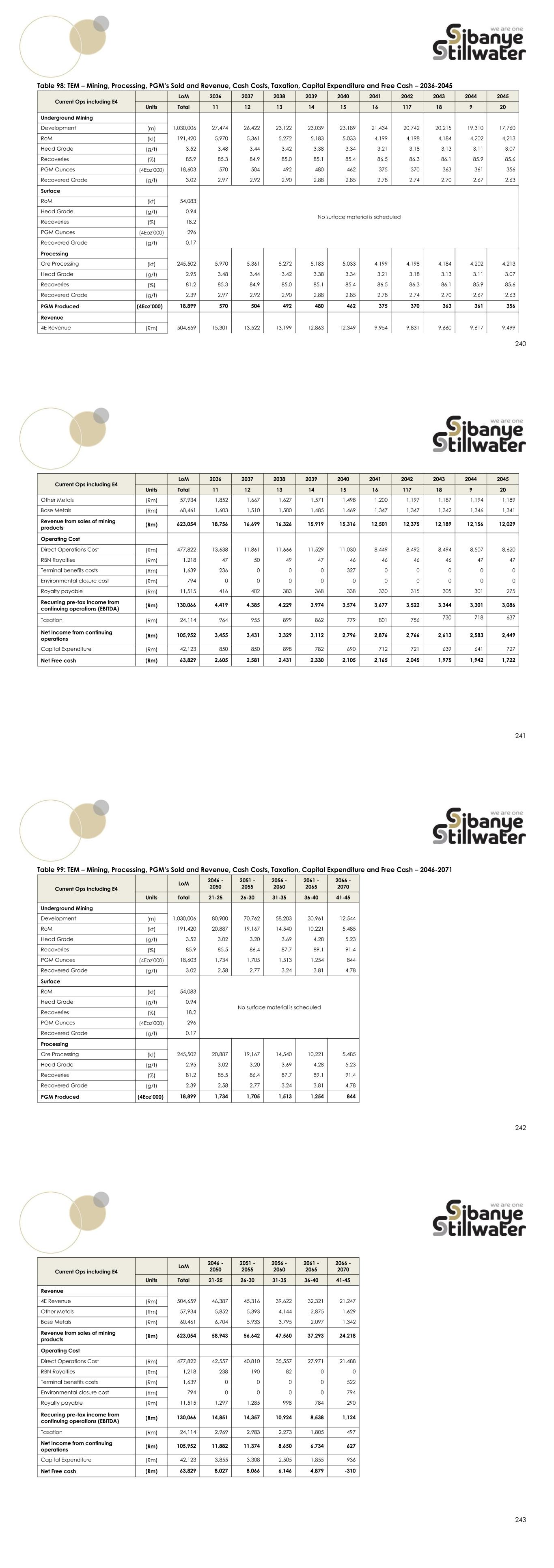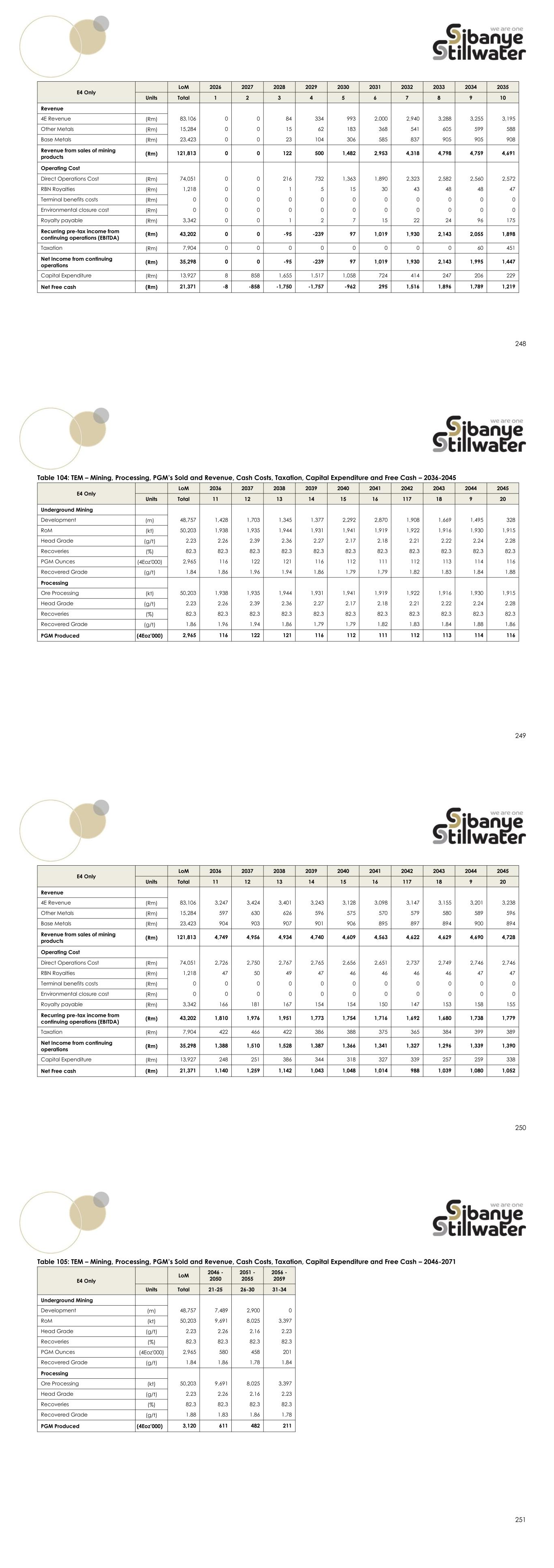 248 E4 Only LoM 2026 2027 2028 2029 2030 2031 2032 2033 2034 2035 Units Total 1 2 3 4 5 6 7 8 9 10 Revenue 4E Revenue (Rm) 83,106 0 0 84 334 993 2,000 2,940 3,288 3,255 3,195 Other Metals (Rm) 15,284 0 0 15 62 183 368 541 605 599 588 Base Metals (Rm) 23,423 0 0 23 104 306 585 837 905 905 908 Revenue from sales of mining products (Rm) 121,813 0 0 122 500 1,482 2,953 4,318 4,798 4,759 4,691 Operating Cost Direct Operations Cost (Rm) 74,051 0 0 216 732 1,363 1,890 2,323 2,582 2,560 2,572 RBN Royalties (Rm) 1,218 0 0 1 5 15 30 43 48 48 47 Terminal benefits costs (Rm) 0 0 0 0 0 0 0 0 0 0 0 Environmental closure cost (Rm) 0 0 0 0 0 0 0 0 0 0 0 Royalty payable (Rm) 3,342 0 0 1 2 7 15 22 24 96 175 Recurring pre-tax income from continuing operations (EBITDA) (Rm) 43,202 0 0 -95 -239 97 1,019 1,930 2,143 2,055 1,898 Taxation (Rm) 7,904 0 0 0 0 0 0 0 0 60 451 Net Income from continuing operations (Rm) 35,298 0 0 -95 -239 97 1,019 1,930 2,143 1,995 1,447 Capital Expenditure (Rm) 13,927 8 858 1,655 1,517 1,058 724 414 247 206 229 Net Free cash (Rm) 21,371 -8 -858 -1,750 -1,757 -962 295 1,516 1,896 1,789 1,219 249 Table 104: TEM – Mining, Processing, PGM’s Sold and Revenue, Cash Costs, Taxation, Capital Expenditure and Free Cash – 2036-2045 E4 Only LoM 2036 2037 2038 2039 2040 2041 2042 2043 2044 2045 Units Total 11 12 13 14 15 16 117 18 9 20 Underground Mining Development (m) 48,757 1,428 1,703 1,345 1,377 2,292 2,870 1,908 1,669 1,495 328 RoM (kt) 50,203 1,938 1,935 1,944 1,931 1,941 1,919 1,922 1,916 1,930 1,915 Head Grade (g/t) 2.23 2.26 2.39 2.36 2.27 2.17 2.18 2.21 2.22 2.24 2.28 Recoveries (%) 82.3 82.3 82.3 82.3 82.3 82.3 82.3 82.3 82.3 82.3 82.3 PGM Ounces (4Eoz'000) 2,965 116 122 121 116 112 111 112 113 114 116 Recovered Grade (g/t) 1.84 1.86 1.96 1.94 1.86 1.79 1.79 1.82 1.83 1.84 1.88 Processing Ore Processing (kt) 50,203 1,938 1,935 1,944 1,931 1,941 1,919 1,922 1,916 1,930 1,915 Head Grade (g/t) 2.23 2.26 2.39 2.36 2.27 2.17 2.18 2.21 2.22 2.24 2.28 Recoveries (%) 82.3 82.3 82.3 82.3 82.3 82.3 82.3 82.3 82.3 82.3 82.3 Recovered Grade (g/t) 1.86 1.96 1.94 1.86 1.79 1.79 1.82 1.83 1.84 1.88 1.86 PGM Produced (4Eoz’000) 2,965 116 122 121 116 112 111 112 113 114 116 250 E4 Only LoM 2036 2037 2038 2039 2040 2041 2042 2043 2044 2045 Units Total 11 12 13 14 15 16 117 18 9 20 Revenue 4E Revenue (Rm) 83,106 3,247 3,424 3,401 3,243 3,128 3,098 3,147 3,155 3,201 3,238 Other Metals (Rm) 15,284 597 630 626 596 575 570 579 580 589 596 Base Metals (Rm) 23,423 904 903 907 901 906 895 897 894 900 894 Revenue from sales of mining products (Rm) 121,813 4,749 4,956 4,934 4,740 4,609 4,563 4,622 4,629 4,690 4,728 Operating Cost Direct Operations Cost (Rm) 74,051 2,726 2,750 2,767 2,765 2,656 2,651 2,737 2,749 2,746 2,746 RBN Royalties (Rm) 1,218 47 50 49 47 46 46 46 46 47 47 Terminal benefits costs (Rm) 0 0 0 0 0 0 0 0 0 0 0 Environmental closure cost (Rm) 0 0 0 0 0 0 0 0 0 0 0 Royalty payable (Rm) 3,342 166 181 167 154 154 150 147 153 158 155 Recurring pre-tax income from continuing operations (EBITDA) (Rm) 43,202 1,810 1,976 1,951 1,773 1,754 1,716 1,692 1,680 1,738 1,779 Taxation (Rm) 7,904 422 466 422 386 388 375 365 384 399 389 Net Income from continuing operations (Rm) 35,298 1,388 1,510 1,528 1,387 1,366 1,341 1,327 1,296 1,339 1,390 Capital Expenditure (Rm) 13,927 248 251 386 344 318 327 339 257 259 338 Net Free cash (Rm) 21,371 1,140 1,259 1,142 1,043 1,048 1,014 988 1,039 1,080 1,052 251 Table 105: TEM – Mining, Processing, PGM’s Sold and Revenue, Cash Costs, Taxation, Capital Expenditure and Free Cash – 2046-2071 E4 Only LoM 2046 - 2050 2051 - 2055 2056 - 2059 Units Total 21-25 26-30 31-34 Underground Mining Development (m) 48,757 7,489 2,900 0 RoM (kt) 50,203 9,691 8,025 3,397 Head Grade (g/t) 2.23 2.26 2.16 2.23 Recoveries (%) 82.3 82.3 82.3 82.3 PGM Ounces (4Eoz'000) 2,965 580 458 201 Recovered Grade (g/t) 1.84 1.86 1.78 1.84 Processing Ore Processing (kt) 50,203 9,691 8,025 3,397 Head Grade (g/t) 2.23 2.26 2.16 2.23 Recoveries (%) 82.3 82.3 82.3 82.3 Recovered Grade (g/t) 1.88 1.83 1.86 1.78 PGM Produced (4Eoz’000) 3,120 611 482 211
