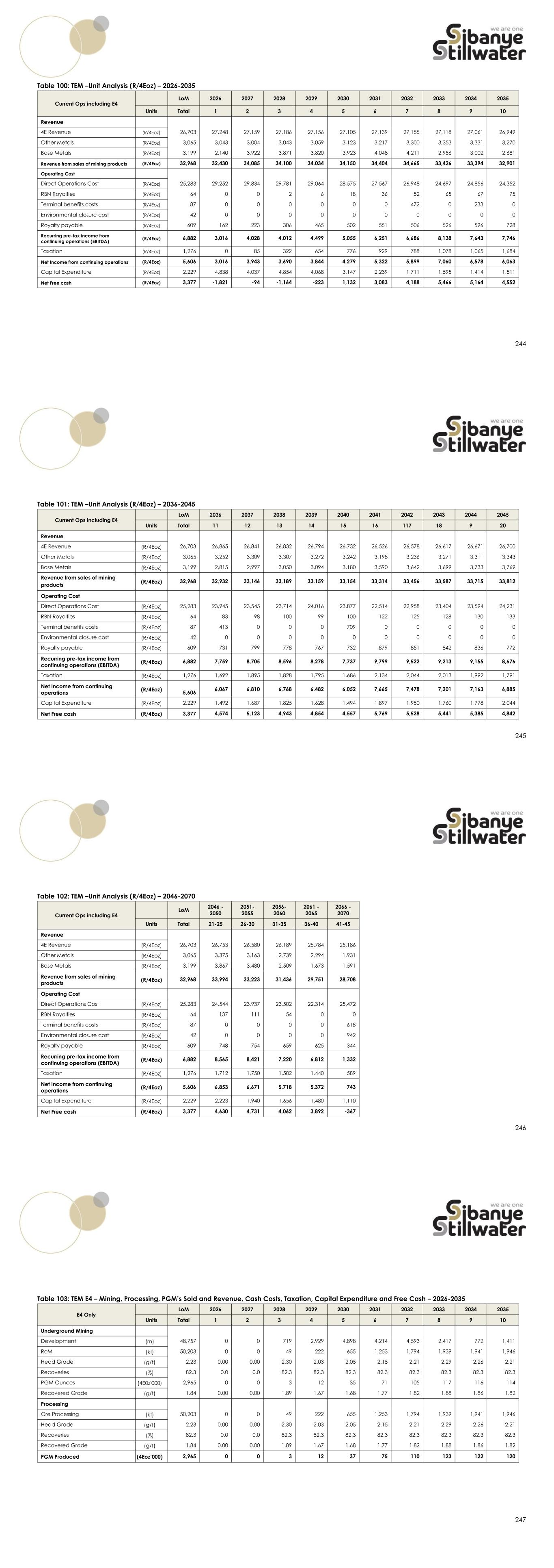 244 Table 100: TEM –Unit Analysis (R/4Eoz) – 2026-2035 Current Ops including E4 LoM 2026 2027 2028 2029 2030 2031 2032 2033 2034 2035 Units Total 1 2 3 4 5 6 7 8 9 10 Revenue 4E Revenue (R/4Eoz) 26,703 27,248 27,159 27,186 27,156 27,105 27,139 27,155 27,118 27,061 26,949 Other Metals (R/4Eoz) 3,065 3,043 3,004 3,043 3,059 3,123 3,217 3,300 3,353 3,331 3,270 Base Metals (R/4Eoz) 3,199 2,140 3,922 3,871 3,820 3,923 4,048 4,211 2,956 3,002 2,681 Revenue from sales of mining products (R/4Eoz) 32,968 32,430 34,085 34,100 34,034 34,150 34,404 34,665 33,426 33,394 32,901 Operating Cost Direct Operations Cost (R/4Eoz) 25,283 29,252 29,834 29,781 29,064 28,575 27,567 26,948 24,697 24,856 24,352 RBN Royalties (R/4Eoz) 64 0 0 2 6 18 36 52 65 67 75 Terminal benefits costs (R/4Eoz) 87 0 0 0 0 0 0 472 0 233 0 Environmental closure cost (R/4Eoz) 42 0 0 0 0 0 0 0 0 0 0 Royalty payable (R/4Eoz) 609 162 223 306 465 502 551 506 526 596 728 Recurring pre-tax income from continuing operations (EBITDA) (R/4Eoz) 6,882 3,016 4,028 4,012 4,499 5,055 6,251 6,686 8,138 7,643 7,746 Taxation (R/4Eoz) 1,276 0 85 322 654 776 929 788 1,078 1,065 1,684 Net Income from continuing operations (R/4Eoz) 5,606 3,016 3,943 3,690 3,844 4,279 5,322 5,899 7,060 6,578 6,063 Capital Expenditure (R/4Eoz) 2,229 4,838 4,037 4,854 4,068 3,147 2,239 1,711 1,595 1,414 1,511 Net Free cash (R/4Eoz) 3,377 -1,821 -94 -1,164 -223 1,132 3,083 4,188 5,466 5,164 4,552 245 Table 101: TEM –Unit Analysis (R/4Eoz) – 2036-2045 Current Ops including E4 LoM 2036 2037 2038 2039 2040 2041 2042 2043 2044 2045 Units Total 11 12 13 14 15 16 117 18 9 20 Revenue 4E Revenue (R/4Eoz) 26,703 26,865 26,841 26,832 26,794 26,732 26,526 26,578 26,617 26,671 26,700 Other Metals (R/4Eoz) 3,065 3,252 3,309 3,307 3,272 3,242 3,198 3,236 3,271 3,311 3,343 Base Metals (R/4Eoz) 3,199 2,815 2,997 3,050 3,094 3,180 3,590 3,642 3,699 3,733 3,769 Revenue from sales of mining products (R/4Eoz) 32,968 32,932 33,146 33,189 33,159 33,154 33,314 33,456 33,587 33,715 33,812 Operating Cost Direct Operations Cost (R/4Eoz) 25,283 23,945 23,545 23,714 24,016 23,877 22,514 22,958 23,404 23,594 24,231 RBN Royalties (R/4Eoz) 64 83 98 100 99 100 122 125 128 130 133 Terminal benefits costs (R/4Eoz) 87 413 0 0 0 709 0 0 0 0 0 Environmental closure cost (R/4Eoz) 42 0 0 0 0 0 0 0 0 0 0 Royalty payable (R/4Eoz) 609 731 799 778 767 732 879 851 842 836 772 Recurring pre-tax income from continuing operations (EBITDA) (R/4Eoz) 6,882 7,759 8,705 8,596 8,278 7,737 9,799 9,522 9,213 9,155 8,676 Taxation (R/4Eoz) 1,276 1,692 1,895 1,828 1,795 1,686 2,134 2,044 2,013 1,992 1,791 Net Income from continuing operations (R/4Eoz) 5,606 6,067 6,810 6,768 6,482 6,052 7,665 7,478 7,201 7,163 6,885 Capital Expenditure (R/4Eoz) 2,229 1,492 1,687 1,825 1,628 1,494 1,897 1,950 1,760 1,778 2,044 Net Free cash (R/4Eoz) 3,377 4,574 5,123 4,943 4,854 4,557 5,769 5,528 5,441 5,385 4,842 246 Table 102: TEM –Unit Analysis (R/4Eoz) – 2046-2070 Current Ops including E4 LoM 2046 - 2050 2051- 2055 2056- 2060 2061 - 2065 2066 - 2070 Units Total 21-25 26-30 31-35 36-40 41-45 Revenue 4E Revenue (R/4Eoz) 26,703 26,753 26,580 26,189 25,784 25,186 Other Metals (R/4Eoz) 3,065 3,375 3,163 2,739 2,294 1,931 Base Metals (R/4Eoz) 3,199 3,867 3,480 2,509 1,673 1,591 Revenue from sales of mining products (R/4Eoz) 32,968 33,994 33,223 31,436 29,751 28,708 Operating Cost Direct Operations Cost (R/4Eoz) 25,283 24,544 23,937 23,502 22,314 25,472 RBN Royalties (R/4Eoz) 64 137 111 54 0 0 Terminal benefits costs (R/4Eoz) 87 0 0 0 0 618 Environmental closure cost (R/4Eoz) 42 0 0 0 0 942 Royalty payable (R/4Eoz) 609 748 754 659 625 344 Recurring pre-tax income from continuing operations (EBITDA) (R/4Eoz) 6,882 8,565 8,421 7,220 6,812 1,332 Taxation (R/4Eoz) 1,276 1,712 1,750 1,502 1,440 589 Net Income from continuing operations (R/4Eoz) 5,606 6,853 6,671 5,718 5,372 743 Capital Expenditure (R/4Eoz) 2,229 2,223 1,940 1,656 1,480 1,110 Net Free cash (R/4Eoz) 3,377 4,630 4,731 4,062 3,892 -367 247 Table 103: TEM E4 – Mining, Processing, PGM’s Sold and Revenue, Cash Costs, Taxation, Capital Expenditure and Free Cash – 2026-2035 E4 Only LoM 2026 2027 2028 2029 2030 2031 2032 2033 2034 2035 Units Total 1 2 3 4 5 6 7 8 9 10 Underground Mining Development (m) 48,757 0 0 719 2,929 4,898 4,214 4,593 2,417 772 1,411 RoM (kt) 50,203 0 0 49 222 655 1,253 1,794 1,939 1,941 1,946 Head Grade (g/t) 2.23 0.00 0.00 2.30 2.03 2.05 2.15 2.21 2.29 2.26 2.21 Recoveries (%) 82.3 0.0 0.0 82.3 82.3 82.3 82.3 82.3 82.3 82.3 82.3 PGM Ounces (4E0z'000) 2,965 0 0 3 12 35 71 105 117 116 114 Recovered Grade (g/t) 1.84 0.00 0.00 1.89 1.67 1.68 1.77 1.82 1.88 1.86 1.82 Processing Ore Processing (kt) 50,203 0 0 49 222 655 1,253 1,794 1,939 1,941 1,946 Head Grade (g/t) 2.23 0.00 0.00 2.30 2.03 2.05 2.15 2.21 2.29 2.26 2.21 Recoveries (%) 82.3 0.0 0.0 82.3 82.3 82.3 82.3 82.3 82.3 82.3 82.3 Recovered Grade (g/t) 1.84 0.00 0.00 1.89 1.67 1.68 1.77 1.82 1.88 1.86 1.82 PGM Produced (4Eoz’000) 2,965 0 0 3 12 37 75 110 123 122 120