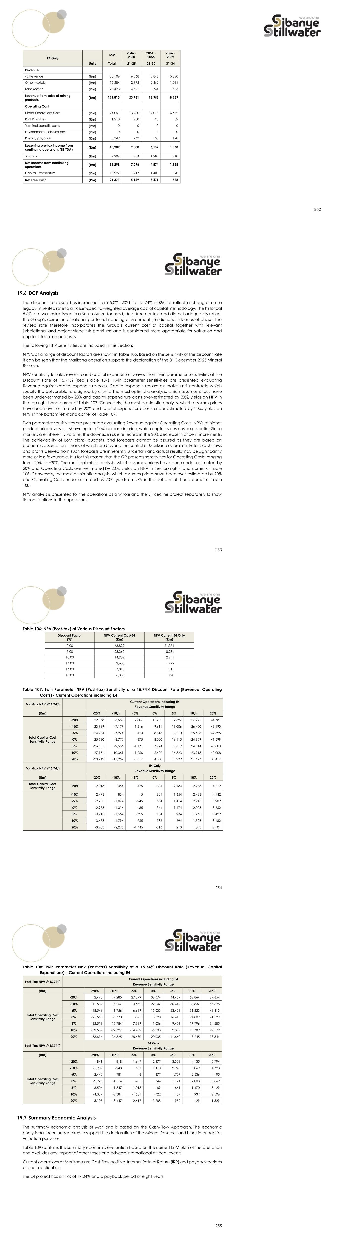 252 E4 Only LoM 2046 - 2050 2051 - 2055 2056 - 2059 Units Total 21-25 26-30 31-34 Revenue 4E Revenue (Rm) 83,106 16,268 12,846 5,620 Other Metals (Rm) 15,284 2,992 2,362 1,034 Base Metals (Rm) 23,423 4,521 3,744 1,585 Revenue from sales of mining products (Rm) 121,813 23,781 18,953 8,239 Operating Cost Direct Operations Cost (Rm) 74,051 13,780 12,073 6,669 RBN Royalties (Rm) 1,218 238 190 82 Terminal benefits costs (Rm) 0 0 0 0 Environmental closure cost (Rm) 0 0 0 0 Royalty payable (Rm) 3,342 763 533 120 Recurring pre-tax income from continuing operations (EBITDA) (Rm) 43,202 9,000 6,157 1,368 Taxation (Rm) 7,904 1,904 1,284 210 Net Income from continuing operations (Rm) 35,298 7,096 4,874 1,158 Capital Expenditure (Rm) 13,927 1,947 1,403 590 Net Free cash (Rm) 21,371 5,149 3,471 568 253 19.6 DCF Analysis The discount rate used has increased from 5.0% (2021) to 15.74% (2025) to reflect a change from a legacy, inherited rate to an asset-specific weighted average cost of capital methodology. The historical 5.0% rate was established in a South Africa-focused, debt-free context and did not adequately reflect the Group’s current international portfolio, financing environment, jurisdictional risk or asset phase. The revised rate therefore incorporates the Group’s current cost of capital together with relevant jurisdictional and project-stage risk premiums and is considered more appropriate for valuation and capital allocation purposes. The following NPV sensitivities are included in this Section: NPV’s at a range of discount factors are shown in Table 106. Based on the sensitivity of the discount rate it can be seen that the Marikana operation supports the declaration of the 31 December 2025 Mineral Reserve. NPV sensitivity to sales revenue and capital expenditure derived from twin parameter sensitivities at the Discount Rate of 15.74% (Real)(Table 107). Twin parameter sensitivities are presented evaluating Revenue against capital expenditure costs. Capital expenditures are estimates until contracts, which specify the deliverable, are signed by clients. The most optimistic analysis, which assumes prices have been under-estimated by 20% and capital expenditure costs over-estimated by 20%, yields an NPV in the top right-hand corner of Table 107. Conversely, the most pessimistic analysis, which assumes prices have been over-estimated by 20% and capital expenditure costs under-estimated by 20%, yields an NPV in the bottom left-hand corner of Table 107. Twin parameter sensitivities are presented evaluating Revenue against Operating Costs. NPVs at higher product price levels are shown up to a 20% increase in price, which captures any upside potential. Since markets are inherently volatile, the downside risk is reflected in the 20% decrease in price in increments. The achievability of LoM plans, budgets, and forecasts cannot be assured as they are based on economic assumptions, many of which are beyond the control of Marikana operation. Future cash flows and profits derived from such forecasts are inherently uncertain and actual results may be significantly more or less favourable. It is for this reason that the QP presents sensitivities for Operating Costs, ranging from -20% to +20%. The most optimistic analysis, which assumes prices have been under-estimated by 20% and Operating Costs over-estimated by 20%, yields an NPV in the top right-hand corner of Table 108. Conversely, the most pessimistic analysis, which assumes prices have been over-estimated by 20% and Operating Costs under-estimated by 20%, yields an NPV in the bottom left-hand corner of Table 108. NPV analysis is presented for the operations as a whole and the E4 decline project separately to show its contributions to the operations. 254 Table 106: NPV (Post-tax) at Various Discount Factors Discount Factor (%) NPV Current Ops+E4 (Rm) NPV Current E4 Only (Rm) 0.00 63,829 21,371 5.00 28,360 8,234 10.00 14,932 2,947 14.00 9,603 1,779 16.00 7,810 915 18.00 6,388 270 Table 107: Twin Parameter NPV (Post-tax) Sensitivity at a 15.74% Discount Rate (Revenue, Operating Costs) - Current Operations including E4 Post-Tax NPV @15.74% Current Operations including E4 Revenue Sensitivity Range (Rm) -20% -10% -5% 0% 5% 10% 20% Total Capital Cost Sensitivity Range -20% -22,378 -5,588 2,807 11,202 19,597 27,991 44,781 -10% -23,969 -7,179 1,216 9,611 18,006 26,400 43,190 -5% -24,764 -7,974 420 8,815 17,210 25,605 42,395 0% -25,560 -8,770 -375 8,020 16,415 24,809 41,599 5% -26,355 -9,566 -1,171 7,224 15,619 24,014 40,803 10% -27,151 -10,361 -1,966 6,429 14,823 23,218 40,008 20% -28,742 -11,952 -3,557 4,838 13,232 21,627 38,417 Post-Tax NPV @15.74% E4 Only Revenue Sensitivity Range (Rm) -20% -10% -5% 0% 5% 10% 20% Total Capital Cost Sensitivity Range -20% -2,013 -354 475 1,304 2,134 2,963 4,622 -10% -2,493 -834 -5 824 1,654 2,483 4,142 -5% -2,733 -1,074 -245 584 1,414 2,243 3,902 0% -2,973 -1,314 -485 344 1,174 2,003 3,662 5% -3,213 -1,554 -725 104 934 1,763 3,422 10% -3,453 -1,794 -965 -136 694 1,523 3,182 20% -3,933 -2,275 -1,445 -616 213 1,043 2,701 255 Table 108: Twin Parameter NPV (Post-tax) Sensitivity at a 15.74% Discount Rate (Revenue, Capital Expenditure) – Current Operations including E4 Post-Tax NPV @ 15.74% Current Operations including E4 Revenue Sensitivity Range (Rm) -20% -10% -5% 0% 5% 10% 20% Total Operating Cost Sensitivity Range -20% 2,495 19,285 27,679 36,074 44,469 52,864 69,654 -10% -11,532 5,257 13,652 22,047 30,442 38,837 55,626 -5% -18,546 -1,756 6,639 15,033 23,428 31,823 48,613 0% -25,560 -8,770 -375 8,020 16,415 24,809 41,599 5% -32,573 -15,784 -7,389 1,006 9,401 17,796 34,585 10% -39,587 -22,797 -14,402 -6,008 2,387 10,782 27,572 20% -53,614 -36,825 -28,430 -20,035 -11,640 -3,245 13,544 Post-Tax NPV @ 15.74% E4 Only Revenue Sensitivity Range (Rm) -20% -10% -5% 0% 5% 10% 20% Total Operating Cost Sensitivity Range -20% -841 818 1,647 2,477 3,306 4,135 5,794 -10% -1,907 -248 581 1,410 2,240 3,069 4,728 -5% -2,440 -781 48 877 1