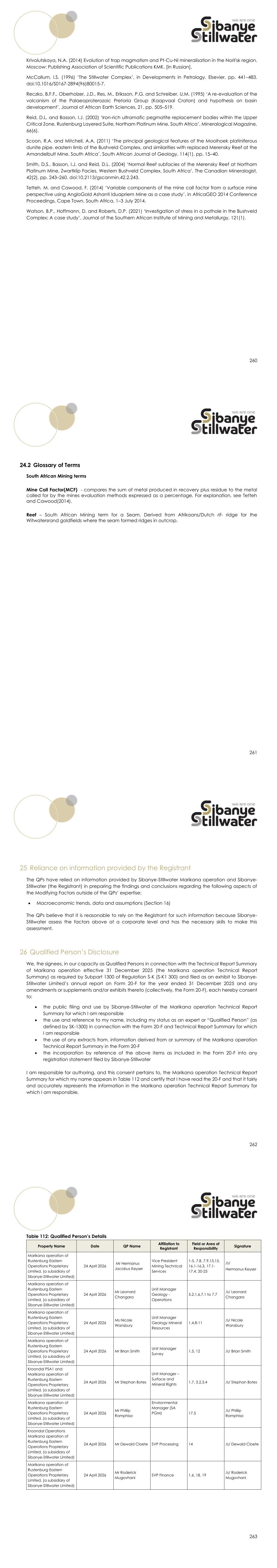 260 Krivolutskaya, N.A. (2014) Evolution of trap magmatism and Pt-Cu-Ni mineralisation in the Noril'sk region. Moscow: Publishing Association of Scientific Publications KMK. [In Russian]. McCallum, I.S. (1996) ‘The Stillwater Complex’, in Developments in Petrology. Elsevier, pp. 441–483. doi:10.1016/S0167-2894(96)80015-7. Reczko, B.F.F., Oberholzer, J.D., Res, M., Eriksson, P.G. and Schreiber, U.M. (1995) ‘A re-evaluation of the volcanism of the Palaeoproterozoic Pretoria Group (Kaapvaal Craton) and hypothesis on basin development’, Journal of African Earth Sciences, 21, pp. 505–519. Reid, D.L. and Basson, I.J. (2002) ‘Iron-rich ultramafic pegmatite replacement bodies within the Upper Critical Zone, Rustenburg Layered Suite, Northam Platinum Mine, South Africa’, Mineralogical Magazine, 66(6). Scoon, R.A. and Mitchell, A.A. (2011) ‘The principal geological features of the Mooihoek platiniferous dunite pipe, eastern limb of the Bushveld Complex, and similarities with replaced Merensky Reef at the Amandelbult Mine, South Africa’, South African Journal of Geology, 114(1), pp. 15–40. Smith, D.S., Basson, I.J. and Reid, D.L. (2004) ‘Normal Reef subfacies of the Merensky Reef at Northam Platinum Mine, Zwartklip Facies, Western Bushveld Complex, South Africa’, The Canadian Mineralogist, 42(2), pp. 243–260. doi:10.2113/gscanmin.42.2.243. Tetteh, M. and Cawood, F. (2014) ‘Variable components of the mine call factor from a surface mine perspective using AngloGold Ashanti Iduapriem Mine as a case study’, in AfricaGEO 2014 Conference Proceedings, Cape Town, South Africa, 1–3 July 2014. Watson, B.P., Hoffmann, D. and Roberts, D.P. (2021) ‘Investigation of stress in a pothole in the Bushveld Complex: A case study’, Journal of the Southern African Institute of Mining and Metallurgy, 121(1). 261 24.2 Glossary of Terms South African Mining terms Mine Call Factor(MCF) - compares the sum of metal produced in recovery plus residue to the metal called for by the mines evaluation methods expressed as a percentage. For explanation, see Tetteh and Cawood(2014). Reef – South African Mining term for a Seam. Derived from Afrikaans/Dutch rif- ridge for the Witwatersrand goldfields where the seam formed ridges in outcrop. 262 25 Reliance on information provided by the Registrant The QPs have relied on information provided by Sibanye-Stillwater Marikana operation and Sibanye- Stillwater (the Registrant) in preparing the findings and conclusions regarding the following aspects of the Modifying Factors outside of the QPs’ expertise: • Macroeconomic trends, data and assumptions (Section 16) The QPs believe that it is reasonable to rely on the Registrant for such information because Sibanye- Stillwater assess the factors above at a corporate level and has the necessary skills to make this assessment. 26 Qualified Person’s Disclosure We, the signees, in our capacity as Qualified Persons in connection with the Technical Report Summary of Marikana operation effective 31 December 2025 (the Marikana operation Technical Report Summary) as required by Subpart 1300 of Regulation S-K (S-K1 300) and filed as an exhibit to Sibanye- Stillwater Limited’s annual report on Form 20-F for the year ended 31 December 2025 and any amendments or supplements and/or exhibits thereto (collectively, the Form 20-F), each hereby consent to: • the public filing and use by Sibanye-Stillwater of the Marikana operation Technical Report Summary for which I am responsible • the use and reference to my name, including my status as an expert or “Qualified Person” (as defined by SK-1300) in connection with the Form 20-F and Technical Report Summary for which I am responsible • the use of any extracts from, information derived from or summary of the Marikana operation Technical Report Summary in the Form 20-F • the incorporation by reference of the above items as included in the Form 20-F into any registration statement filed by Sibanye-Stillwater I am responsible for authoring, and this consent pertains to, the Marikana operation Technical Report Summary for which my name appears in Table 112 and certify that I have read the 20-F and that it fairly and accurately represents the information in the Marikana operation Technical Report Summary for which I am responsible. 263 Table 112: Qualified Person’s Details Property Name Date QP Name Affiliation to Registrant Field or Area of Responsibility Signature Marikana operation of Rustenburg Eastern Operations Proprietary Limited, (a subsidiary of Sibanye-Stillwater Limited) 24 April 2026 Mr Hermanus Jacobus Keyser Vice President Mining Technical Services 1-5, 7.8, 7.9,13,15, 16.1-16.3, 17.1- 17.4, 20-25 /s/ Hermanus Keyser Marikana operation of Rustenburg Eastern Operations Proprietary Limited, (a subsidiary of Sibanye-Stillwater Limited) 24 April 2026 Mr Leonard Changara Unit Manager Geology - Operations 5.2.1,6,7.1 to 7.7 /s/ Leonard Changara Marikana operation of Rustenburg Eastern Operations Proprietary Limited, (a subsidiary of Sibanye-Stillwater Limited) 24 April 2026 Ms Nicole Wansbury Unit Manager Geology Mineral Resources 1.4,8-11 /s/ Nicole Wansbury Marikana operation of Rustenburg Eastern Operations Proprietary Limited, (a subsidiary of Sibanye-Stillwater Limited) 24 April 2026 Mr Brian Smith Unit Manager Survey 1.5, 12 /s/ Brian Smith Kroondal PSA1 and Marikana operation of Rustenburg Eastern Operations Proprietary Limited, (a subsidiary of Sibanye-Stillwater Limited) 24 April 2026 Mr Stephan Botes Unit Manager – Surface and Mineral Rights 1.7, 3.2,3.4 /s/ Stephan Botes Marikana operation of Rustenburg Eastern Operations Proprietary Limited, (a subsidiary of Sibanye-Stillwater Limited) 24 April 2026 Mr Phillip Ramphisa Environmental Manager (SA PGM) 17.5 /s/ Phillip Ramphisa Kroondal Operations Marikana operation of Rustenburg Eastern Operations Proprietary Limited, (a subsidiary of Sibanye-Stillwater Limited) 24 April 2026 Mr Dewald Cloet