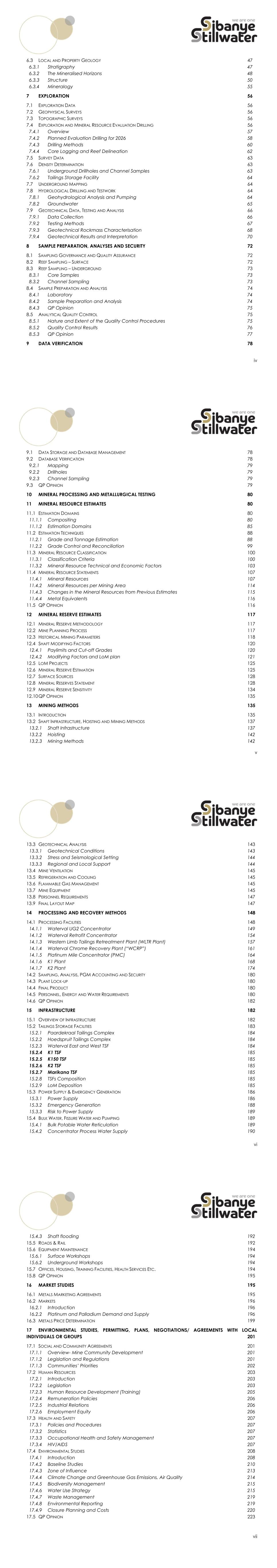 iv 6.3 LOCAL AND PROPERTY GEOLOGY 47 6.3.1 Stratigraphy 47 6.3.2 The Mineralised Horizons 48 6.3.3 Structure 50 6.3.4 Mineralogy 55 7 EXPLORATION 56 7.1 EXPLORATION DATA 56 7.2 GEOPHYSICAL SURVEYS 56 7.3 TOPOGRAPHIC SURVEYS 56 7.4 EXPLORATION AND MINERAL RESOURCE EVALUATION DRILLING 56 7.4.1 Overview 57 7.4.2 Planned Evaluation Drilling for 2026 58 7.4.3 Drilling Methods 60 7.4.4 Core Logging and Reef Delineation 62 7.5 SURVEY DATA 63 7.6 DENSITY DETERMINATION 63 7.6.1 Underground Drillholes and Channel Samples 63 7.6.2 Tailings Storage Facility 64 7.7 UNDERGROUND MAPPING 64 7.8 HYDROLOGICAL DRILLING AND TESTWORK 64 7.8.1 Geohydrological Analysis and Pumping 64 7.8.2 Groundwater 65 7.9 GEOTECHNICAL DATA, TESTING AND ANALYSIS 66 7.9.1 Data Collection 66 7.9.2 Testing Methods 67 7.9.3 Geotechnical Rockmass Characterisation 68 7.9.4 Geotechnical Results and Interpretation 70 8 SAMPLE PREPARATION, ANALYSES AND SECURITY 72 8.1 SAMPLING GOVERNANCE AND QUALITY ASSURANCE 72 8.2 REEF SAMPLING – SURFACE 72 8.3 REEF SAMPLING – UNDERGROUND 73 8.3.1 Core Samples 73 8.3.2 Channel Sampling 73 8.4 SAMPLE PREPARATION AND ANALYSIS 74 8.4.1 Laboratory 74 8.4.2 Sample Preparation and Analysis 74 8.4.3 QP Opinion 75 8.5 ANALYTICAL QUALITY CONTROL 75 8.5.1 Nature and Extent of the Quality Control Procedures 75 8.5.2 Quality Control Results 76 8.5.3 QP Opinion 77 9 DATA VERIFICATION 78 v 9.1 DATA STORAGE AND DATABASE MANAGEMENT 78 9.2 DATABASE VERIFICATION 78 9.2.1 Mapping 79 9.2.2 Drillholes 79 9.2.3 Channel Sampling 79 9.3 QP OPINION 79 10 MINERAL PROCESSING AND METALLURGICAL TESTING 80 11 MINERAL RESOURCE ESTIMATES 80 11.1 ESTIMATION DOMAINS 80 11.1.1 Compositing 80 11.1.2 Estimation Domains 85 11.2 ESTIMATION TECHNIQUES 88 11.2.1 Grade and Tonnage Estimation 88 11.2.2 Grade Control and Reconciliation 99 11.3 MINERAL RESOURCE CLASSIFICATION 100 11.3.1 Classification Criteria 100 11.3.2 Mineral Resource Technical and Economic Factors 103 11.4 MINERAL RESOURCE STATEMENTS 107 11.4.1 Mineral Resources 107 11.4.2 Mineral Resources per Mining Area 114 11.4.3 Changes in the Mineral Resources from Previous Estimates 115 11.4.4 Metal Equivalents 116 11.5 QP OPINION 116 12 MINERAL RESERVE ESTIMATES 117 12.1 MINERAL RESERVE METHODOLOGY 117 12.2 MINE PLANNING PROCESS 117 12.3 HISTORICAL MINING PARAMETERS 118 12.4 SHAFT MODIFYING FACTORS 120 12.4.1 Paylimits and Cut-off Grades 120 12.4.2 Modifying Factors and LoM plan 121 12.5 LOM PROJECTS 125 12.6 MINERAL RESERVE ESTIMATION 125 12.7 SURFACE SOURCES 128 12.8 MINERAL RESERVES STATEMENT 128 12.9 MINERAL RESERVE SENSITIVITY 134 12.10 QP OPINION 135 13 MINING METHODS 135 13.1 INTRODUCTION 135 13.2 SHAFT INFRASTRUCTURE, HOISTING AND MINING METHODS 137 13.2.1 Shaft Infrastructure 137 13.2.2 Hoisting 142 13.2.3 Mining Methods 142 vi 13.3 GEOTECHNICAL ANALYSIS 143 13.3.1 Geotechnical Conditions 143 13.3.2 Stress and Seismological Setting 144 13.3.3 Regional and Local Support 144 13.4 MINE VENTILATION 145 13.5 REFRIGERATION AND COOLING 145 13.6 FLAMMABLE GAS MANAGEMENT 145 13.7 MINE EQUIPMENT 145 13.8 PERSONNEL REQUIREMENTS 147 13.9 FINAL LAYOUT MAP 147 14 PROCESSING AND RECOVERY METHODS 148 14.1 PROCESSING FACILITIES 148 14.1.1 Waterval UG2 Concentrator 149 14.1.2 Waterval Retrofit Concentrator 154 14.1.3 Western Limb Tailings Retreatment Plant (WLTR Plant) 157 14.1.4 Waterval Chrome Recovery Plant (“WCRP”) 161 14.1.5 Platinum Mile Concentrator (PMC) 164 14.1.6 K1 Plant 168 14.1.7 K2 Plant 174 14.2 SAMPLING, ANALYSIS, PGM ACCOUNTING AND SECURITY 180 14.3 PLANT LOCK-UP 180 14.4 FINAL PRODUCT 180 14.5 PERSONNEL, ENERGY AND WATER REQUIREMENTS 180 14.6 QP OPINION 182 15 INFRASTRUCTURE 182 15.1 OVERVIEW OF INFRASTRUCTURE 182 15.2 TAILINGS STORAGE FACILITIES 183 15.2.1 Paardekraal Tailings Complex 184 15.2.2 Hoedspruit Tailings Complex 184 15.2.3 Waterval East and West TSF 184 15.2.4 K1 TSF 185 15.2.5 K150 TSF 185 15.2.6 K2 TSF 185 15.2.7 Marikana TSF 185 15.2.8 TSFs Composition 185 15.2.9 LoM Deposition 185 15.3 POWER SUPPLY & EMERGENCY GENERATION 186 15.3.1 Power Supply 186 15.3.2 Emergency Generation 188 15.3.3 Risk to Power Supply 189 15.4 BULK WATER, FISSURE WATER AND PUMPING 189 15.4.1 Bulk Potable Water Reticulation 189 15.4.2 Concentrator Process Water Supply 190 vii 15.4.3 Shaft flooding 192 15.5 ROADS & RAIL 192 15.6 EQUIPMENT MAINTENANCE 194 15.6.1 Surface Workshops 194 15.6.2 Underground Workshops 194 15.7 OFFICES, HOUSING, TRAINING FACILITIES, HEALTH SERVICES ETC. 194 15.8 QP OPINION 195 16 MARKET STUDIES 195 16.1 METALS MARKETING AGREEMENTS 195 16.2 MARKETS 196 16.2.1 Introduction 196 16.2.2 Platinum and Palladium Demand and Supply 196 16.3 METALS PRICE DETERMINATION 199 17 ENVIRONMENTAL STUDIES, PERMITTING, PLANS, NEGOTIATIONS/ AGREEMENTS WITH LOCAL INDIVIDUALS OR GROUPS 201 17.1 SOCIAL AND COMMUNITY AGREEMENTS 201 17.1.1 Overview- Mine Community Development 201 17.1.2 Legislation and Regulations 201 17.1.3 Communities’ Priorities 202 17.2 HUMAN RESOURCES 203 17.2.1 Introduction 203 17.2.2 Legislation 203 17.2.3 Human Resource Development (Training) 205 17.2.4 Remuneration Policies 206 17.2.5 Industrial Relations 206 17.2.6 Employment Equity 206 17.3 HEALTH AND SAFETY 207 17.3.1 Policies and Procedures 207 17.3.2 Statistics 207 17.3.3 Occupational Health and Safety Management 207 17.3.4 HIV/AIDS 207 17.4 ENVIRONMENTAL STUDIES 208 17.4.1 Introduction 208 17.4.2 Baseline Studies 210 17.4.3 Zone of Influence 213 17.4.4 Climate Change and Greenhouse Gas Emissions, Air Quality 214 17.4.5 Biodiversity Management 215 17.4.6 Water Use Strategy 215 17.4.7 Waste Management 219 17.4.8 Environmental Reporting 219 17.4.9 Closure Planning and Costs 220 17.5 QP OPINION 223