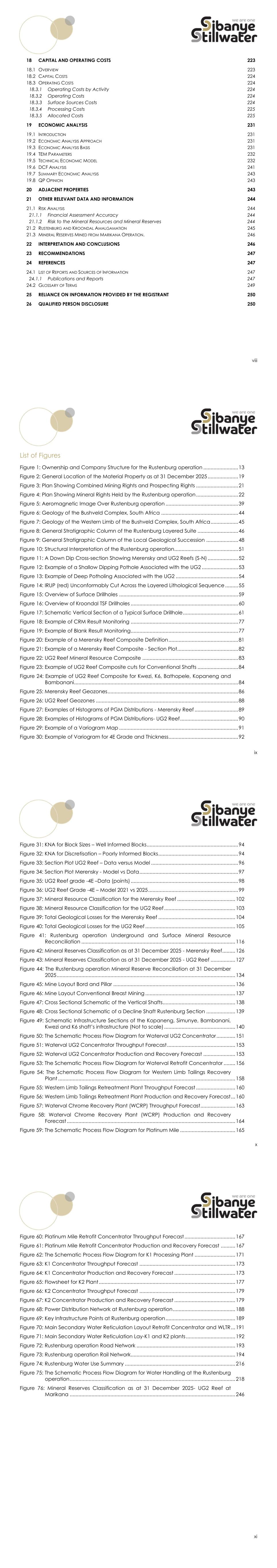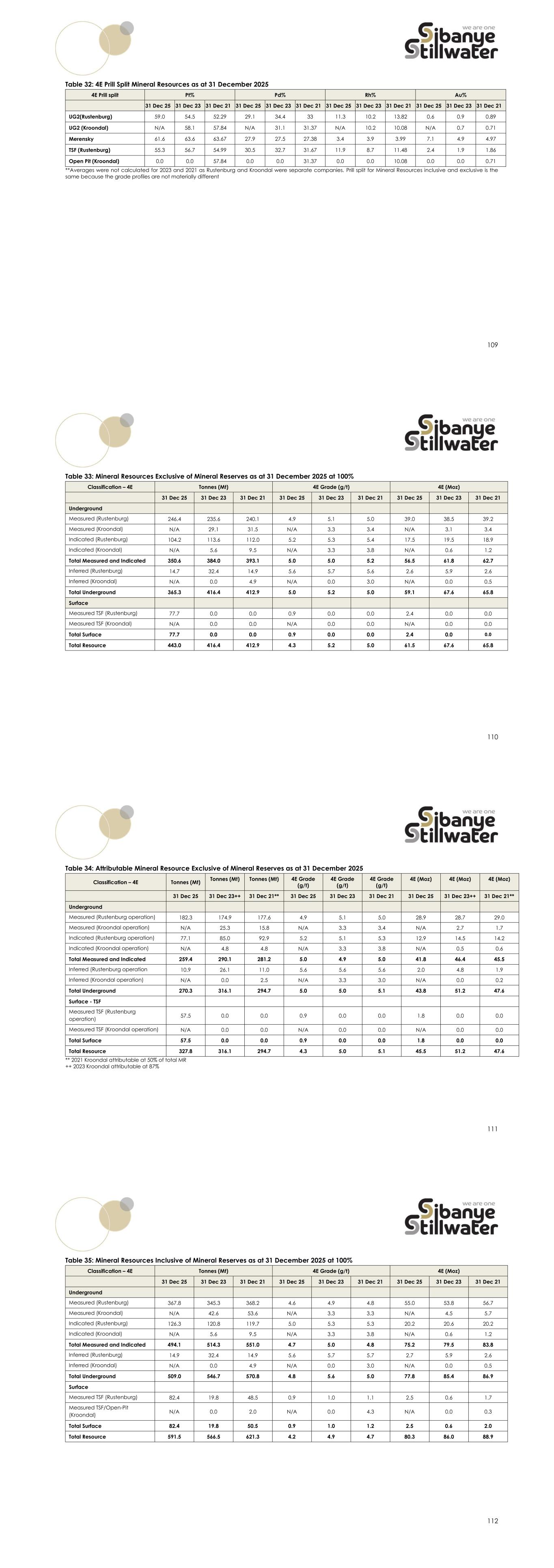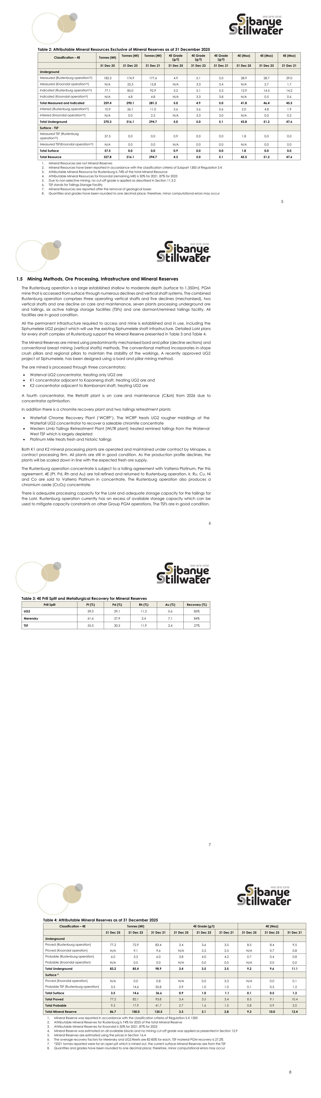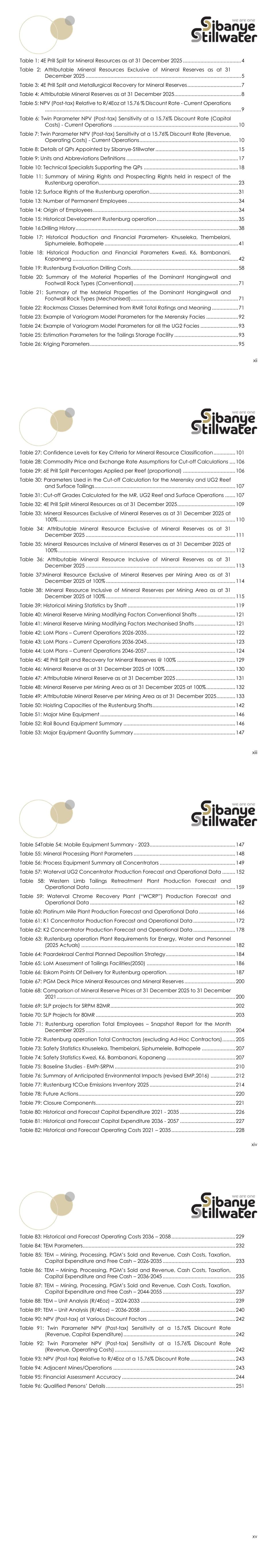 xii Table 1: 4E Prill Split for Mineral Resources as at 31 December 2025 ........................................ 4 Table 2: Attributable Mineral Resources Exclusive of Mineral Reserves as at 31 December 2025 ........................................................................................................... 5 Table 3: 4E Prill Split and Metallurgical Recovery for Mineral Reserves ..................................... 7 Table 4: Attributable Mineral Reserves as at 31 December 2025 .............................................. 8 Table 5: NPV (Post-tax) Relative to R/4Eoz at 15.76 % Discount Rate - Current Operations ....................................................................................................................................... 9 Table 6: Twin Parameter NPV (Post-tax) Sensitivity at a 15.76% Discount Rate (Capital Costs) - Current Operations ...................................................................................... 10 Table 7: Twin Parameter NPV (Post-tax) Sensitivity at a 15.76% Discount Rate (Revenue, Operating Costs) - Current Operations .................................................................... 10 Table 8: Details of QPs Appointed by Sibanye-Stillwater ......................................................... 15 Table 9: Units and Abbreviations Definitions ............................................................................. 17 Table 10: Technical Specialists Supporting the QPs ................................................................. 18 Table 11: Summary of Mining Rights and Prospecting Rights held in respect of the Rustenburg operation................................................................................................ 23 Table 12: Surface Rights of the Rustenburg operation ............................................................. 31 Table 13: Number of Permanent Employees ............................................................................ 34 Table 14: Origin of Employees .................................................................................................... 34 Table 15: Historical Development Rustenburg operation ........................................................ 35 Table 16:Drilling History ................................................................................................................ 38 Table 17: Historical Production and Financial Parameters- Khuseleka, Thembelani, Siphumelele, Bathopele ............................................................................................ 41 Table 18: Historical Production and Financial Parameters Kwezi, K6, Bambanani, Kopaneng .................................................................................................................. 42 Table 19: Rustenburg Evaluation Drilling Costs.......................................................................... 58 Table 20: Summary of the Material Properties of the Dominant Hangingwall and Footwall Rock Types (Conventional) ........................................................................ 71 Table 21: Summary of the Material Properties of the Dominant Hangingwall and Footwall Rock Types (Mechanised).......................................................................... 71 Table 22: Rockmass Classes Determined from RMR Total Ratings and Meaning .................. 71 Table 23: Example of Variogram Model Parameters for the Merensky Facies ...................... 92 Table 24: Example of Variogram Model Parameters for all the UG2 Facies .......................... 93 Table 25: Estimation Parameters for the Tailings Storage Facility ............................................ 93 Table 26: Kriging Parameters ...................................................................................................... 95 xiii Table 27: Confidence Levels for Key Criteria for Mineral Resource Classification ............... 101 Table 28: Commodity Price and Exchange Rate Assumptions for Cut-off Calculations .... 106 Table 29: 6E Prill Split Percentages Applied per Reef (proportional) .................................... 106 Table 30: Parameters Used in the Cut-off Calculation for the Merensky and UG2 Reef and Surface Tailings ................................................................................................. 107 Table 31: Cut-off Grades Calculated for the MR, UG2 Reef and Surface Operations ....... 107 Table 32: 4E Prill Split Mineral Resources as at 31 December 2025 ........................................ 109 Table 33: Mineral Resources Exclusive of Mineral Reserves as at 31 December 2025 at 100% .......................................................................................................................... 110 Table 34: Attributable Mineral Resource Exclusive of Mineral Reserves as at 31 December 2025 ....................................................................................................... 111 Table 35: Mineral Resources Inclusive of Mineral Reserves as at 31 December 2025 at 100% .......................................................................................................................... 112 Table 36: Attributable Mineral Resource Inclusive of Mineral Reserves as at 31 December 2025 ....................................................................................................... 113 Table 37:Mineral Resource Exclusive of Mineral Reserves per Mining Area as at 31 December 2025 at 100% ......................................................................................... 114 Table 38: Mineral Resource Inclusive of Mineral Reserves per Mining Area as at 31 December 2025 at 100% ......................................................................................... 115 Table 39: Historical Mining Statistics by Shaft .......................................................................... 119 Table 40: Mineral Reserve Mining Modifying Factors Conventional Shafts .......................... 121 Table 41: Mineral