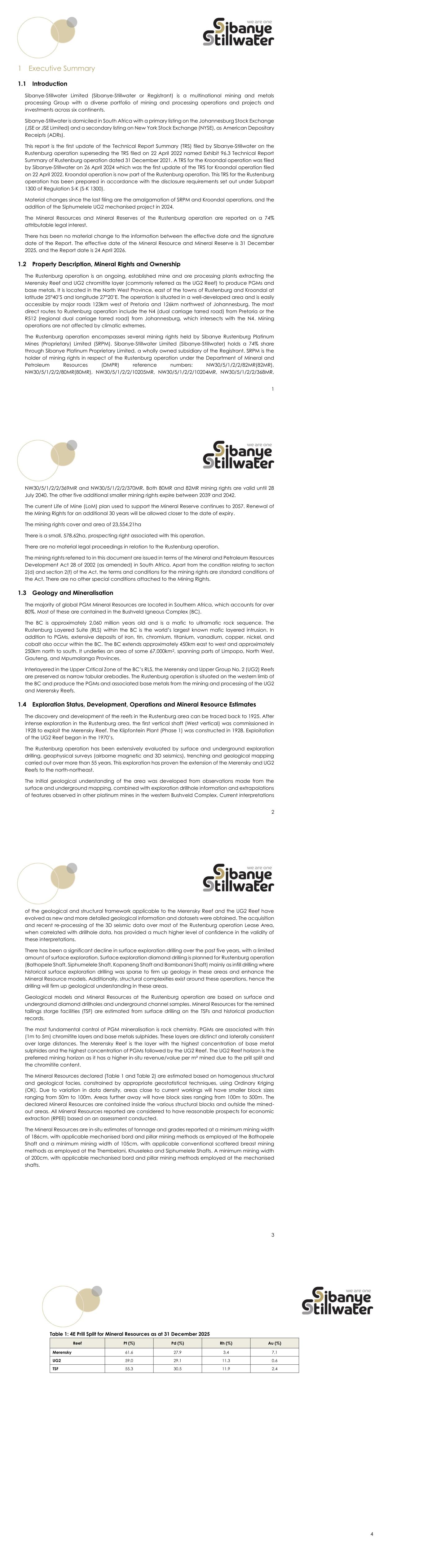1 1 Executive Summary 1.1 Introduction Sibanye-Stillwater Limited (Sibanye-Stillwater or Registrant) is a multinational mining and metals processing Group with a diverse portfolio of mining and processing operations and projects and investments across six continents. Sibanye-Stillwater is domiciled in South Africa with a primary listing on the Johannesburg Stock Exchange (JSE or JSE Limited) and a secondary listing on New York Stock Exchange (NYSE), as American Depositary Receipts (ADRs). This report is the first update of the Technical Report Summary (TRS) filed by Sibanye-Stillwater on the Rustenburg operation superseding the TRS filed on 22 April 2022 named Exhibit 96.3 Technical Report Summary of Rustenburg operation dated 31 December 2021. A TRS for the Kroondal operation was filed by Sibanye-Stillwater on 26 April 2024 which was the first update of the TRS for Kroondal operation filed on 22 April 2022. Kroondal operation is now part of the Rustenburg operation. This TRS for the Rustenburg operation has been prepared in accordance with the disclosure requirements set out under Subpart 1300 of Regulation S-K (S-K 1300). Material changes since the last filing are the amalgamation of SRPM and Kroondal operations, and the addition of the Siphumelele UG2 mechanised project in 2024. The Mineral Resources and Mineral Reserves of the Rustenburg operation are reported on a 74% attributable legal interest. There has been no material change to the information between the effective date and the signature date of the Report. The effective date of the Mineral Resource and Mineral Reserve is 31 December 2025, and the Report date is 24 April 2026. 1.2 Property Description, Mineral Rights and Ownership The Rustenburg operation is an ongoing, established mine and ore processing plants extracting the Merensky Reef and UG2 chromitite layer (commonly referred as the UG2 Reef) to produce PGMs and base metals. It is located in the North West Province, east of the towns of Rustenburg and Kroondal at latitude 25°40’S and longitude 27°20’E. The operation is situated in a well-developed area and is easily accessible by major roads 123km west of Pretoria and 126km northwest of Johannesburg. The most direct routes to Rustenburg operation include the N4 (dual carriage tarred road) from Pretoria or the R512 (regional dual carriage tarred road) from Johannesburg, which intersects with the N4. Mining operations are not affected by climatic extremes. The Rustenburg operation encompasses several mining rights held by Sibanye Rustenburg Platinum Mines (Proprietary) Limited (SRPM). Sibanye-Stillwater Limited (Sibanye-Stillwater) holds a 74% share through Sibanye Platinum Proprietary Limited, a wholly owned subsidiary of the Registrant. SRPM is the holder of mining rights in respect of the Rustenburg operation under the Department of Mineral and Petroleum Resources (DMPR) reference numbers: NW30/5/1/2/2/82MR(82MR), NW30/5/1/2/2/80MR(80MR), NW30/5/1/2/2/10205MR, NW30/5/1/2/2/10204MR, NW30/5/1/2/2/368MR, 2 NW30/5/1/2/2/369MR and NW30/5/1/2/2/370MR. Both 80MR and 82MR mining rights are valid until 28 July 2040. The other five additional smaller mining rights expire between 2039 and 2042. The current Life of Mine (LoM) plan used to support the Mineral Reserve continues to 2057. Renewal of the Mining Rights for an additional 30 years will be allowed closer to the date of expiry. The mining rights cover and area of 23,554.21ha There is a small, 578.62ha, prospecting right associated with this operation. There are no material legal proceedings in relation to the Rustenburg operation. The mining rights referred to in this document are issued in terms of the Mineral and Petroleum Resources Development Act 28 of 2002 (as amended) in South Africa. Apart from the condition relating to section 2(d) and section 2(f) of the Act, the terms and conditions for the mining rights are standard conditions of the Act. There are no other special conditions attached to the Mining Rights. 1.3 Geology and Mineralisation The majority of global PGM Mineral Resources are located in Southern Africa, which accounts for over 80%. Most of these are contained in the Bushveld Igneous Complex (BC). The BC is approximately 2,060 million years old and is a mafic to ultramafic rock sequence. The Rustenburg Layered Suite (RLS) within the BC is the world’s largest known mafic layered intrusion. In addition to PGMs, extensive deposits of iron, tin, chromium, titanium, vanadium, copper, nickel, and cobalt also occur within the BC. The BC extends approximately 450km east to west and approximately 250km north to south. It underlies an area of some 67,000km2, spanning parts of Limpopo, North West, Gauteng, and Mpumalanga Provinces. Interlayered in the Upper Critical Zone of the BC’s RLS, the Merensky and Upper Group No. 2 (UG2) Reefs are preserved as narrow tabular orebodies. The Rustenburg operation is situated on the western limb of the BC and produce the PGMs and associated base metals from the mining and processing of the UG2 and Merensky Reefs. 1.4 Exploration Status, Development, Operations and Mineral Resource Estimates The discovery and development of the reefs in the Rustenburg area can be traced back to 1925. After intense exploration in the Rustenburg area, the first vertical shaft (West vertical) was commissioned in 1928 to exploit the Merensky Reef. The Klipfontein Plant (Phase 1) was constructed in 1928. Exploitation of the UG2 Reef began in the 1970’s. The Rustenburg operation has been extensively evaluated by surface and underground exploration drilling, geophysical surveys (airborne magnetic and 3D seismics), trenching and geological mapping carried out over more than 55 years. This exploration has proven the extension of the Merensky and UG2 Reefs to the north-northeast. The Initial geological understanding of the area was developed from observations made from the surface and underground mapping, combined with exploration drillhole info